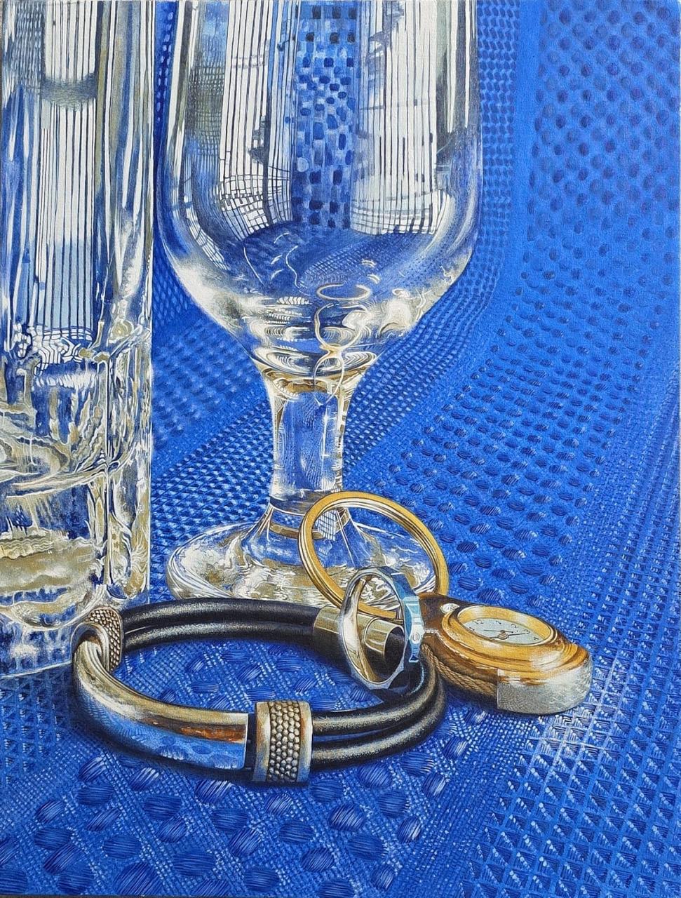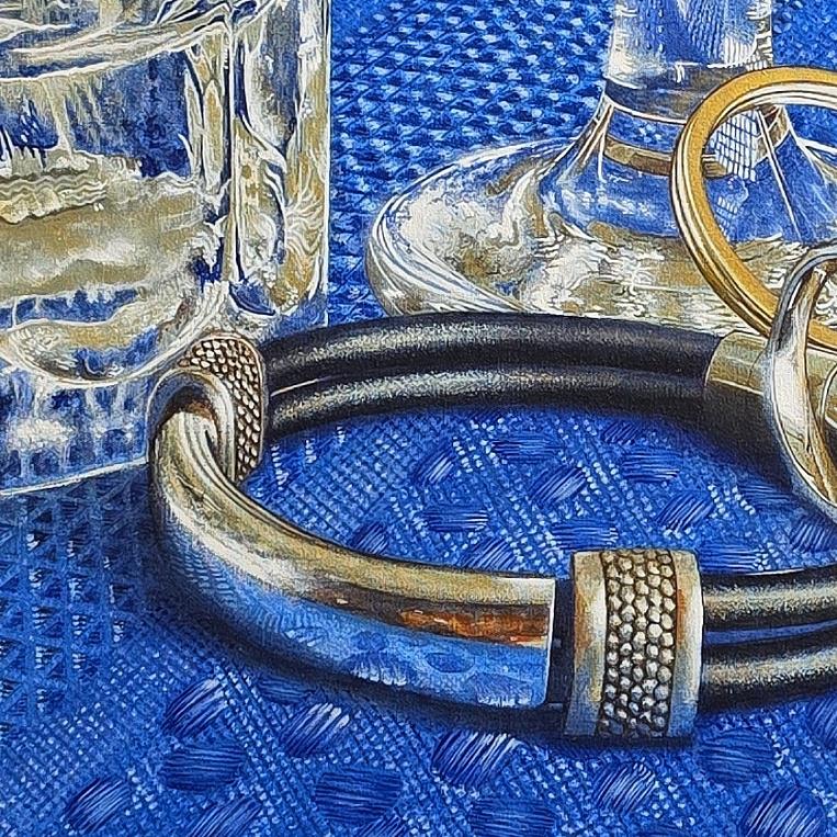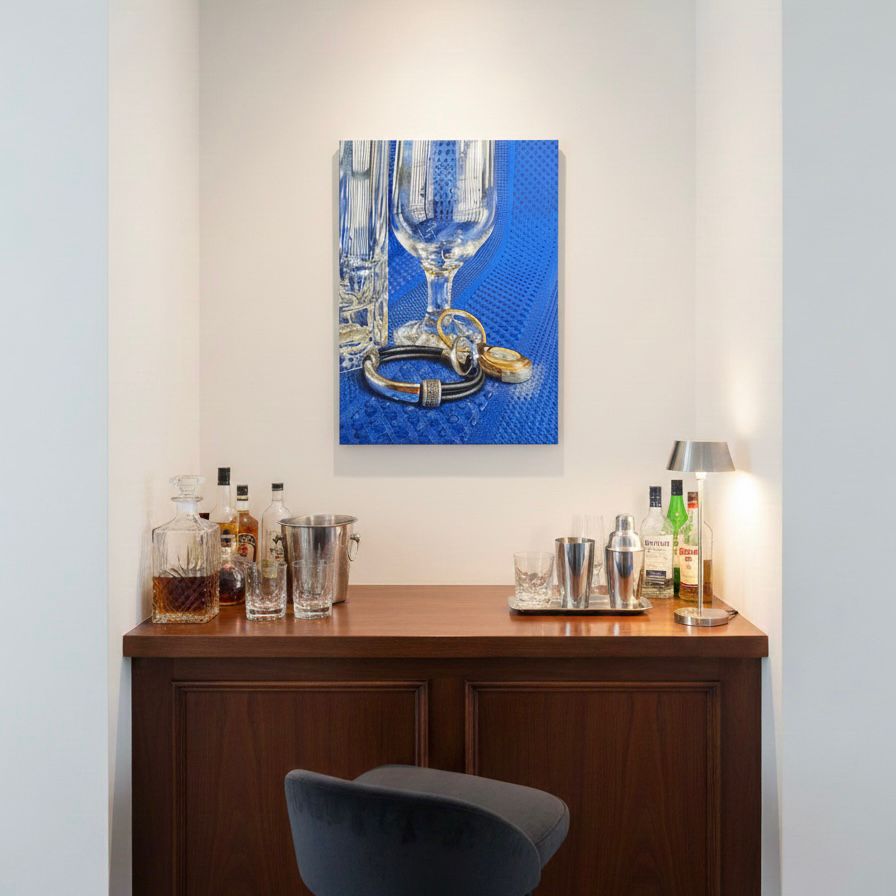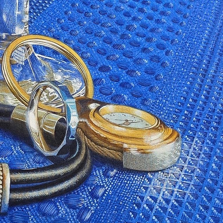 La composición con fondo azul intenso domina el espacio visual, evocados serenidad y profundidad, mientras resaltan los brillos metálicos y vitreos de los objetos. Éstos son protagonistas de un instante detenido en el tiempo.