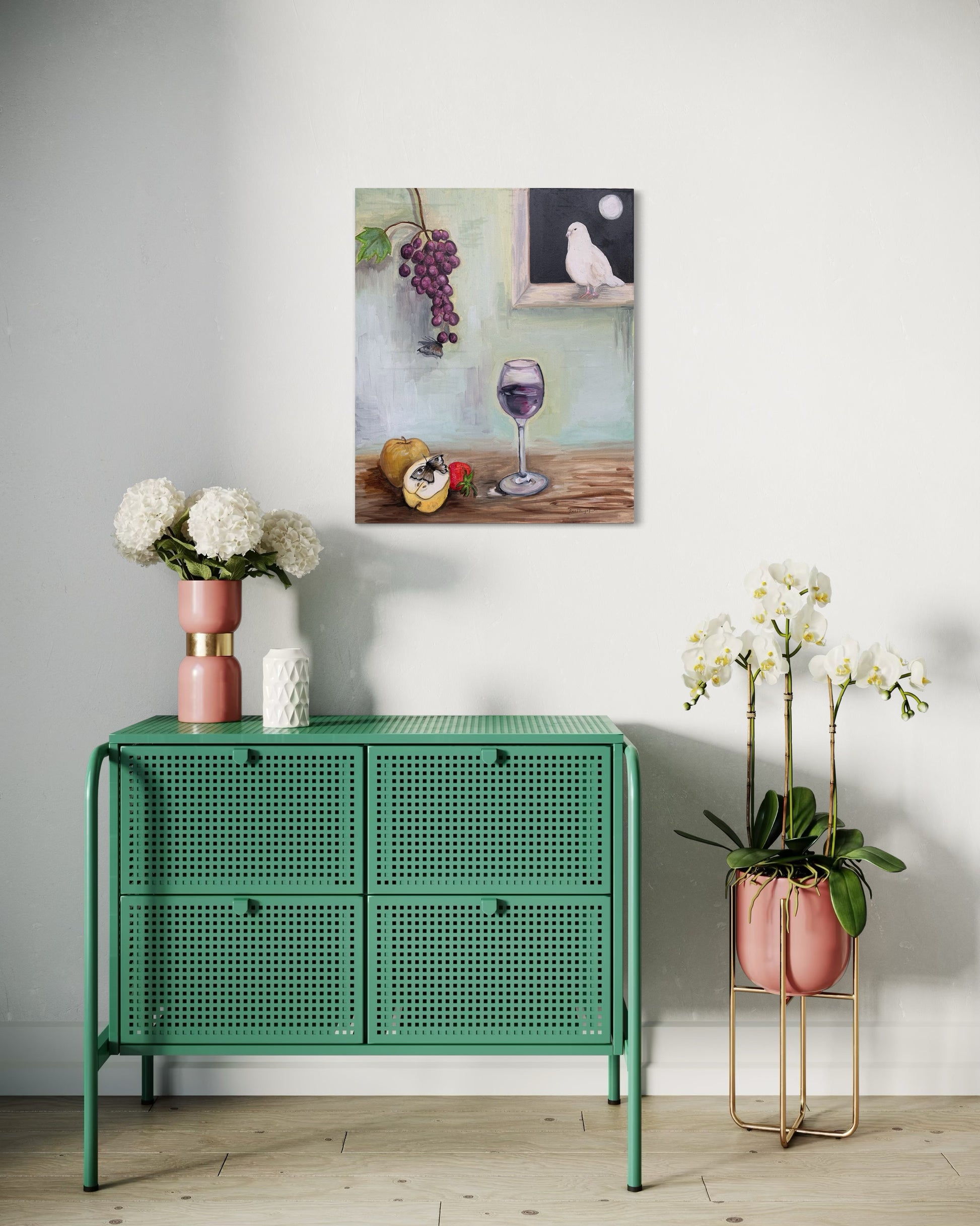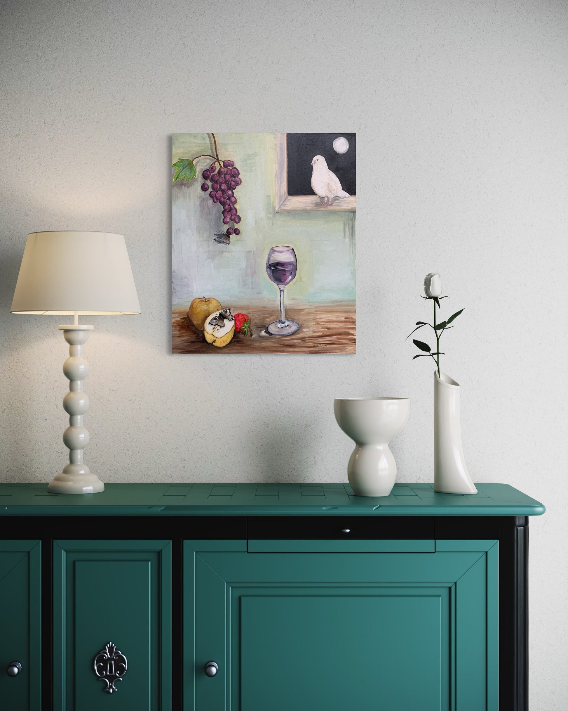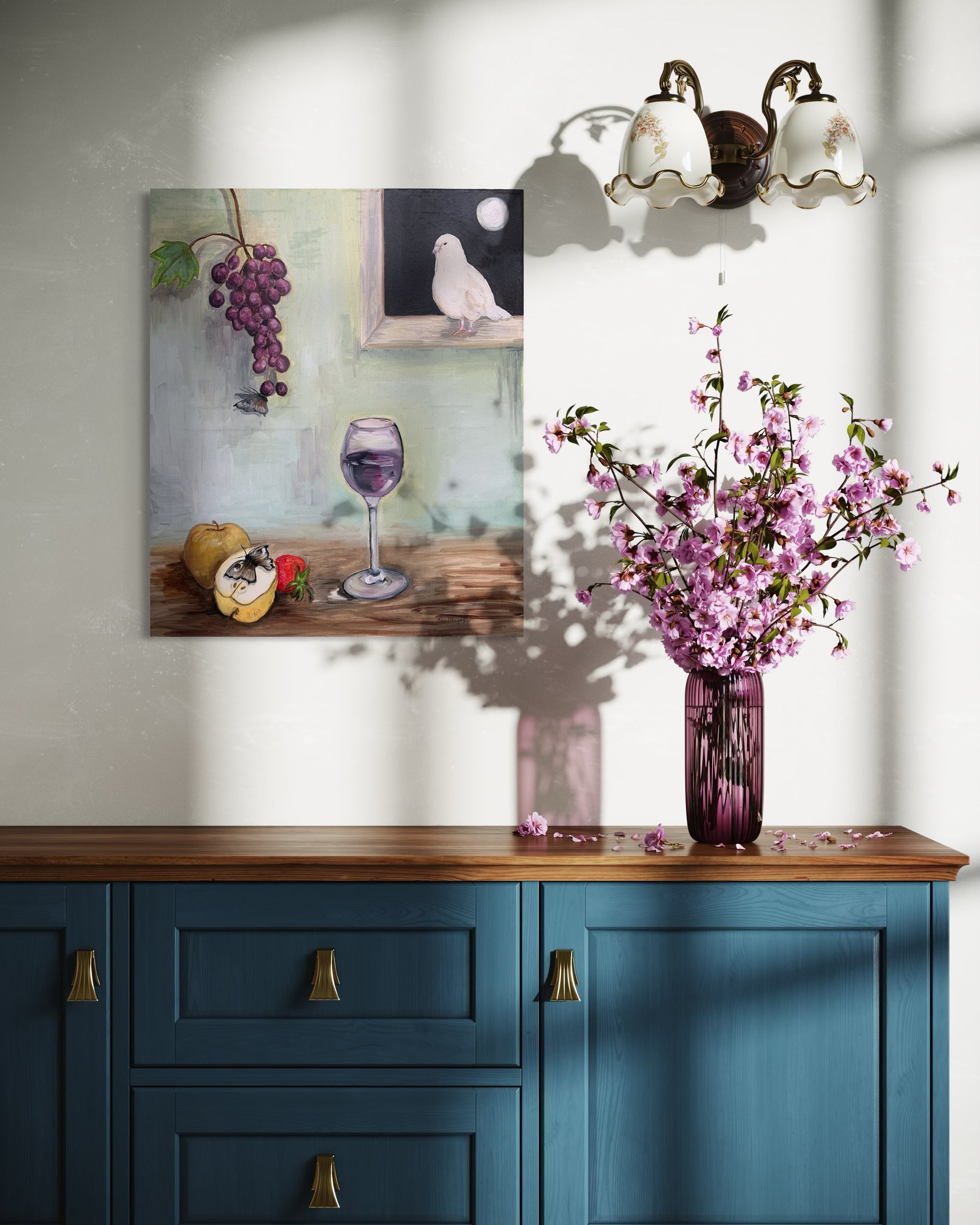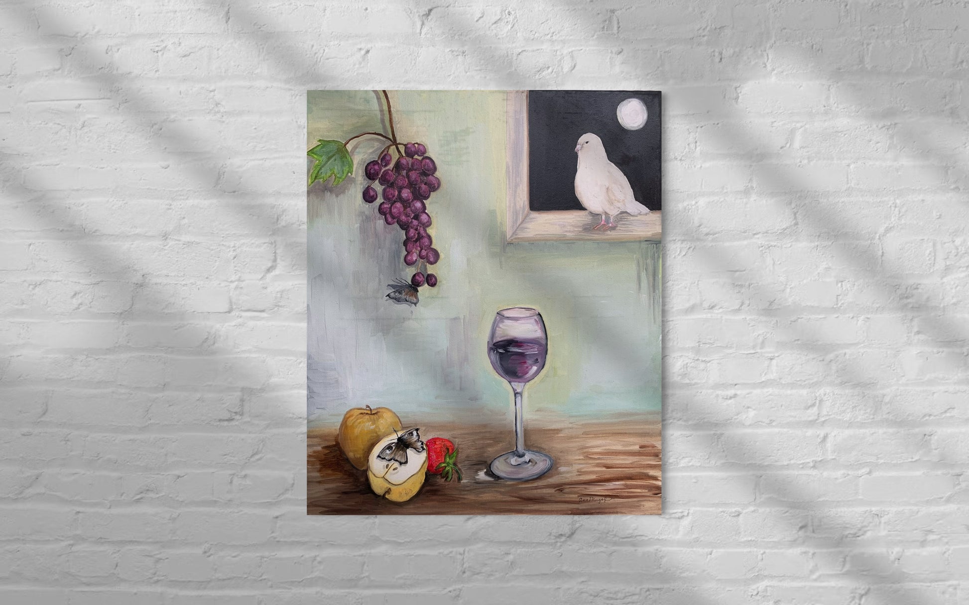 “La polisemia del amor”, esta obra representa distintas manifestaciones del amor, las uvas de Dionisio, la paloma de Afrodita, las manzanas doradas símbolo de la belleza, las fresas metáfora de las pasiones. Imagina un instante en el que la paloma, en el dintel de la ventana, puede gozar de los frutos del amor, o tomar una mariposa por presa.