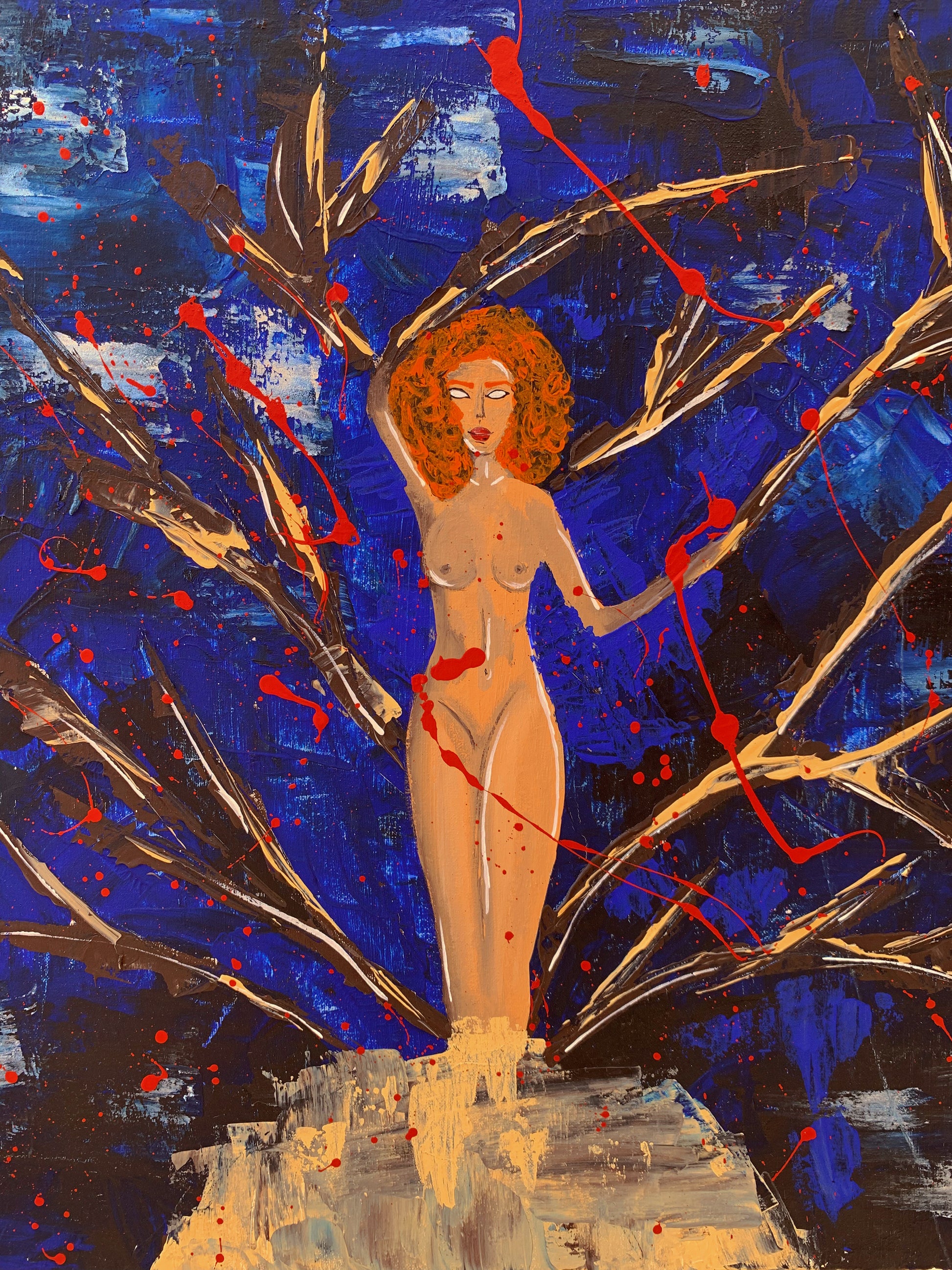 Se revela una figura atrapada en su propia mente distorsionada. Las ramas que crecen alrededor de ella simbolizan las ideas y pensamientos que surgen, tanto correctos como incorrectos, enredándose y creando un laberinto. Inmóvil y desesperada, lucha por encontrar una salida en un entorno donde la confusión y la claridad coexisten en un tumulto constante. Cada ramificación es una representación de la complejidad y el conflicto interno, mostrando la mente como un refugio o una prisión.