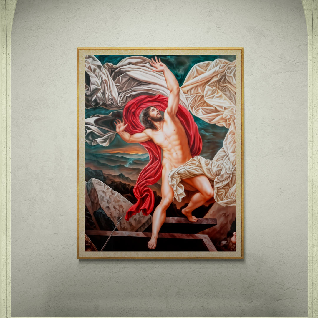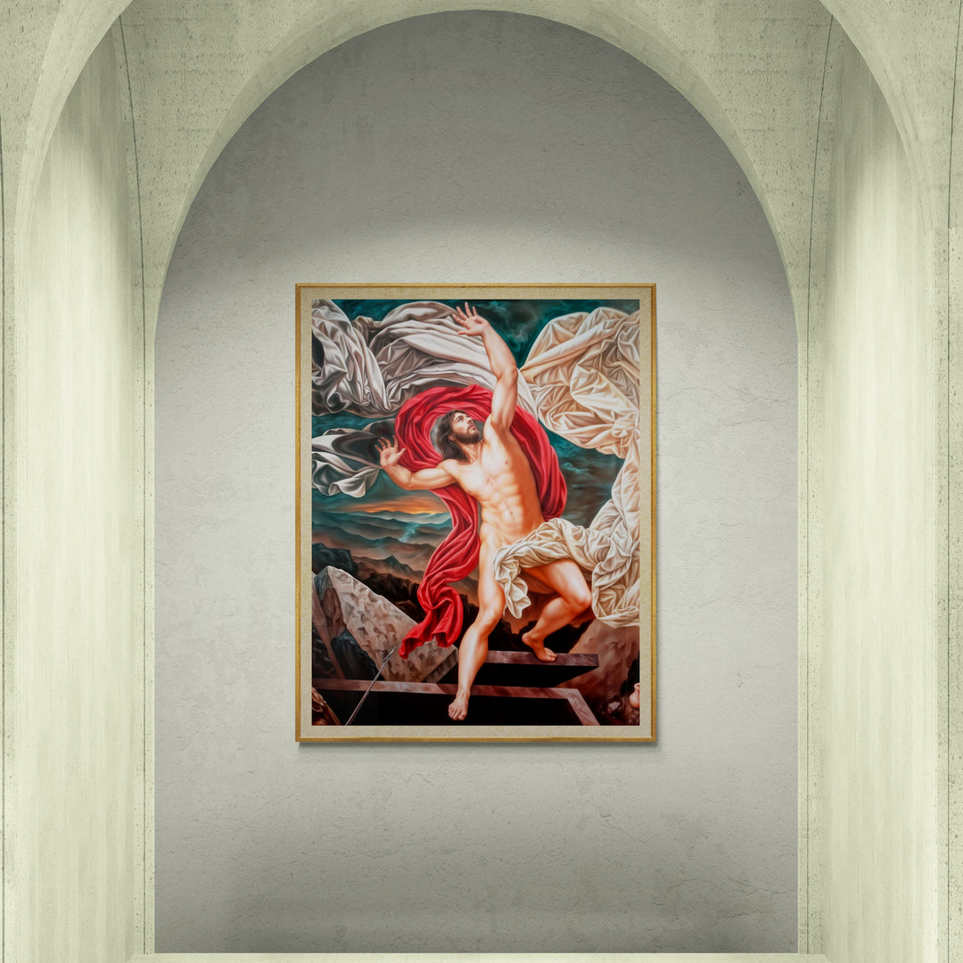En éste óleo está representado el momento en que Jesucristo ha resucitado. Inspirado en uno de los dibujos de Miguel Ángel, el cuerpo de Jesús emerge de su sepulcro hacia las alturas, despojándose de sus lienzos que vuelan en el aire representando el Espíritu Santo, al fondo en el paisaje se encuentra un nuevo amanecer al horizonte, a lo lejos se alcanzan a distinguir las tres cruces del monte Calvario. En primer plano se encuentran los símbolos de los santos óleos, la lanza de Longinos señalando su costado y un escudo del imperio romano en la esquina inferior izquierda.