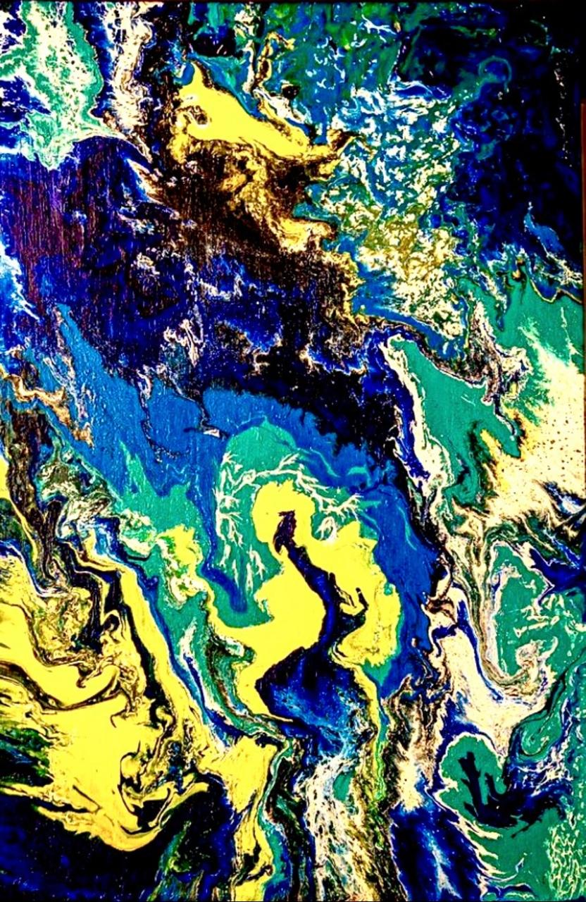Usando una técnica abstracta, la pintura es un retrato a través de las corrientes marinas de una sirena, los colores de la flora marina, el agua y las escamas crean un paisaje multi-color. El hecho de que la pintura sea sobre madera, le da diferente profundidad y consistencia a la obra, creando un sentimiento de rugosidad y firmeza. Se busca evocar la profundidad del océano y la luz que se filtra a través de las algas y el agua.