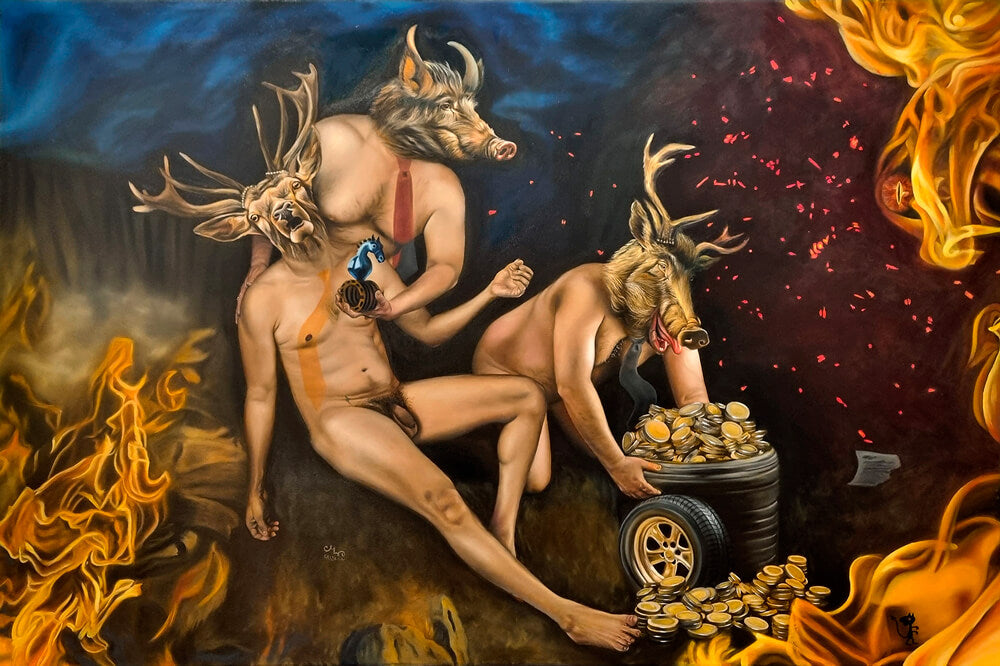 Esta obra es una alegoría moderna de la traición y la codicia, inspirada en la célebre historia de Troya. Explora el lado oscuro de la ambición humana, especialmente cuando la confianza y los lazos empresariales se utilizan como herramientas para acumular poder y riqueza a cualquier costo, en un mundo donde la avaricia y la deslealtad siguen operando sin freno. La composición expone el devastador impacto de aquellos que traicionan a quienes confían en ellos, capturando una realidad universal y vigente: el abuso de poder y la ambición desmedida que destruyen la confianza y los vínculos más profundos.