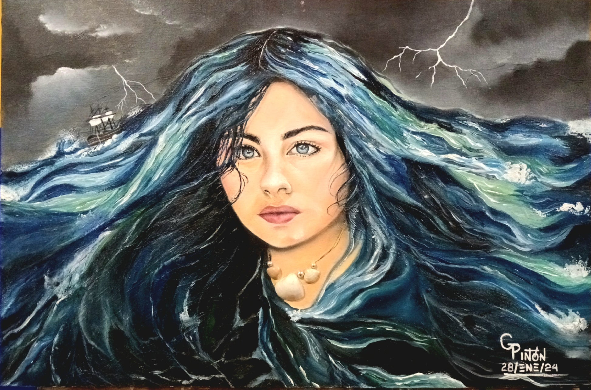 Óleo sobre tela con incrustación de conchas de mar y perlas de fantasía