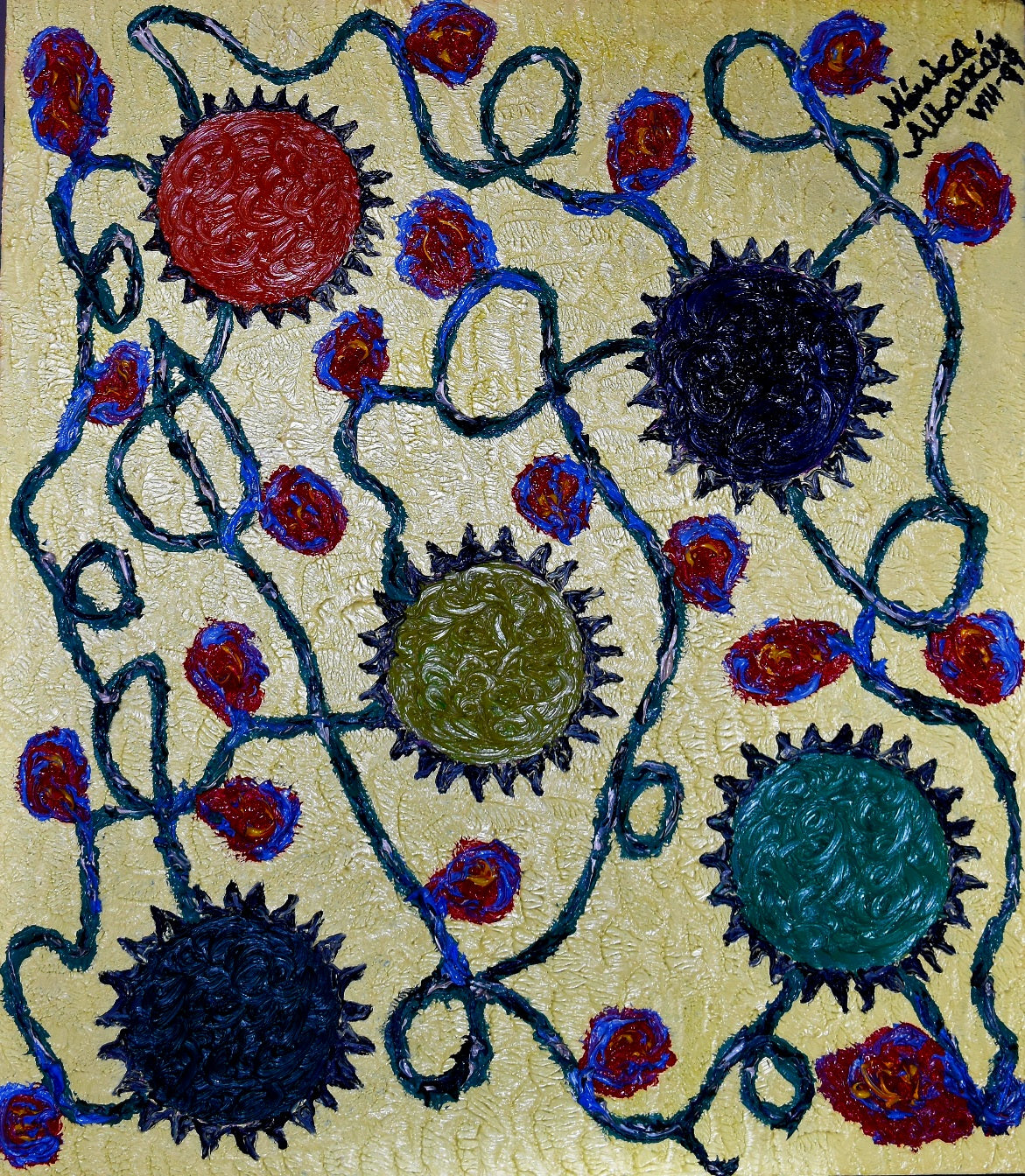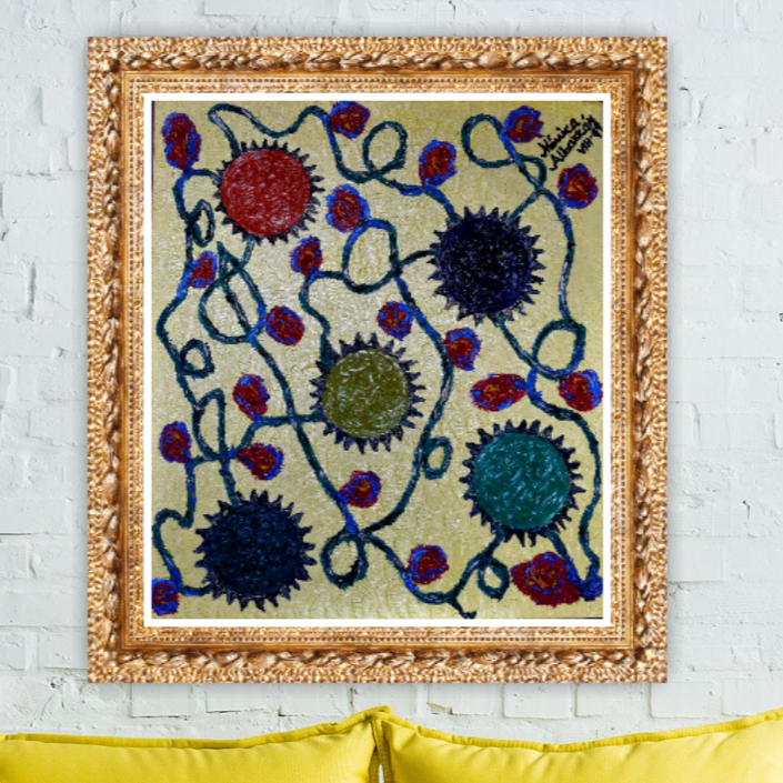 En esta pintura quise representar cómo en el ser humano todo está conectado, los engranes representan que todo está unido y las flores que se unen por medio de las ramas, representan la vida en sí.