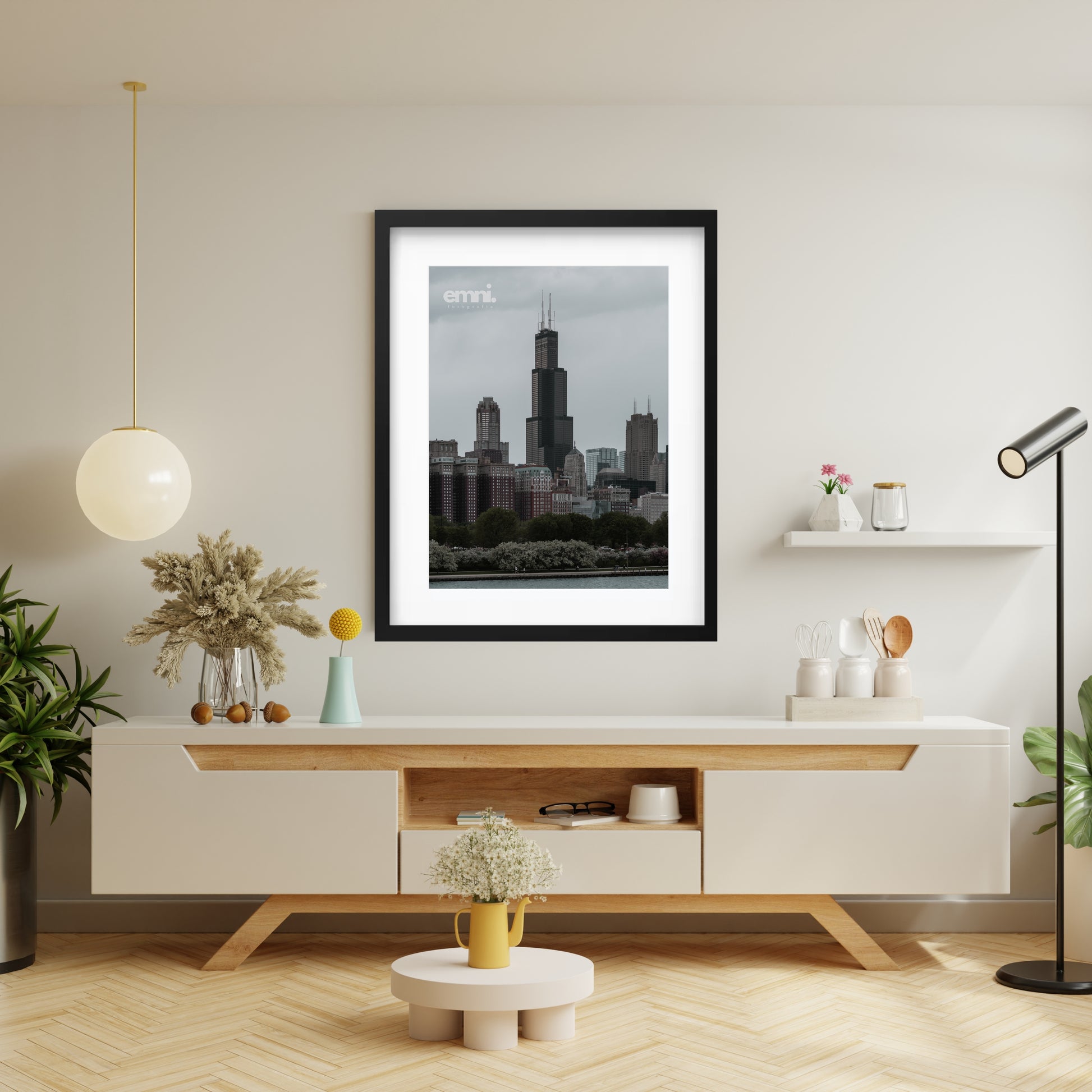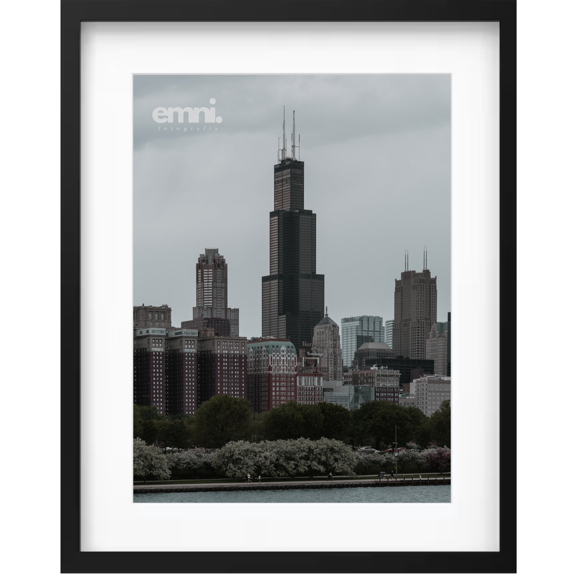 "La Torre Willis desde la Bahía" (Frías, 2022), perteneciente a la colección "Chicago", se entrega con certificado de autenticidad, firma del artista, nombre de colección y número de serie. Todo escrito a mano. Serie limitada a 5 ejemplares.