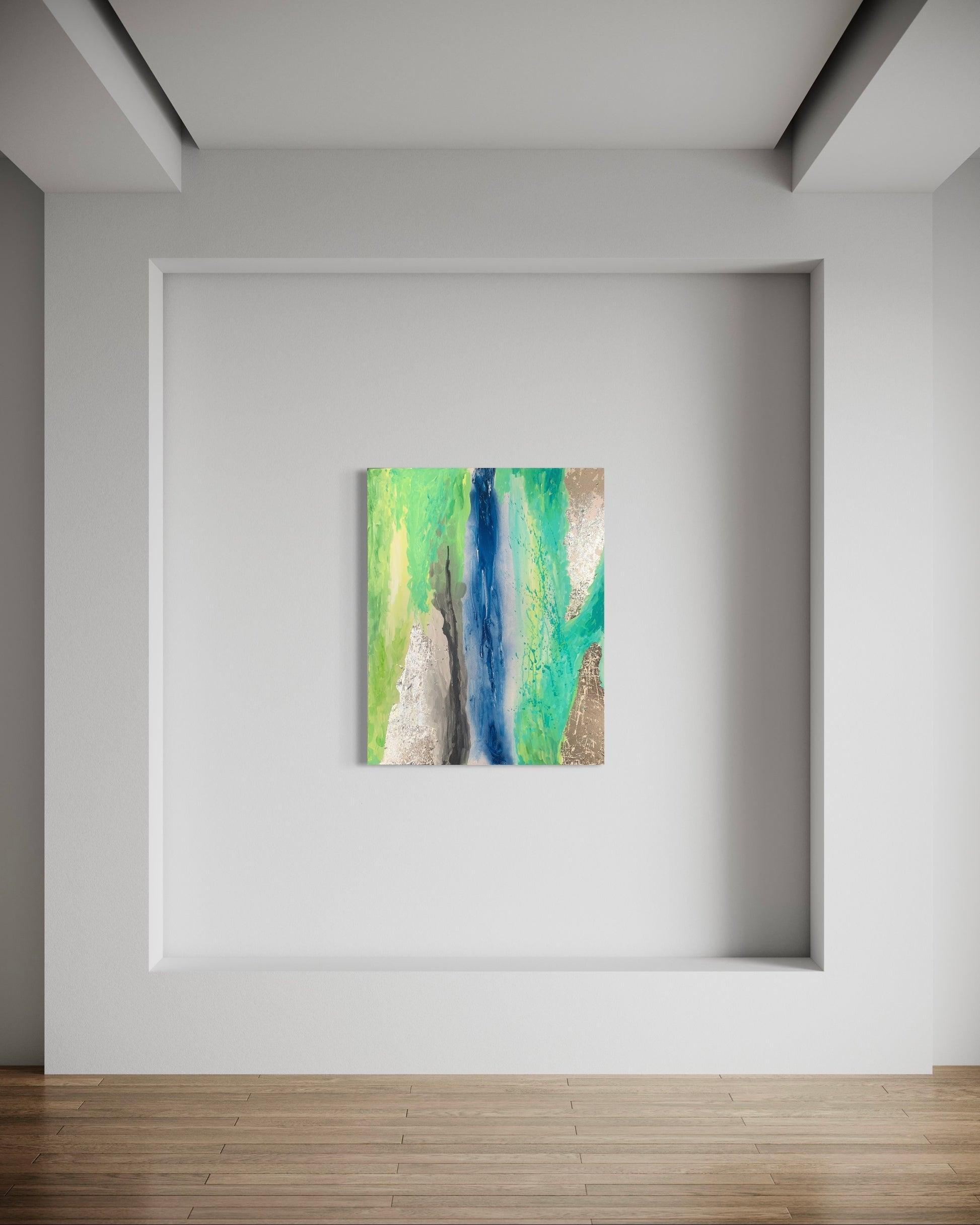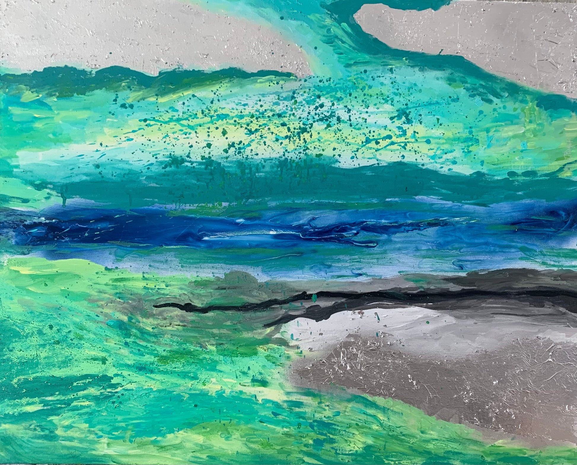 “Laguna Estigia” El verde es metáfora de la vida y de la muerte. Colores de calma al tiempo que de transformación. Este cuadro abstracto imagina las sensaciones de las postrimerías y nos lleva a explorar los senderos misteriosos de Hades y Perséfone.