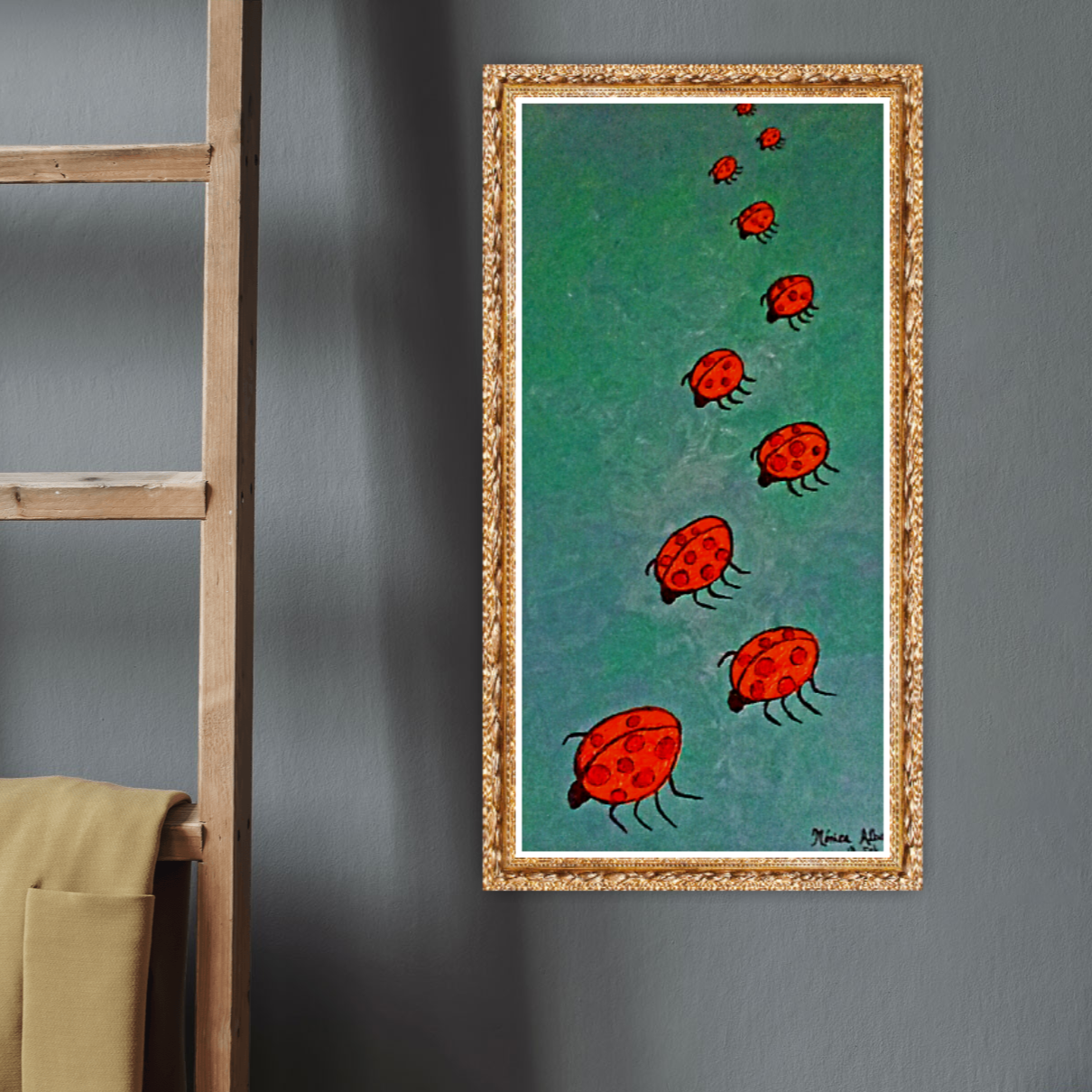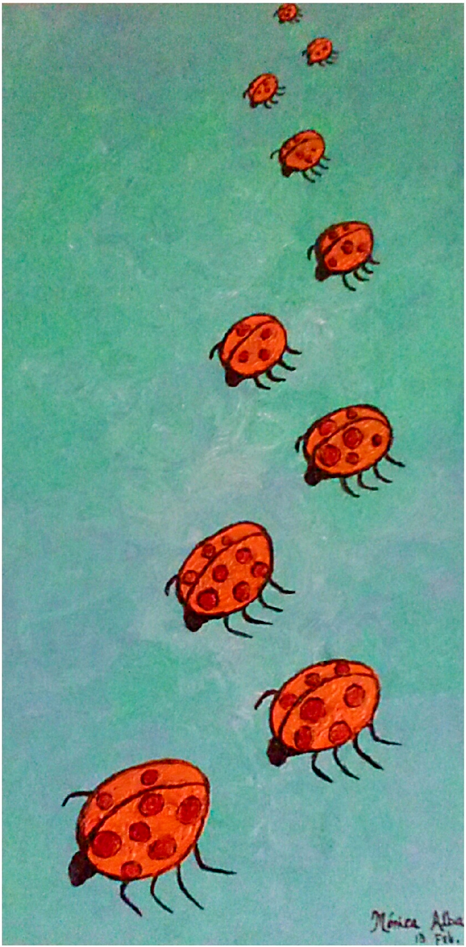 Cuando era niña pasaba muchas horas en el jardín buscando catarinas, las metía en una cajita y las formaba sobre el pasto. Esta pintura me recuerda a mi infancia.
