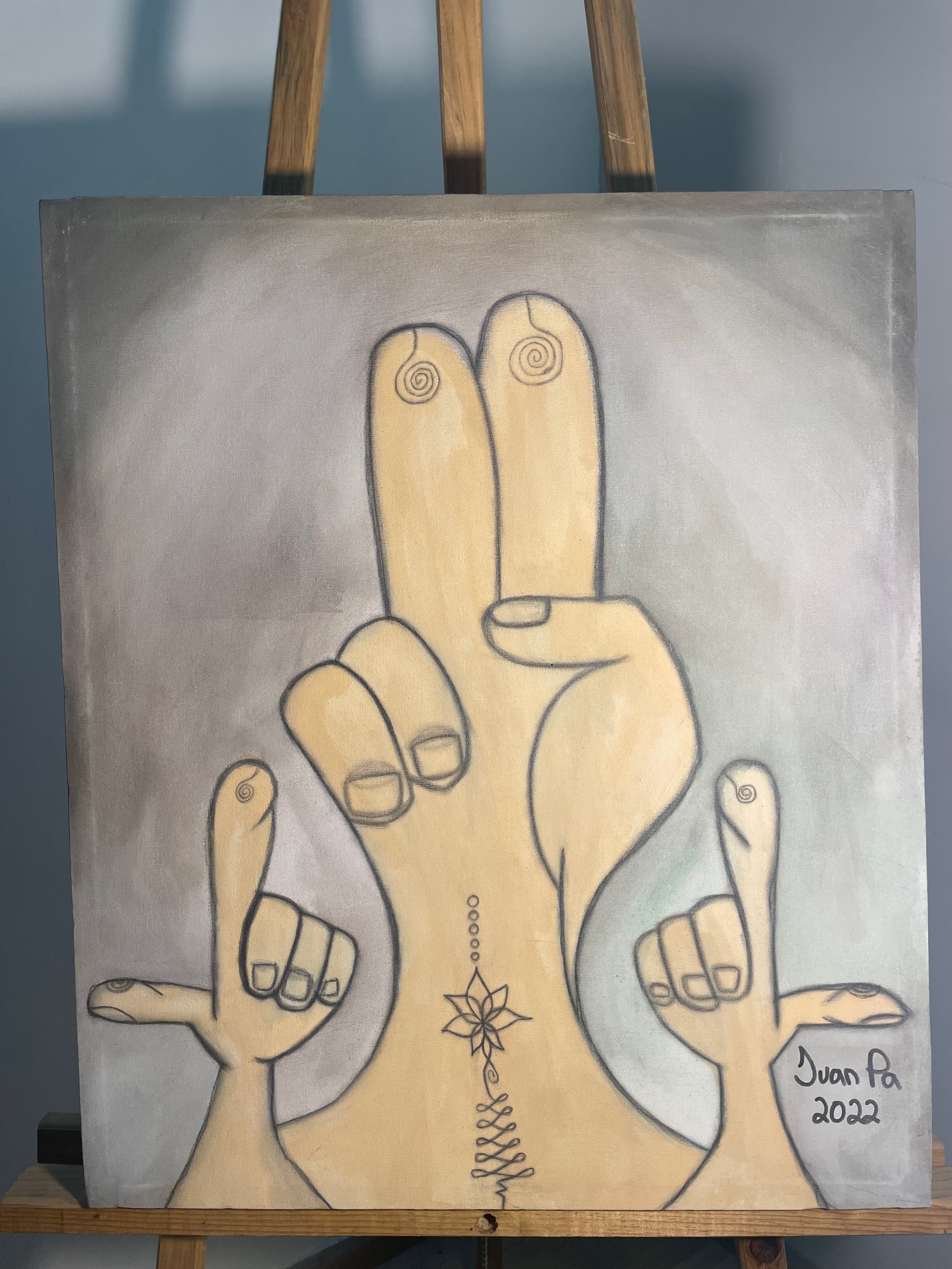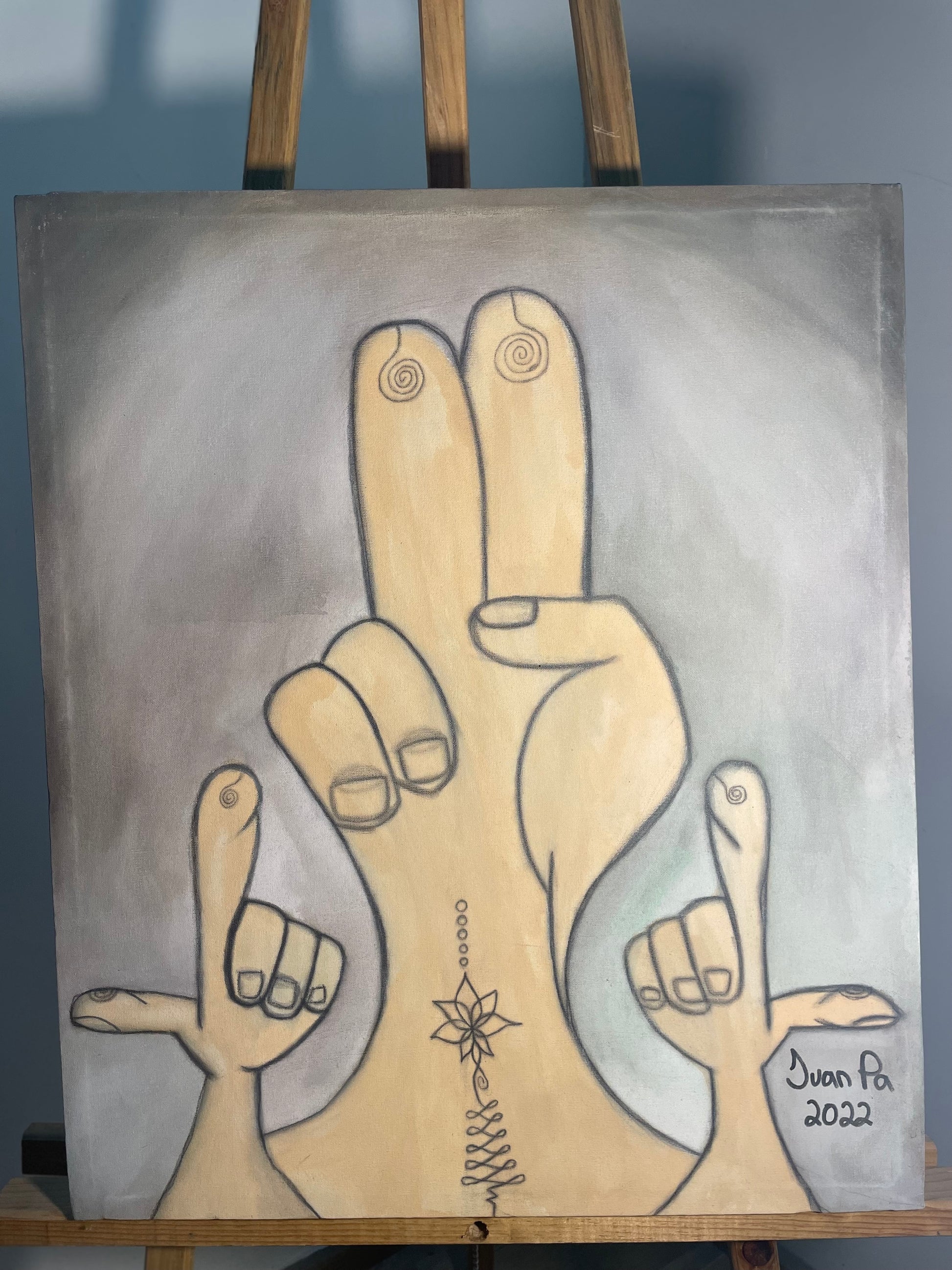 Cuando tomaba clases con mi antiguo maestro se nos ocurrió la idea de hacer cuadros de manos, el maestro me sugirió hacer cualquier figura, la mano grande representa la paz y las manos pequeñas un juego de niños.
