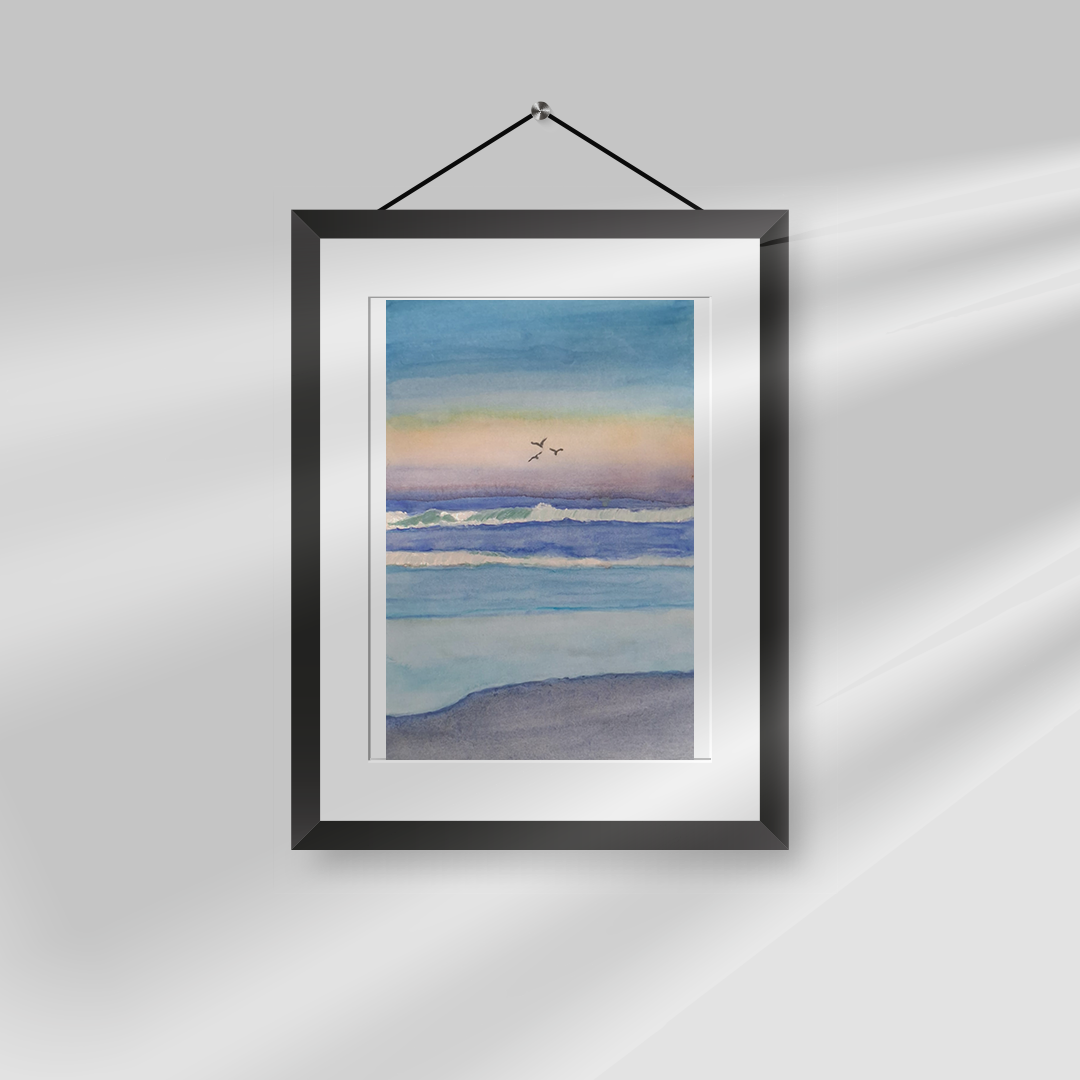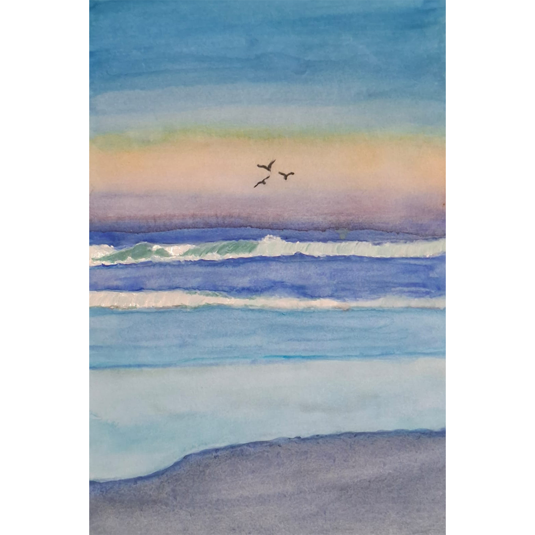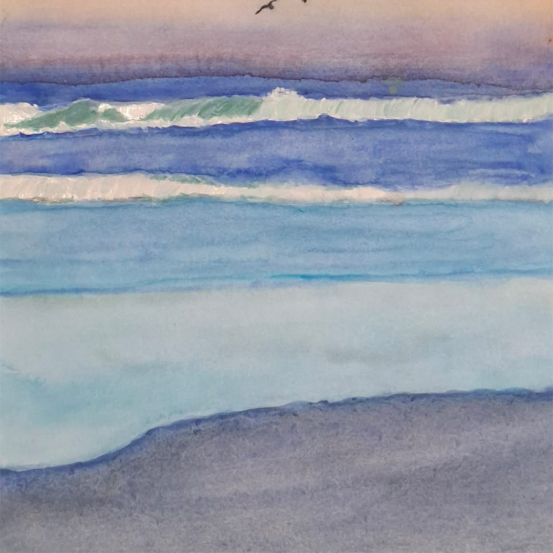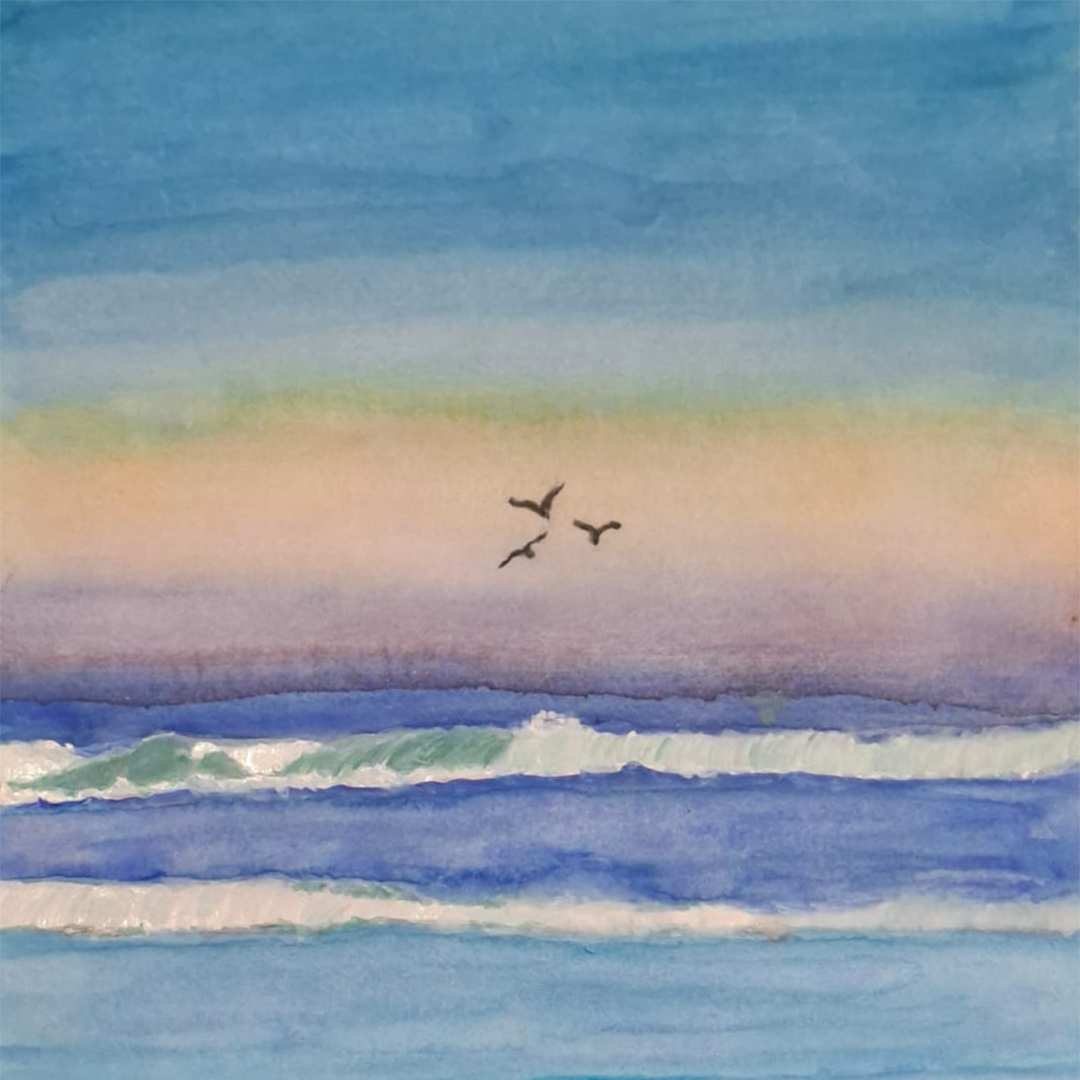 Siempre he disfrutado estar en el mar, gozar de sus sonidos y ver su grandiosidad . Sus sonidos enaltecen el alma. Quise agregar a la pintura las gaviotas animales que siempre están gozando el mar jugueteando