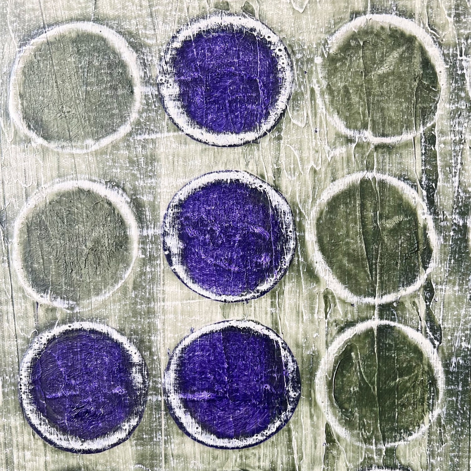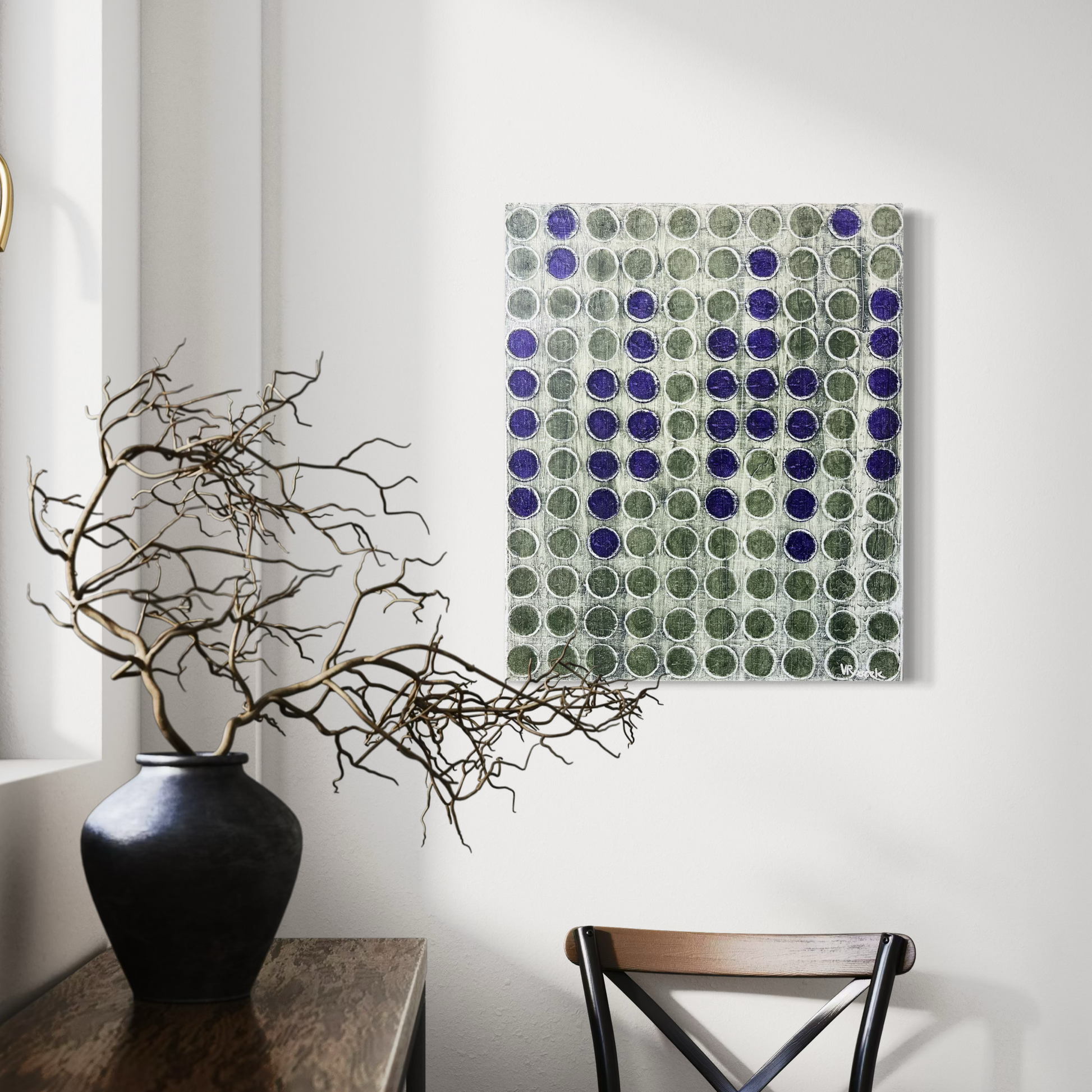 Esta obra es una abstracción de una imagen de flores de lavanda, hecha con una retícula de círculos. Los colores son un verde olivo suave y un azul violeta, como la lavanda misma. Esta obra puede dar un toque de naturaleza al espacio, con la sofisticación de una obra abstracta.