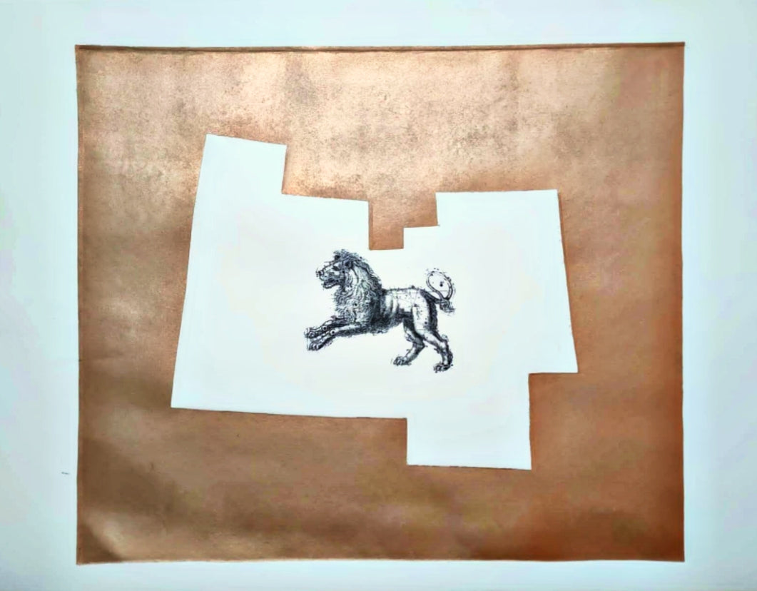 Tëcnica: Grabado en negativo en tinta dorada sobre gofrado e intervenido con transfer.