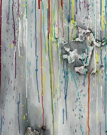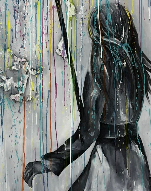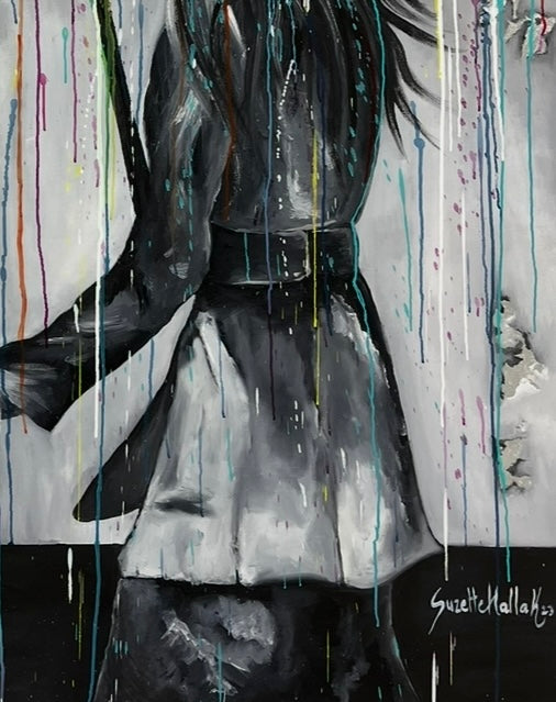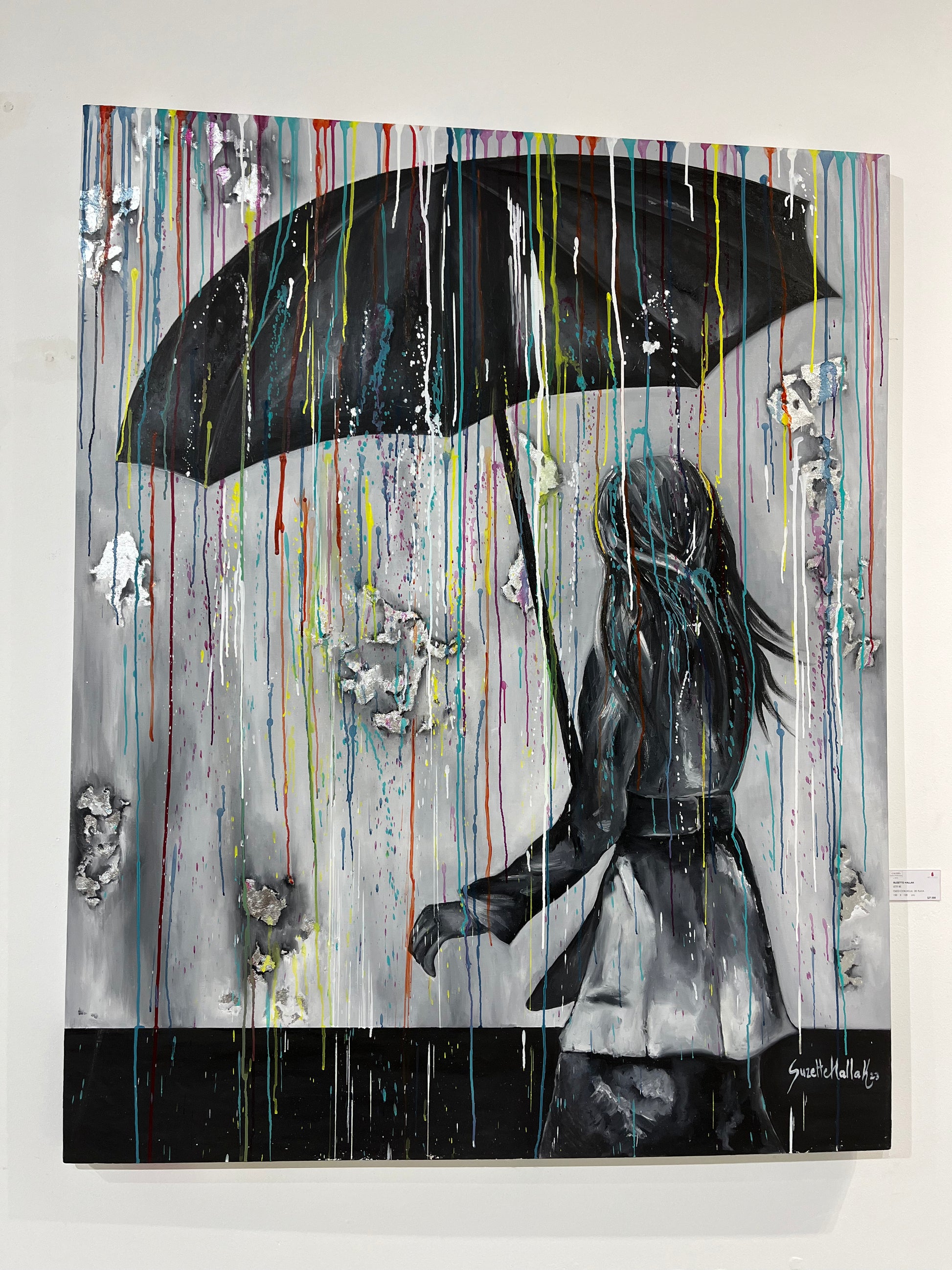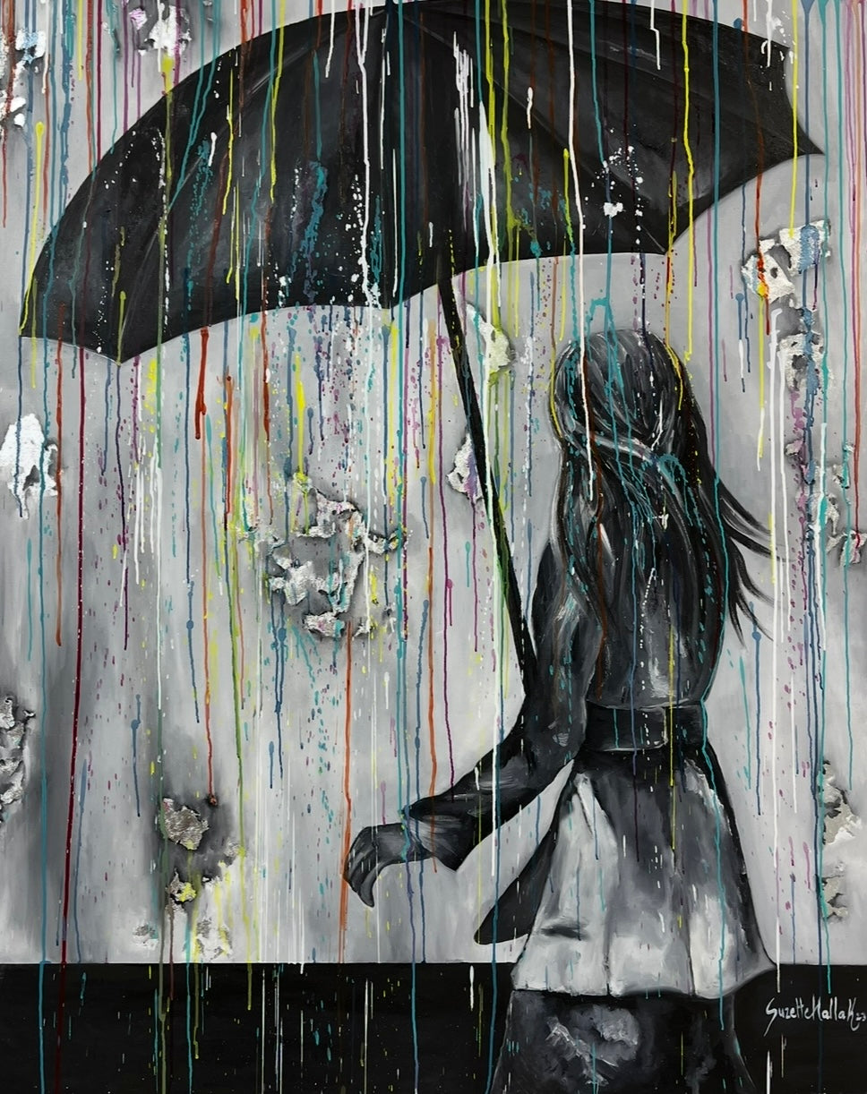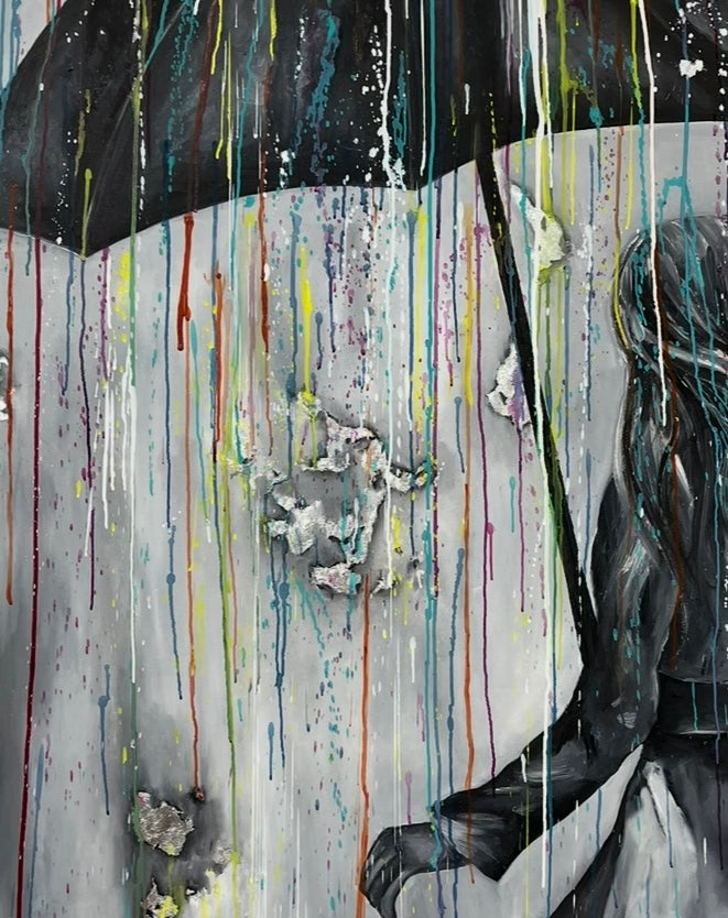 Bajo la lluvia, una figura con paraguas avanza sin detenerse. “Let It Be” representa resiliencia y aceptación: dejar que la vida fluya y hallar luz incluso en la tormenta. El uso de hoja de plata introduce reflejos de esperanza en medio del caos.