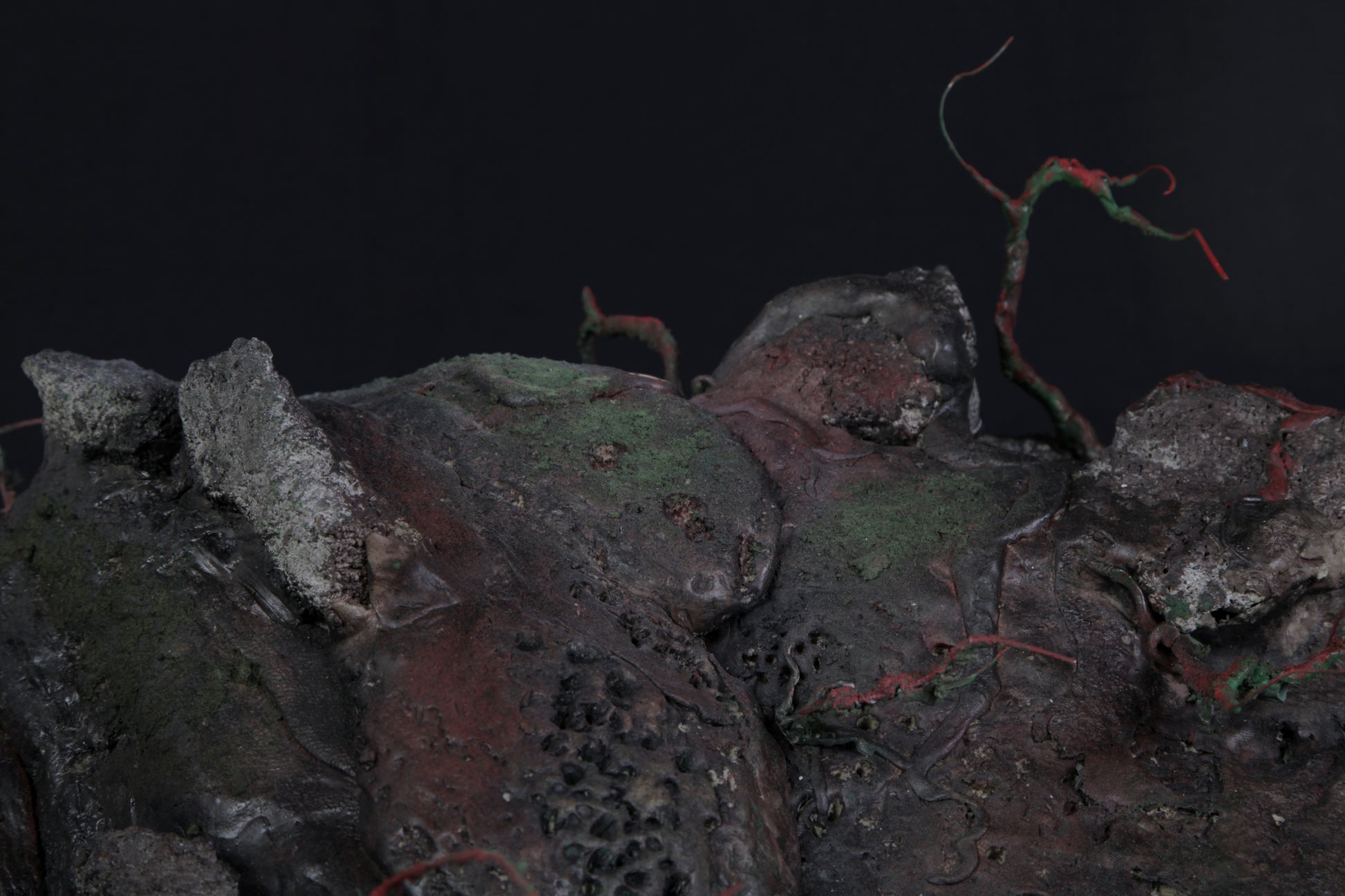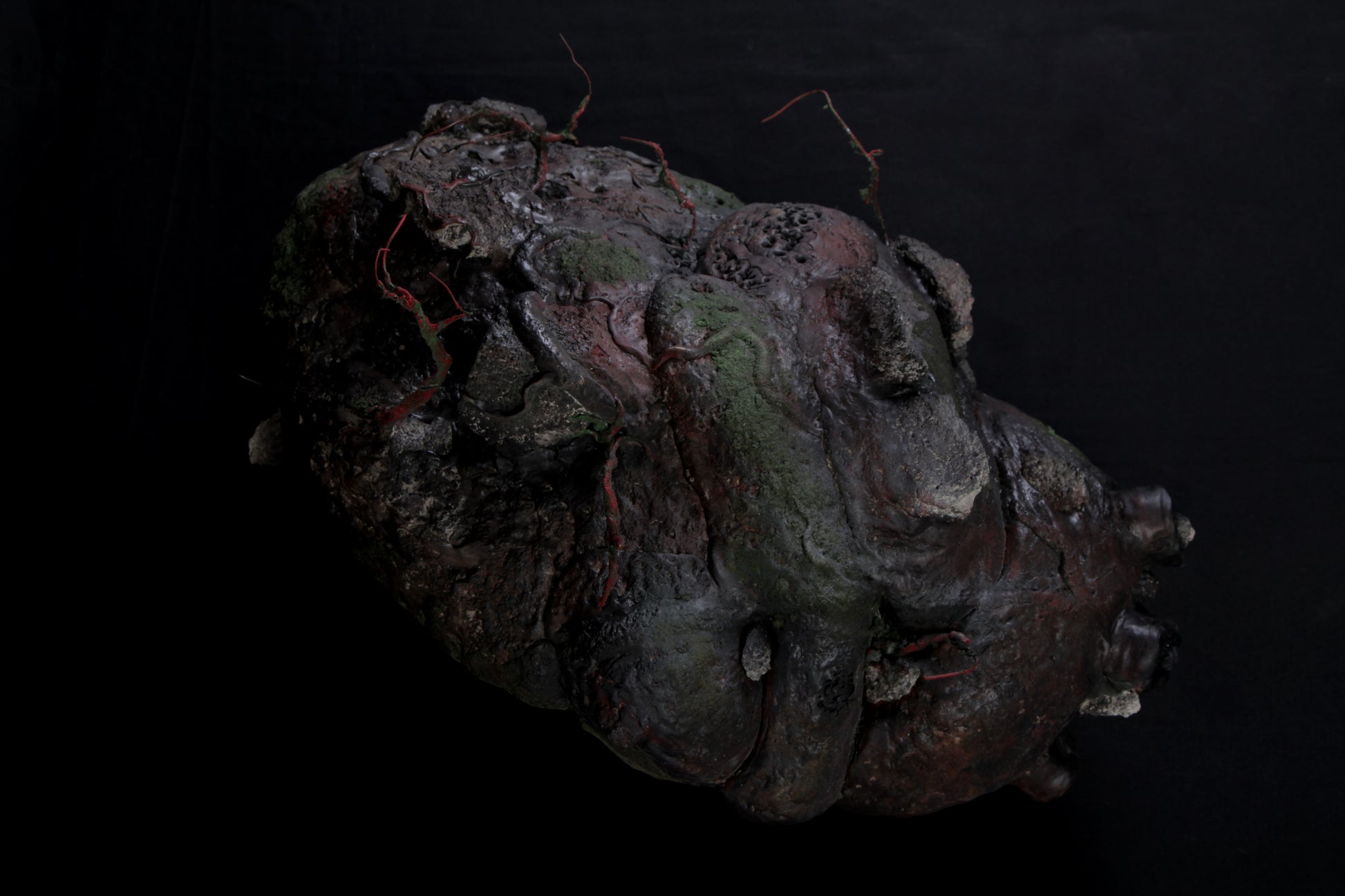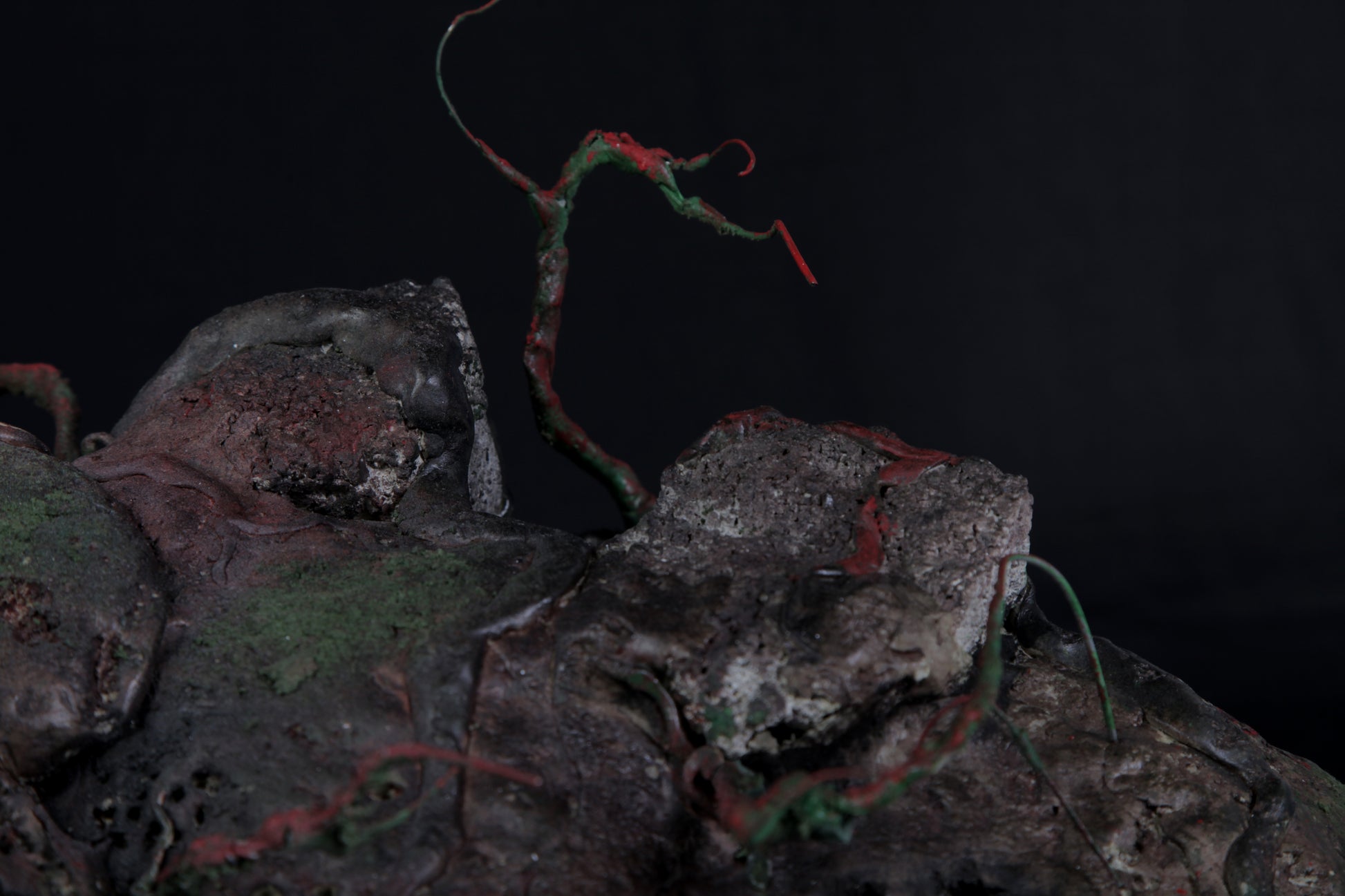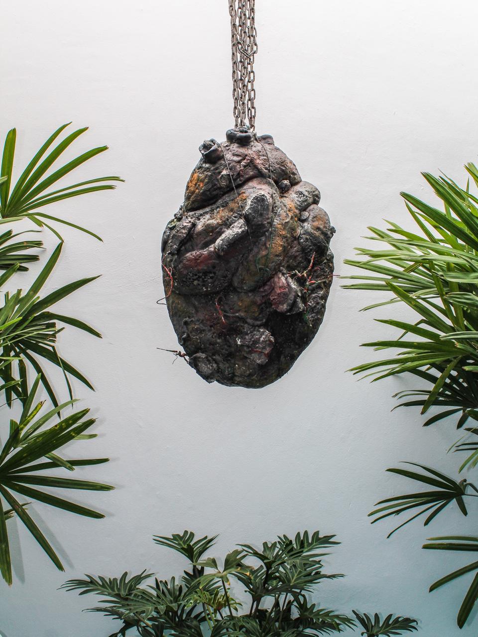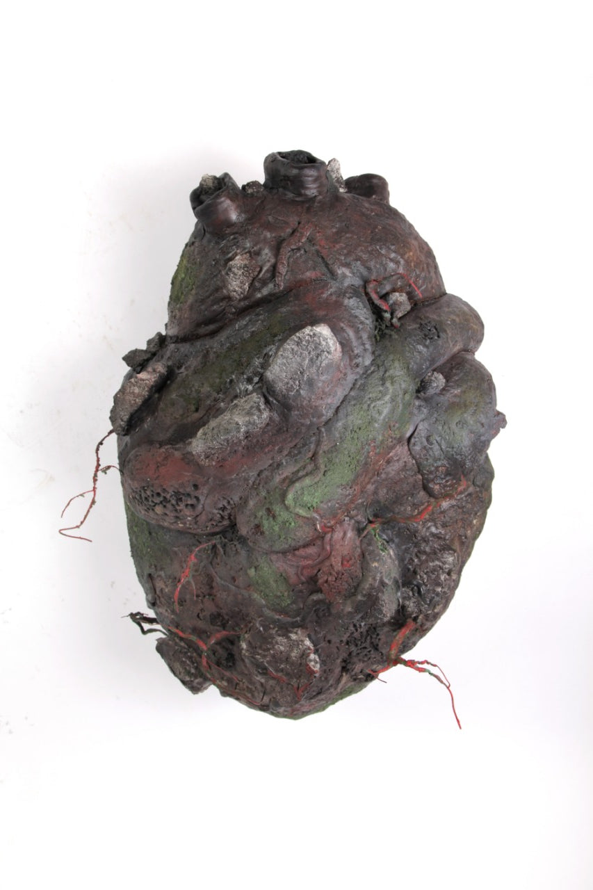 En esta obra represento a un corazón roto, convertido en piedra, que se ha dejado morir cuando se deja inerte, dejándose podrir. Una carga pesada, rupturas por doquier y carne a punto de morir, pero dentro de toda la obscuridad, se encuentran jugando por ahí las venas, mitad vivas, mitad muertas, que nos dejan concluir que, a pesar del moho, hay una vida detrás esperando a ser rescatada, ¿Por quién? Por el amor.