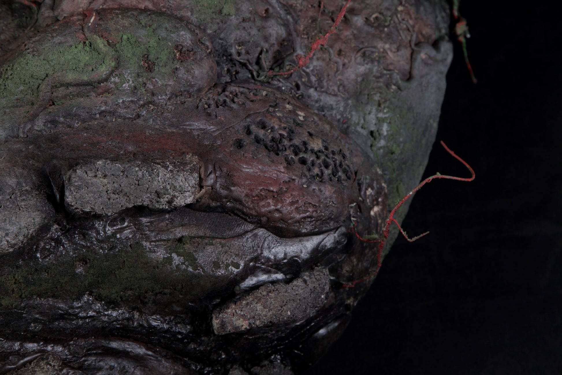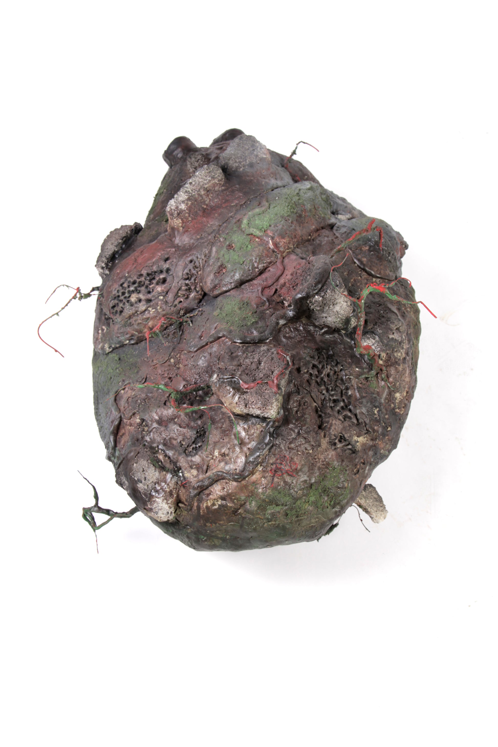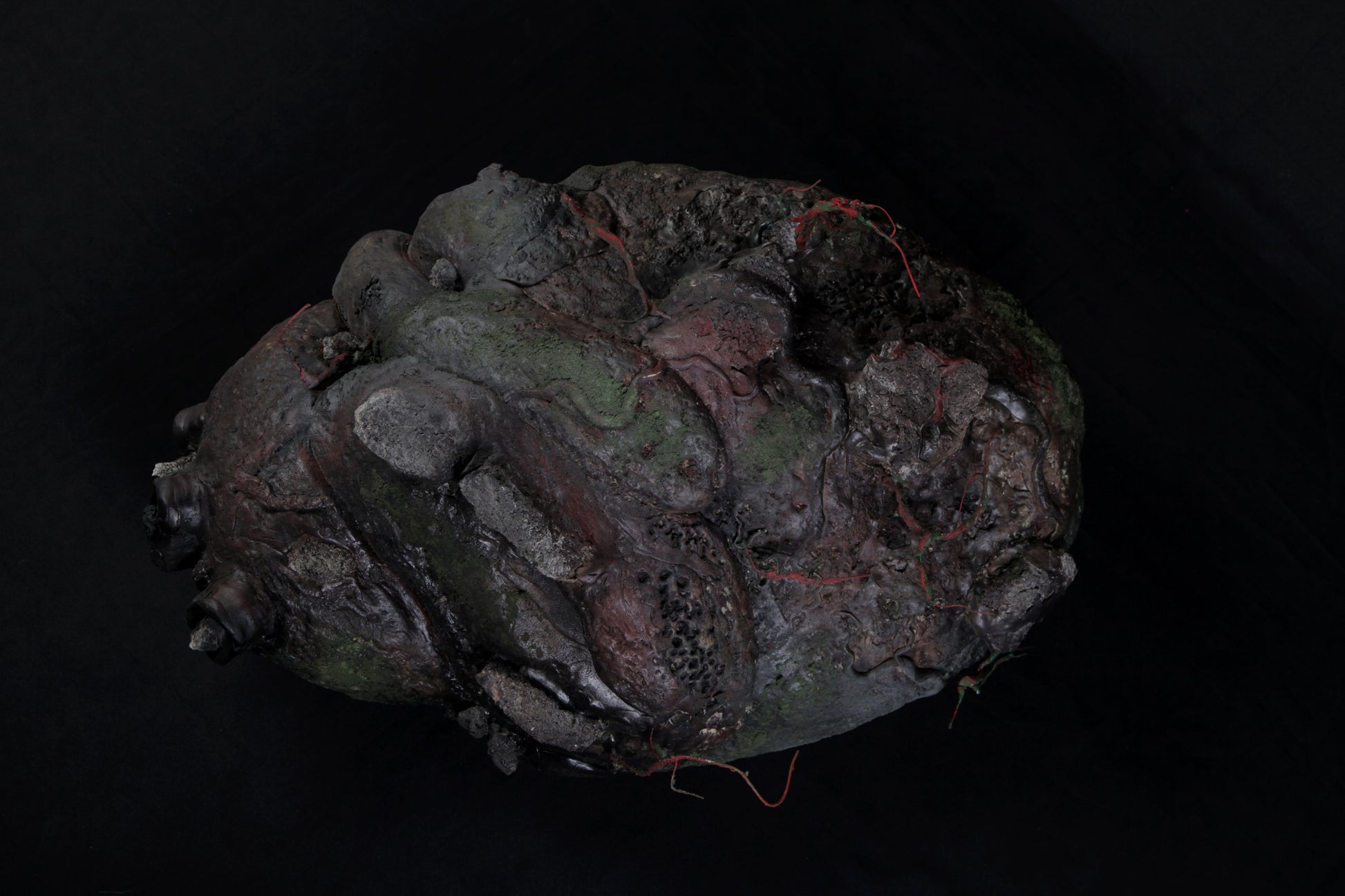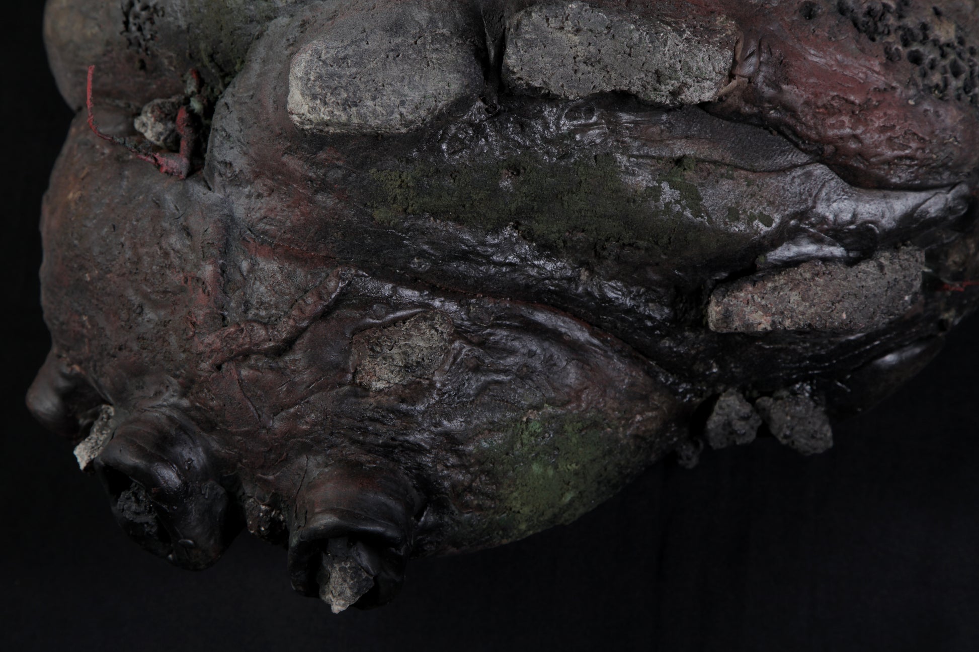 En esta obra represento a un corazón roto, convertido en piedra, que se ha dejado morir cuando se deja inerte, dejándose podrir. Una carga pesada, rupturas por doquier y carne a punto de morir, pero dentro de toda la obscuridad, se encuentran jugando por ahí las venas, mitad vivas, mitad muertas, que nos dejan concluir que, a pesar del moho, hay una vida detrás esperando a ser rescatada, ¿Por quién? Por el amor.