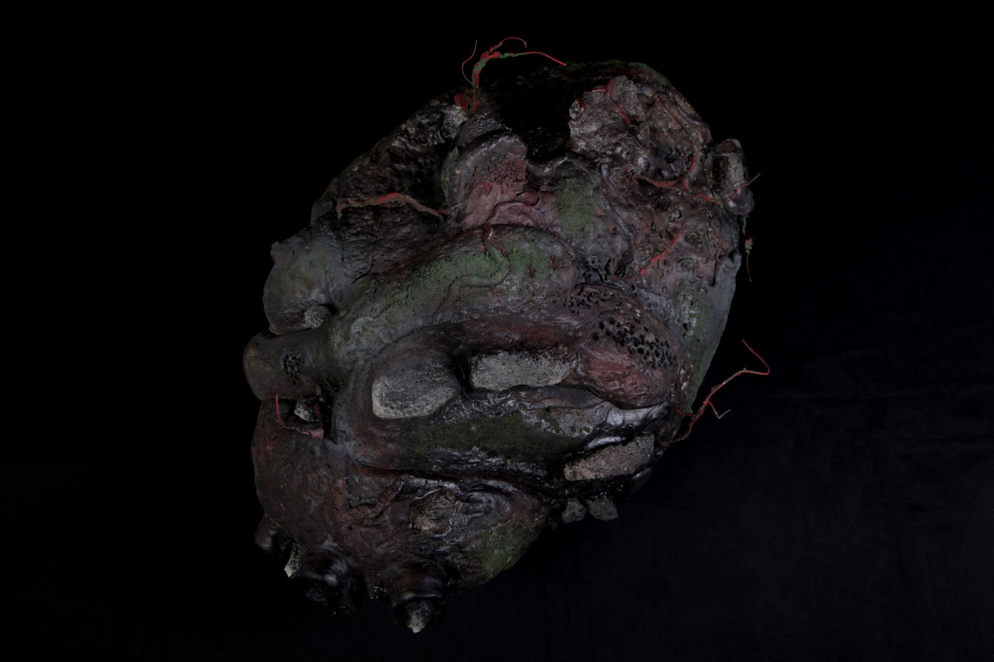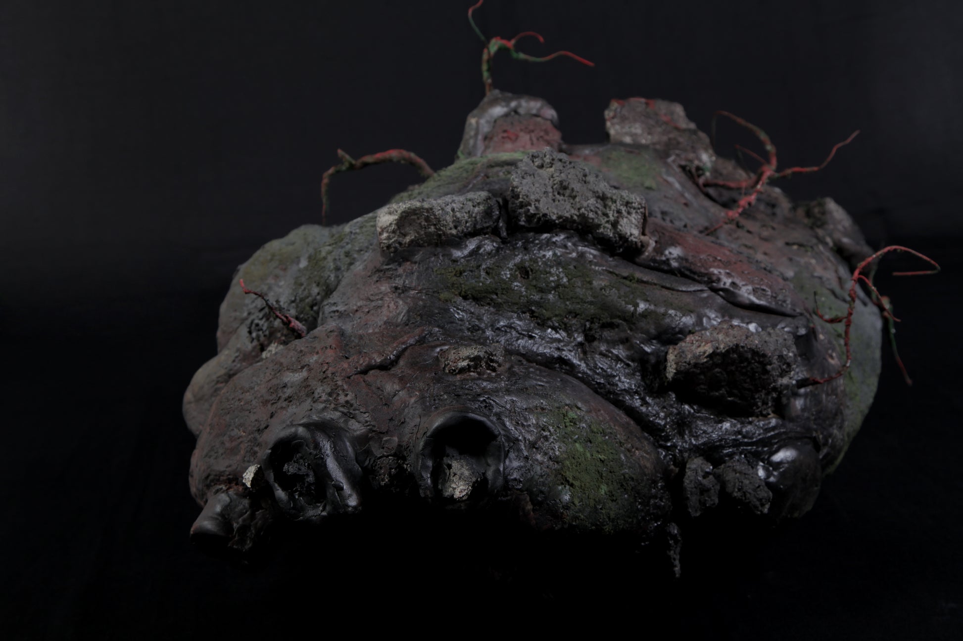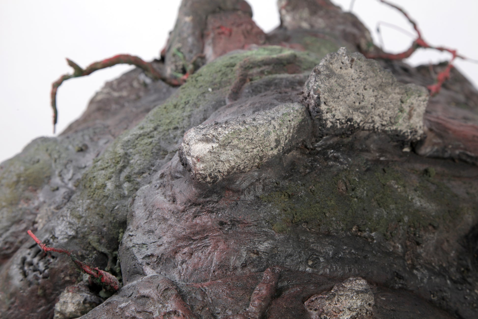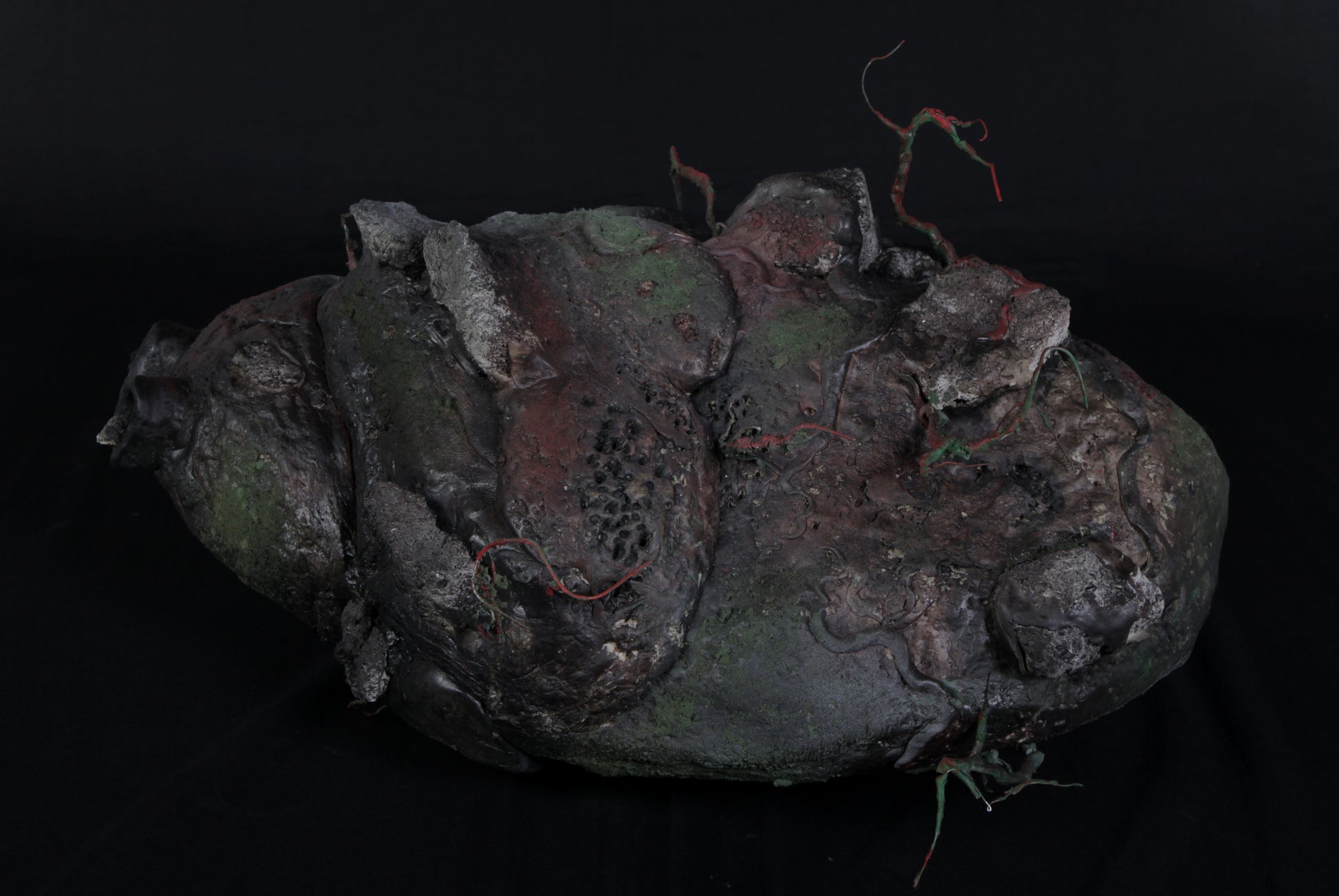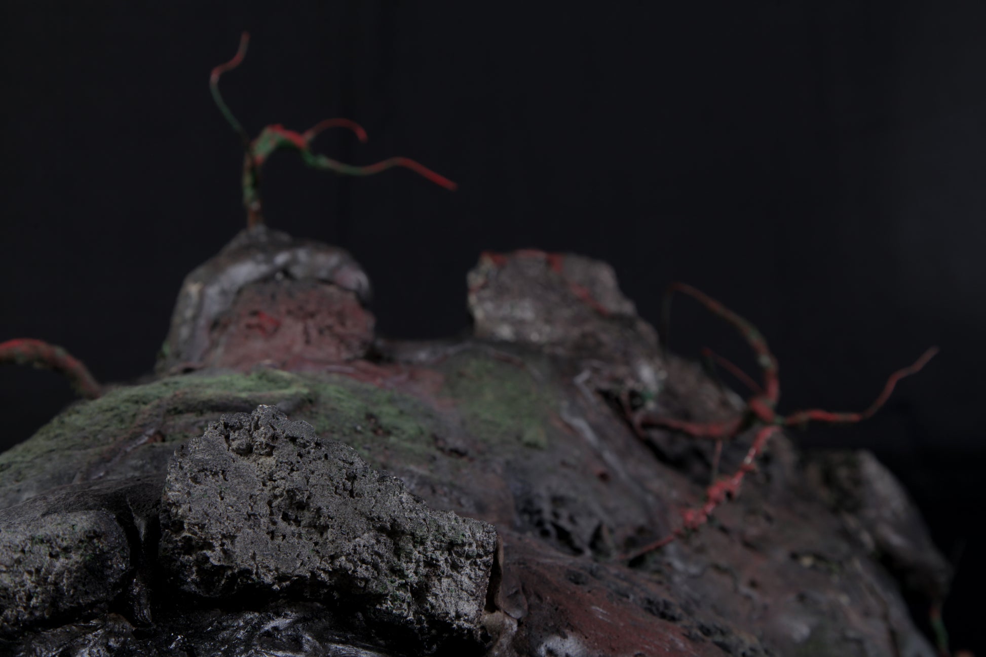 En esta obra represento a un corazón roto, convertido en piedra, que se ha dejado morir cuando se deja inerte, dejándose podrir. Una carga pesada, rupturas por doquier y carne a punto de morir, pero dentro de toda la obscuridad, se encuentran jugando por ahí las venas, mitad vivas, mitad muertas, que nos dejan concluir que, a pesar del moho, hay una vida detrás esperando a ser rescatada, ¿Por quién? Por el amor.