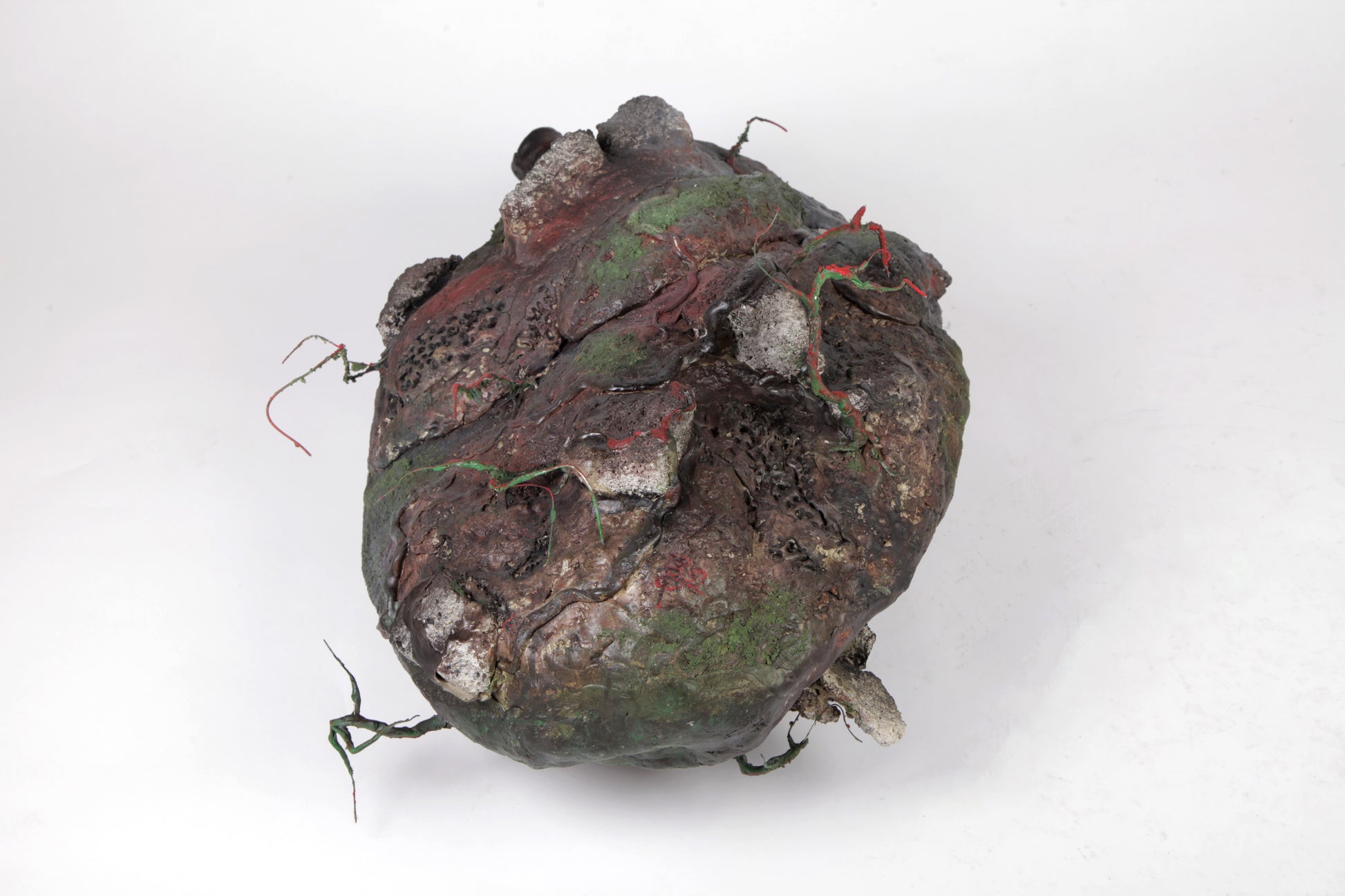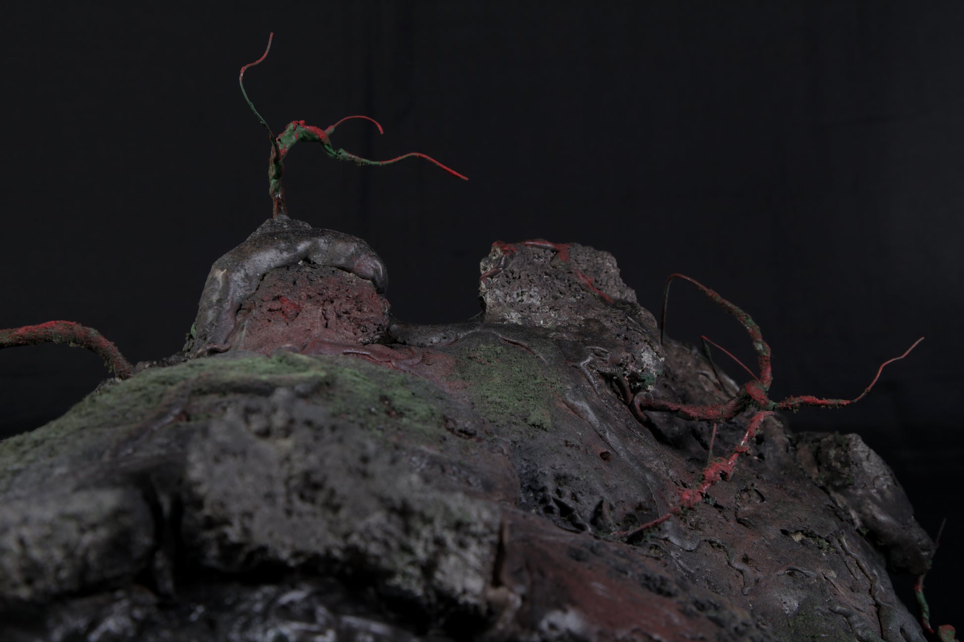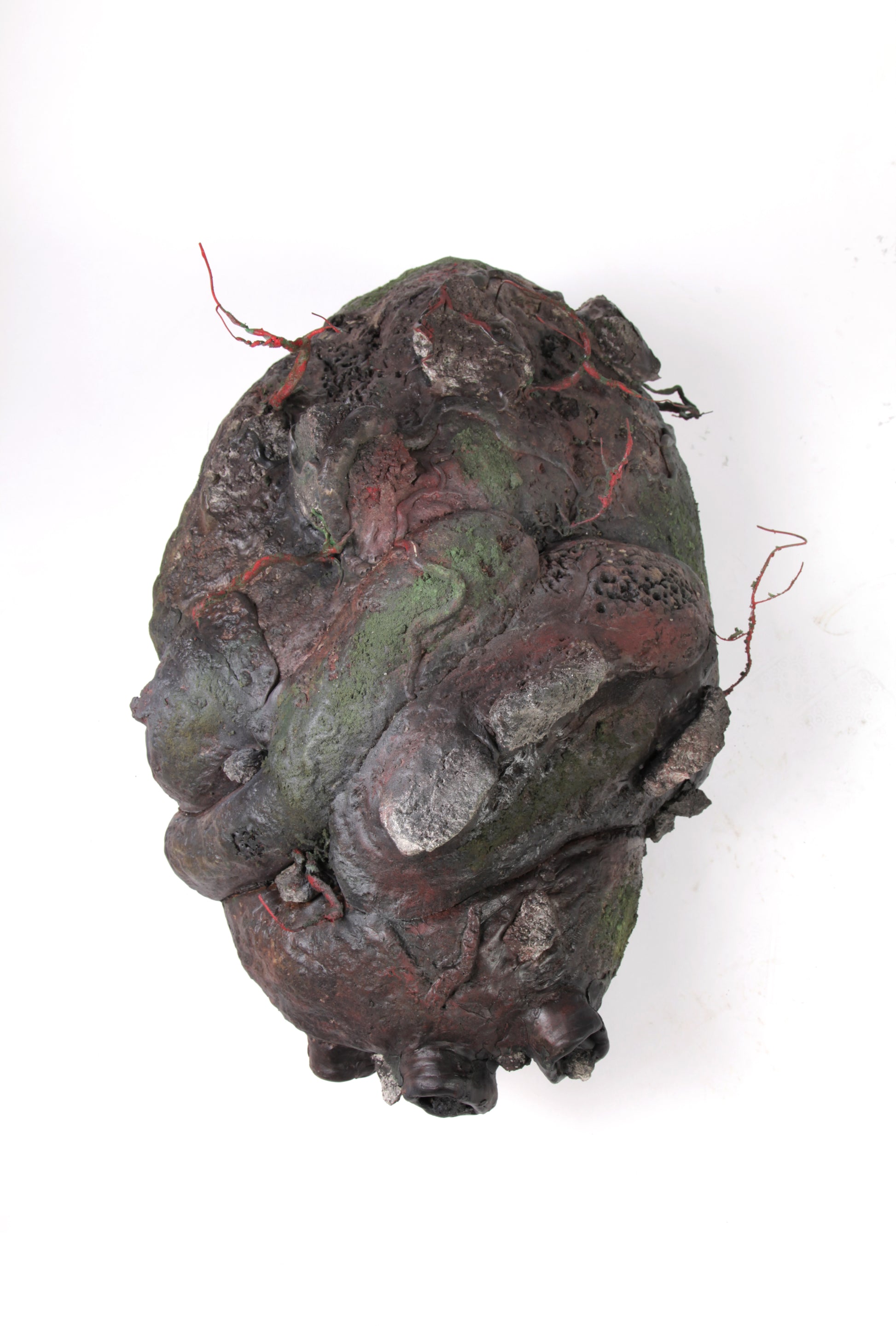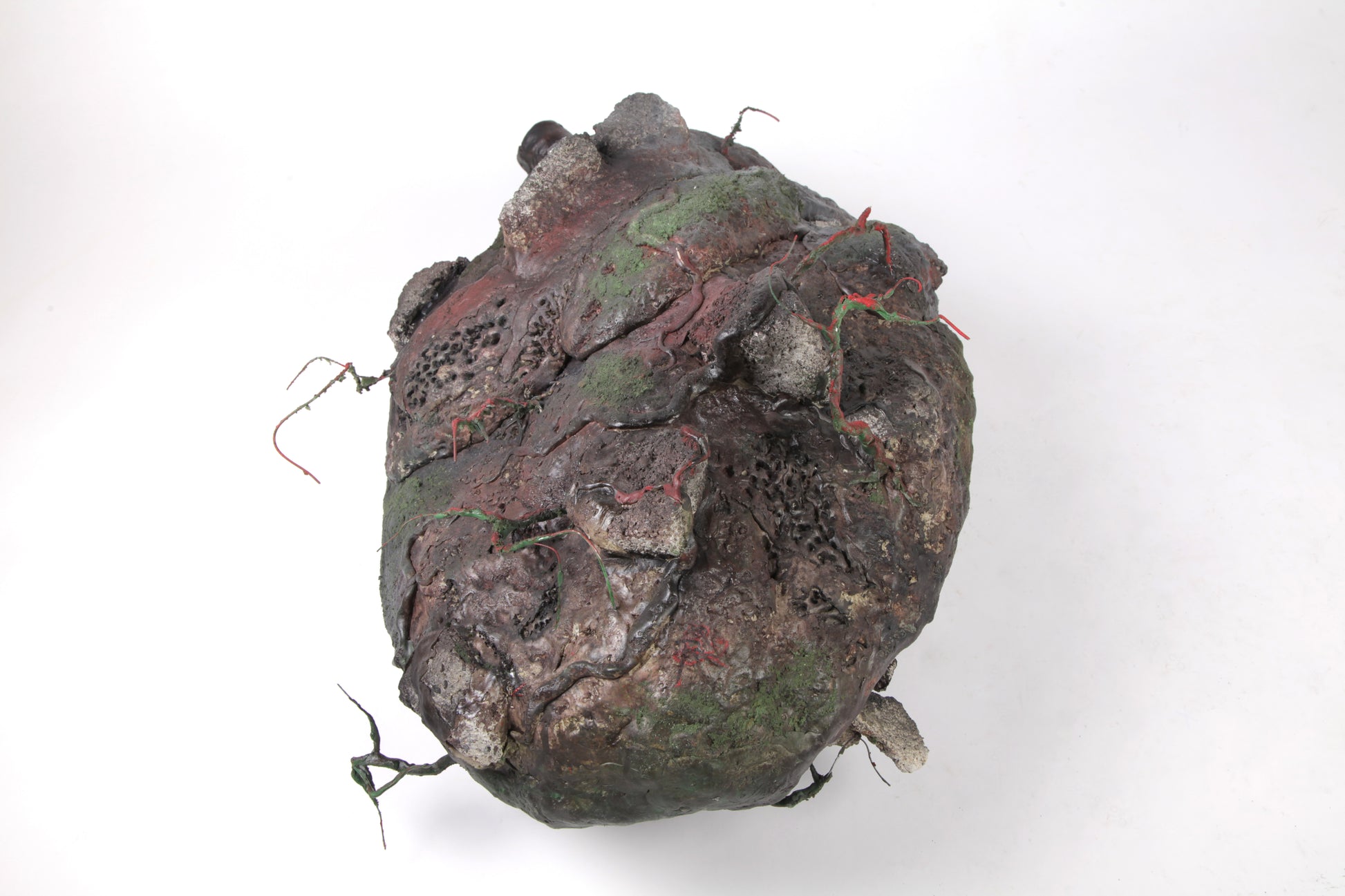 En esta obra represento a un corazón roto, convertido en piedra, que se ha dejado morir cuando se deja inerte, dejándose podrir. Una carga pesada, rupturas por doquier y carne a punto de morir, pero dentro de toda la obscuridad, se encuentran jugando por ahí las venas, mitad vivas, mitad muertas, que nos dejan concluir que, a pesar del moho, hay una vida detrás esperando a ser rescatada, ¿Por quién? Por el amor.