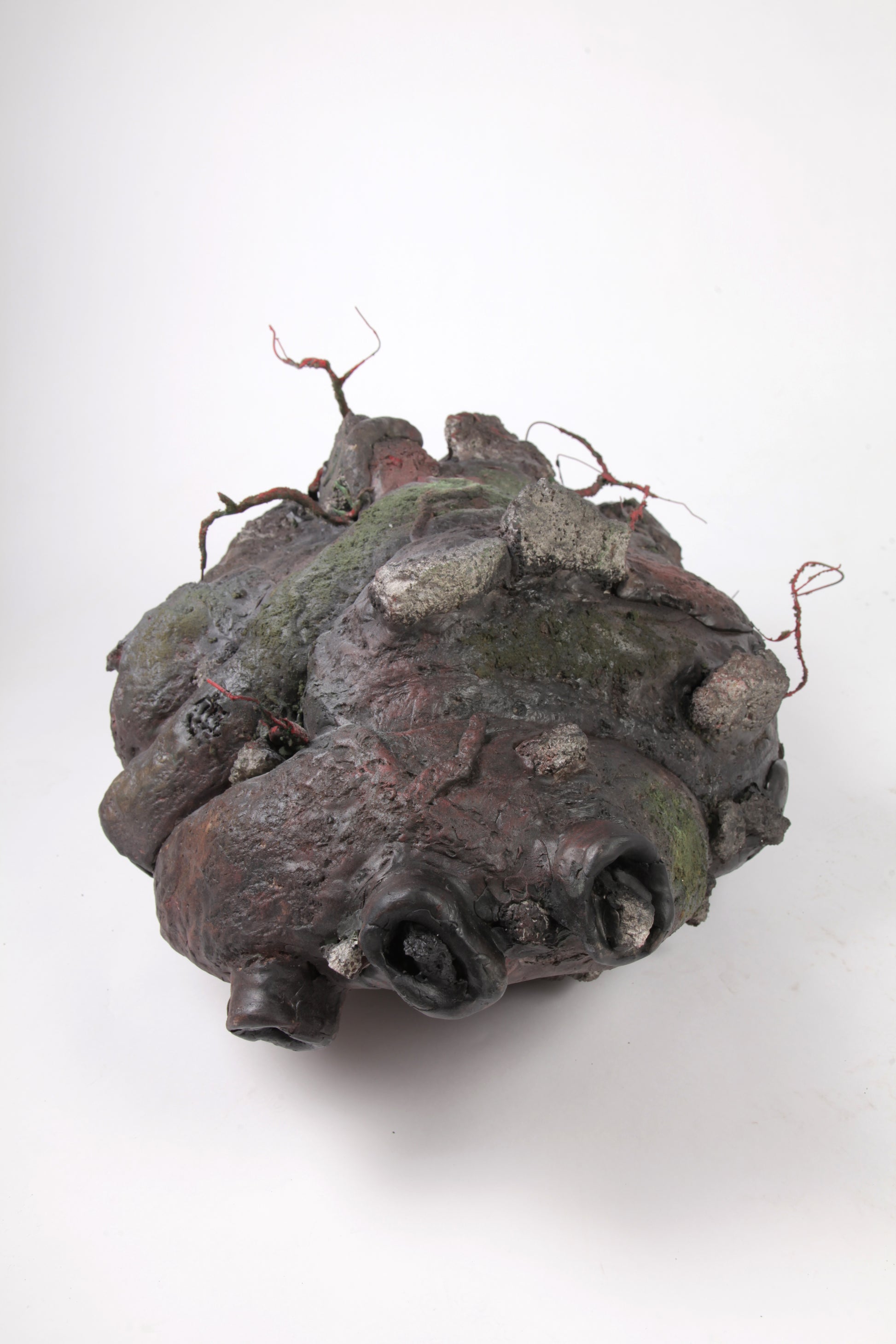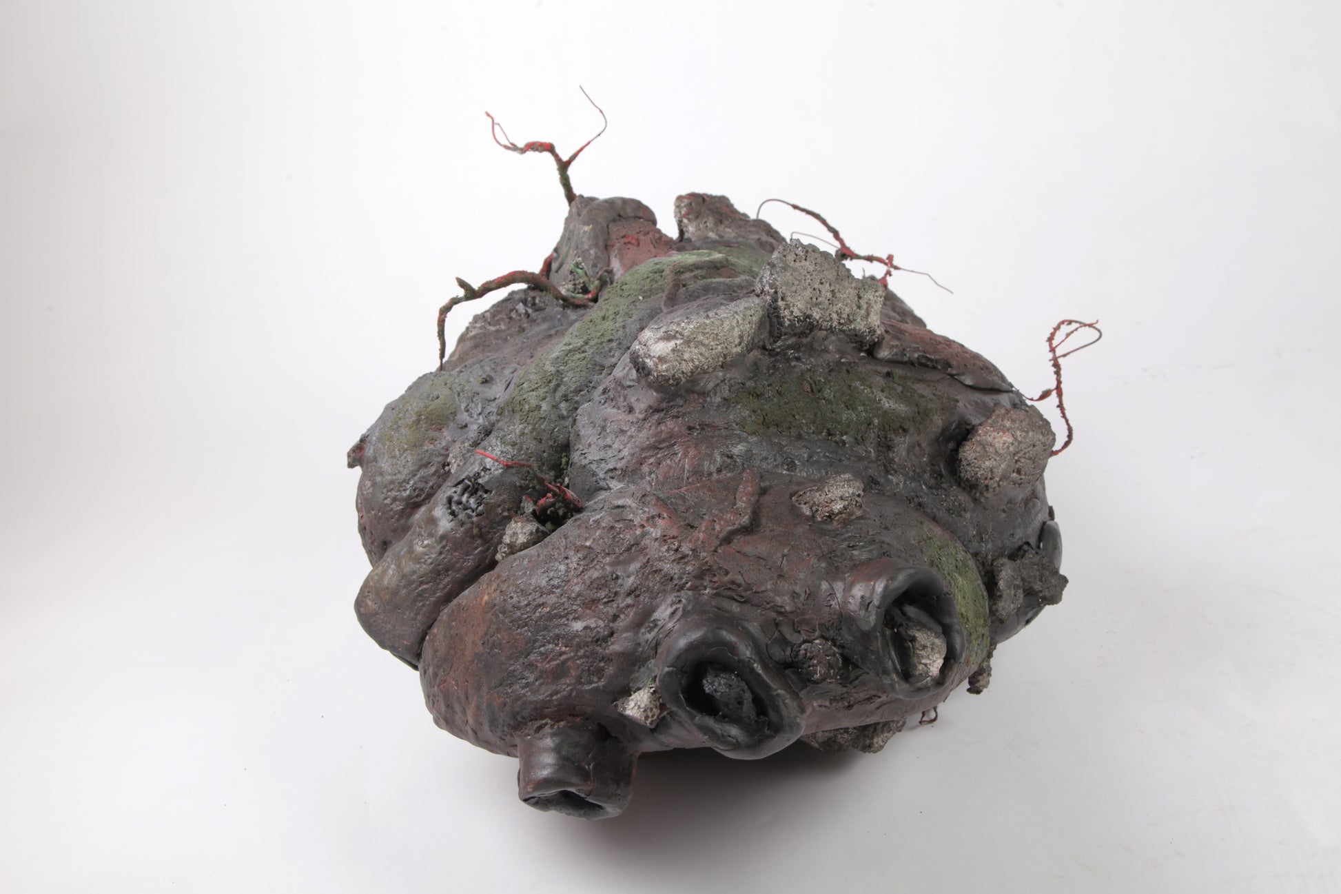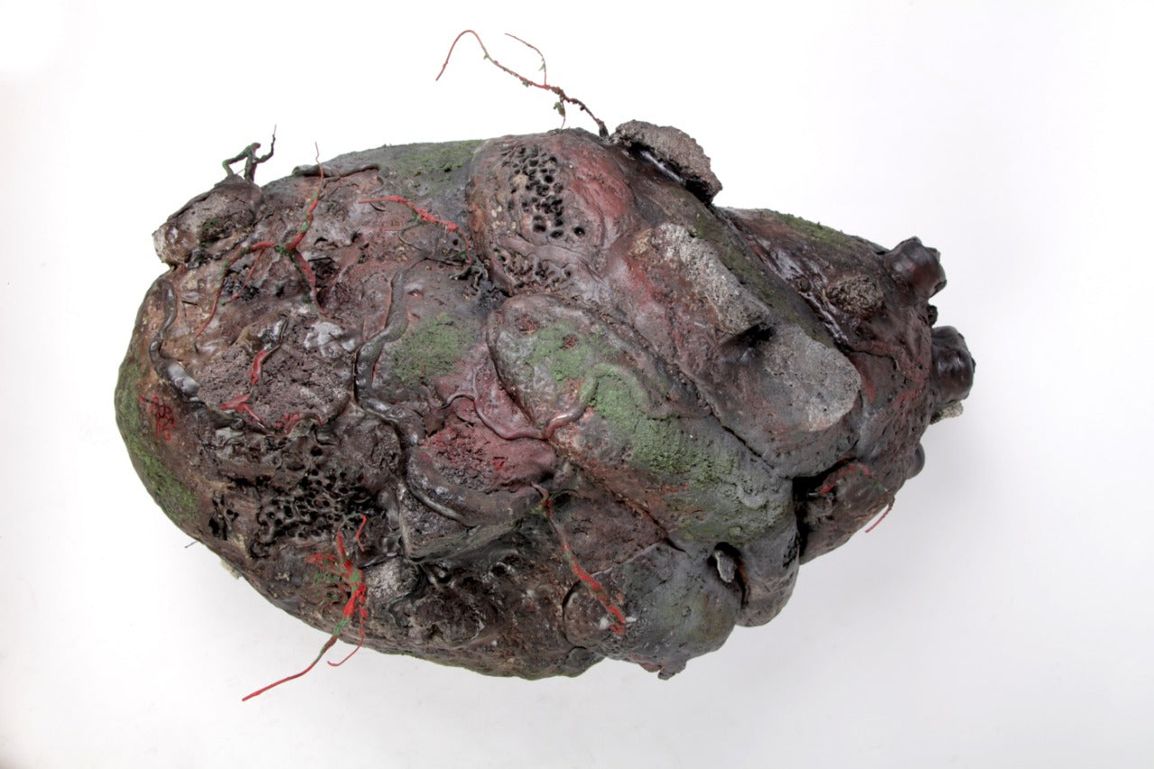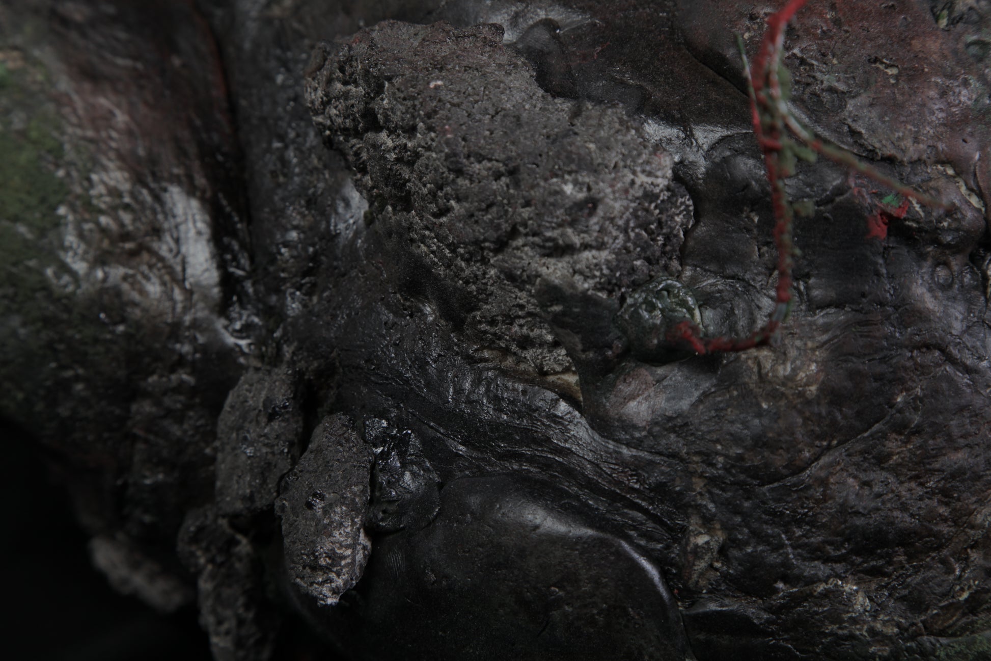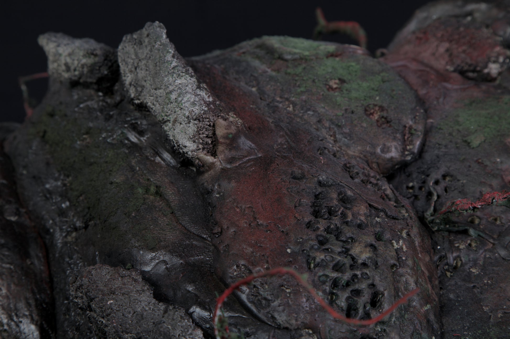 En esta obra represento a un corazón roto, convertido en piedra, que se ha dejado morir cuando se deja inerte, dejándose podrir. Una carga pesada, rupturas por doquier y carne a punto de morir, pero dentro de toda la obscuridad, se encuentran jugando por ahí las venas, mitad vivas, mitad muertas, que nos dejan concluir que, a pesar del moho, hay una vida detrás esperando a ser rescatada, ¿Por quién? Por el amor.