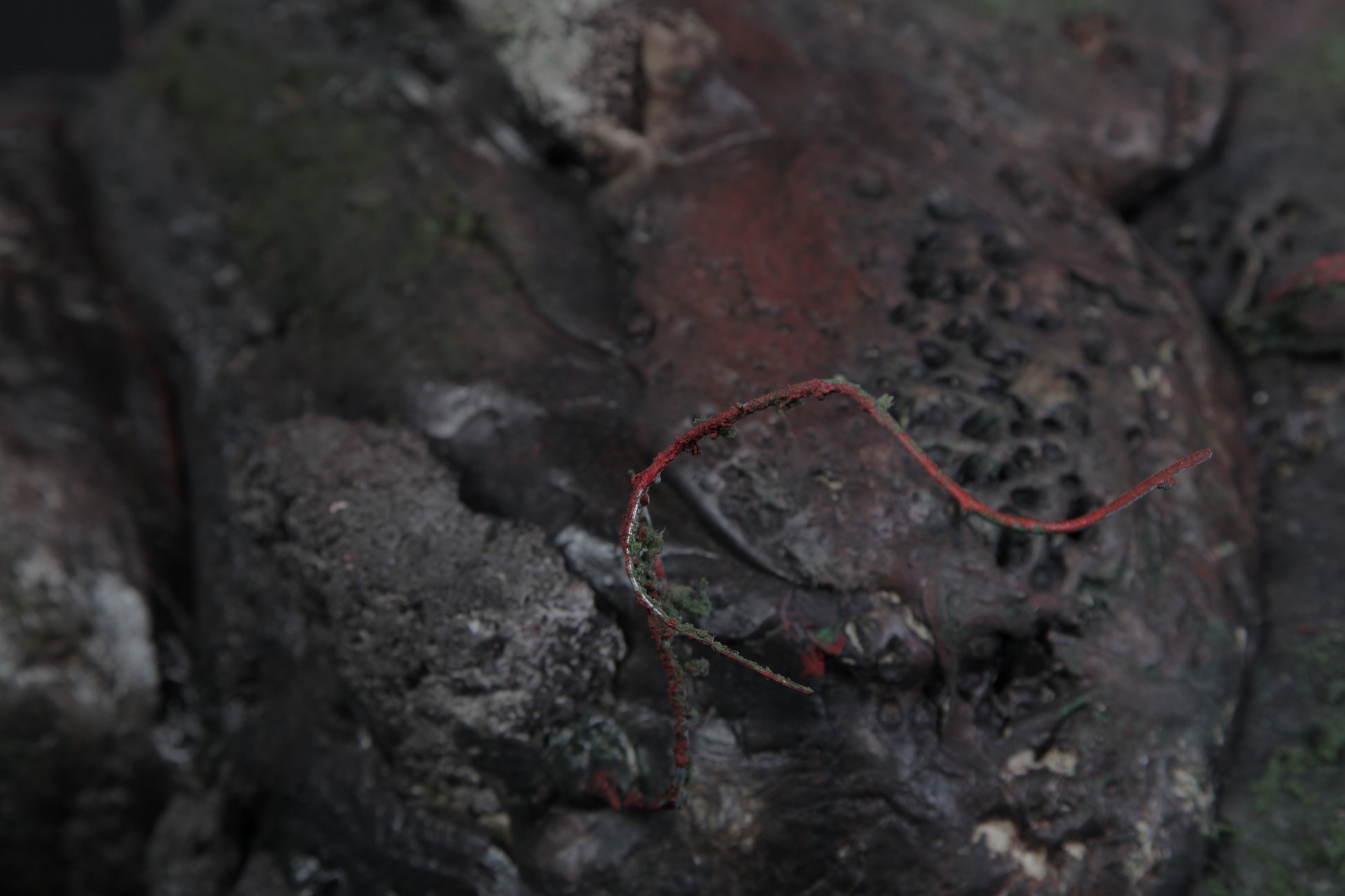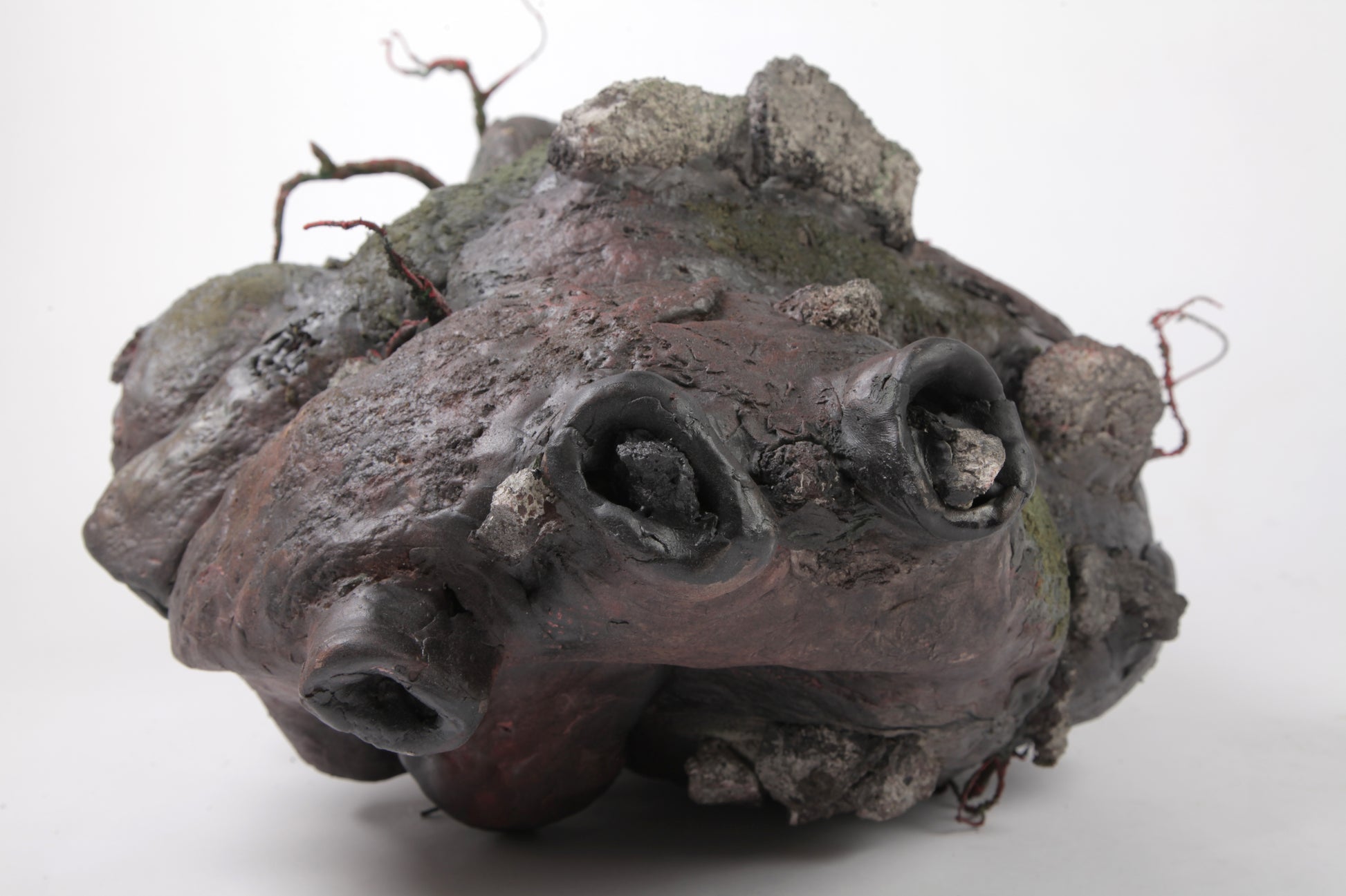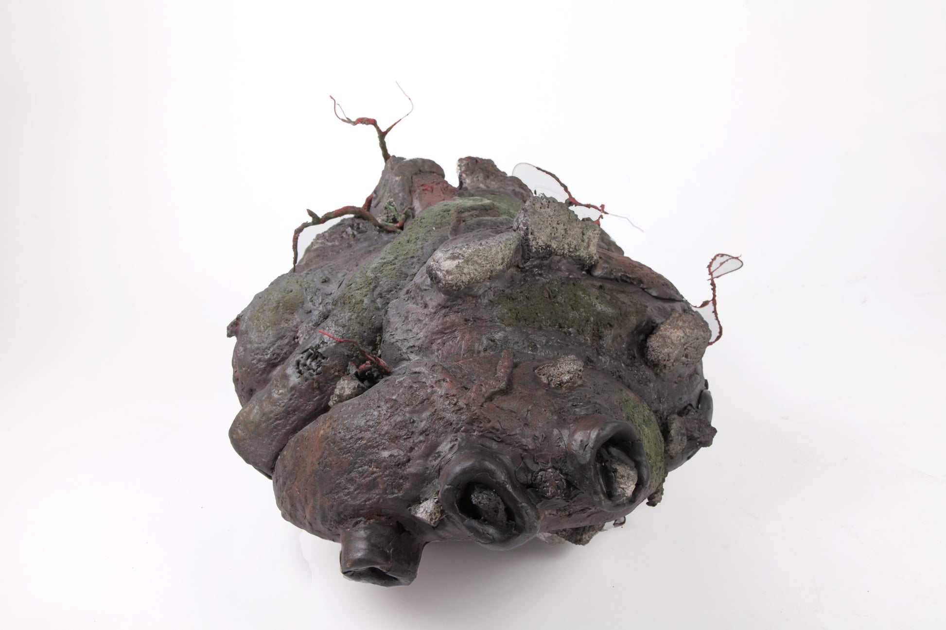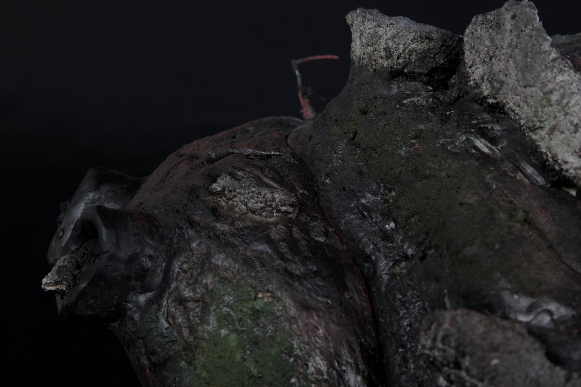 En esta obra represento a un corazón roto, convertido en piedra, que se ha dejado morir cuando se deja inerte, dejándose podrir. Una carga pesada, rupturas por doquier y carne a punto de morir, pero dentro de toda la obscuridad, se encuentran jugando por ahí las venas, mitad vivas, mitad muertas, que nos dejan concluir que, a pesar del moho, hay una vida detrás esperando a ser rescatada, ¿Por quién? Por el amor.