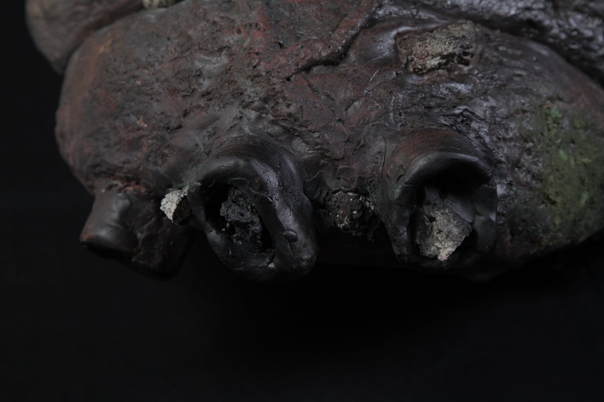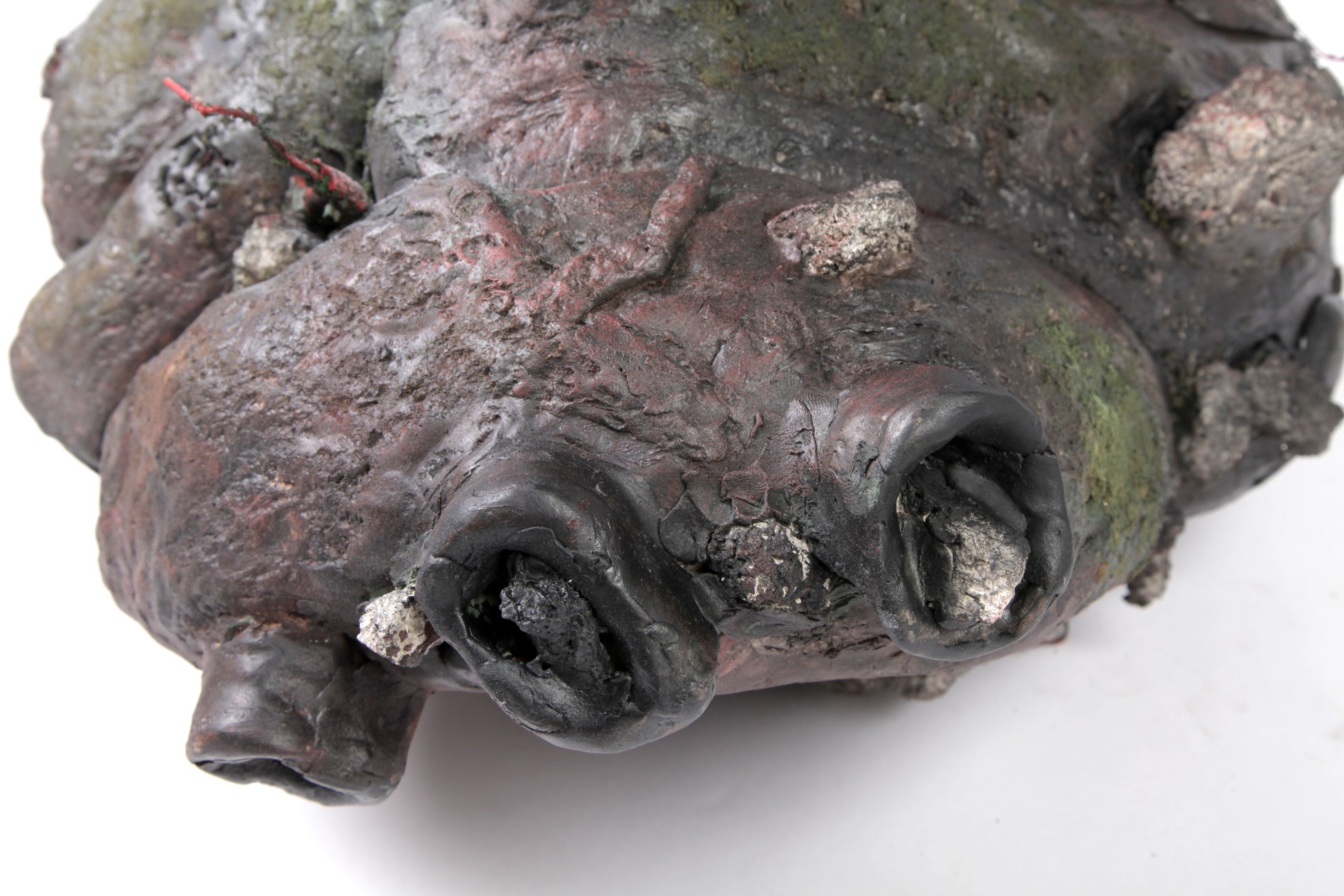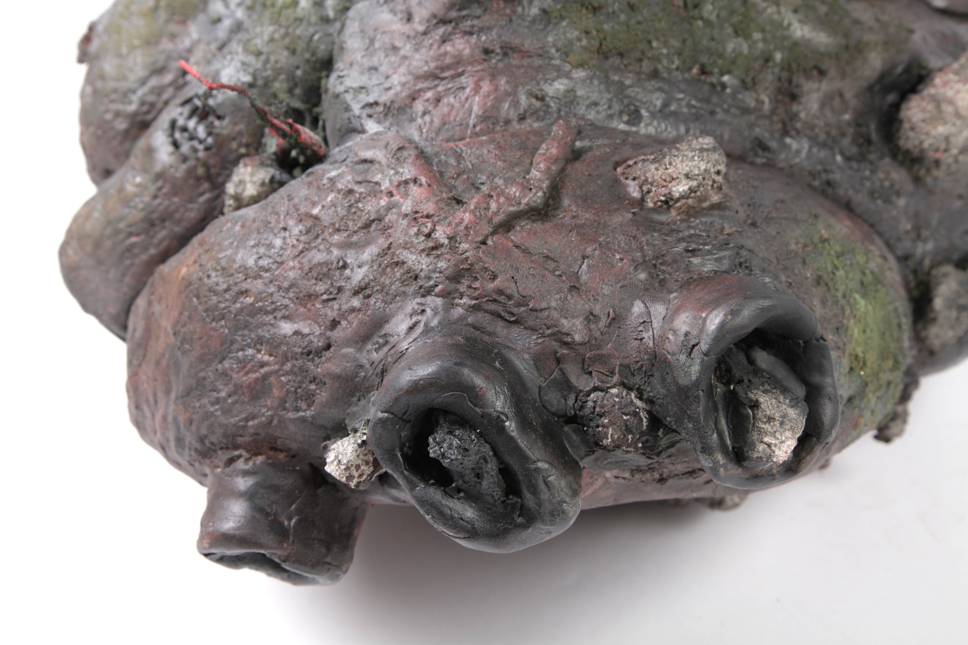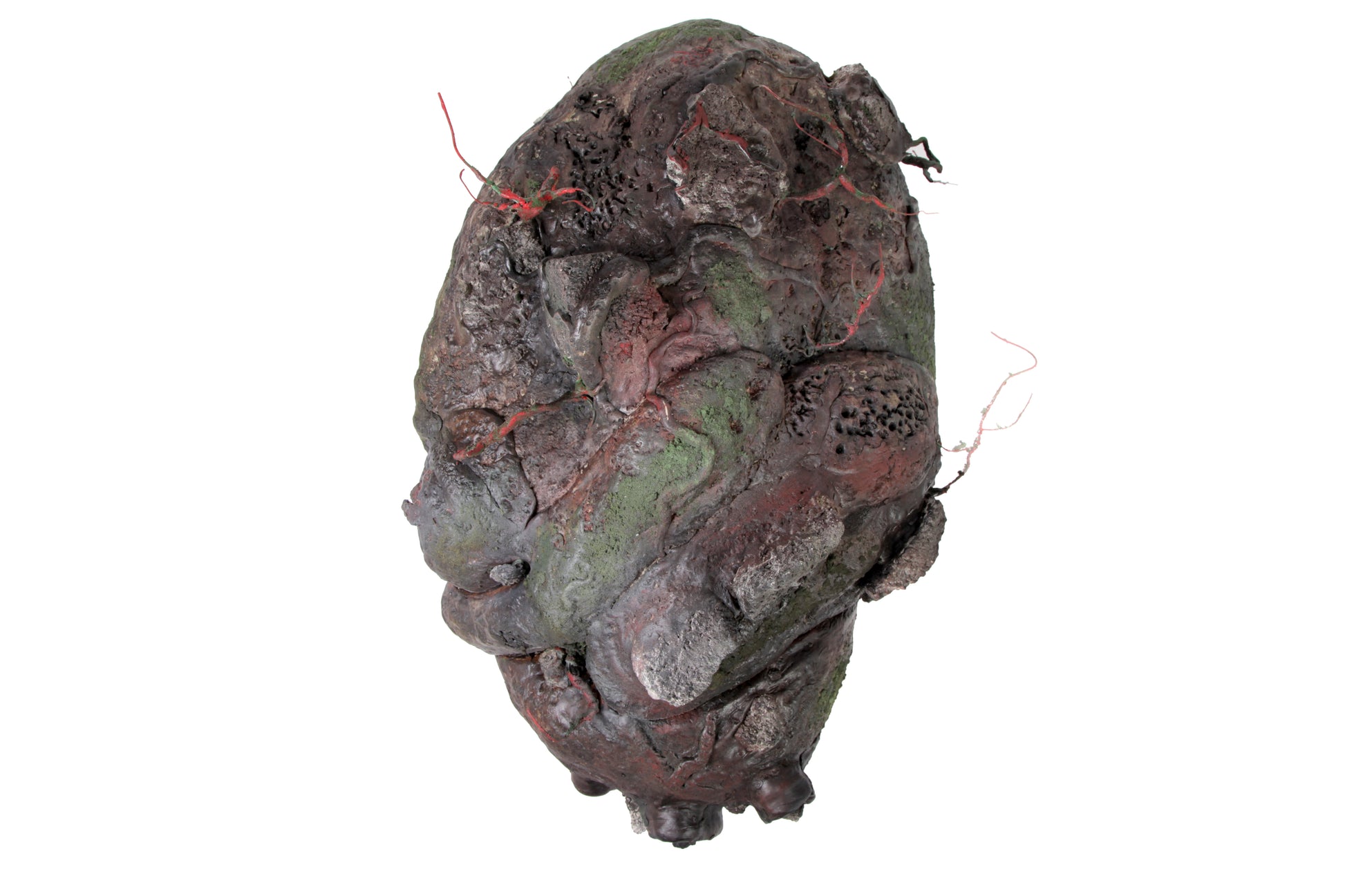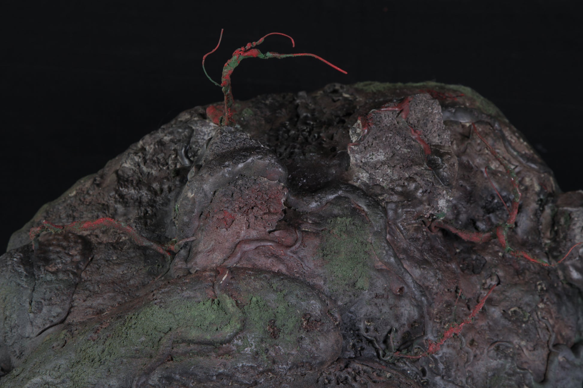 En esta obra represento a un corazón roto, convertido en piedra, que se ha dejado morir cuando se deja inerte, dejándose podrir. Una carga pesada, rupturas por doquier y carne a punto de morir, pero dentro de toda la obscuridad, se encuentran jugando por ahí las venas, mitad vivas, mitad muertas, que nos dejan concluir que, a pesar del moho, hay una vida detrás esperando a ser rescatada, ¿Por quién? Por el amor.