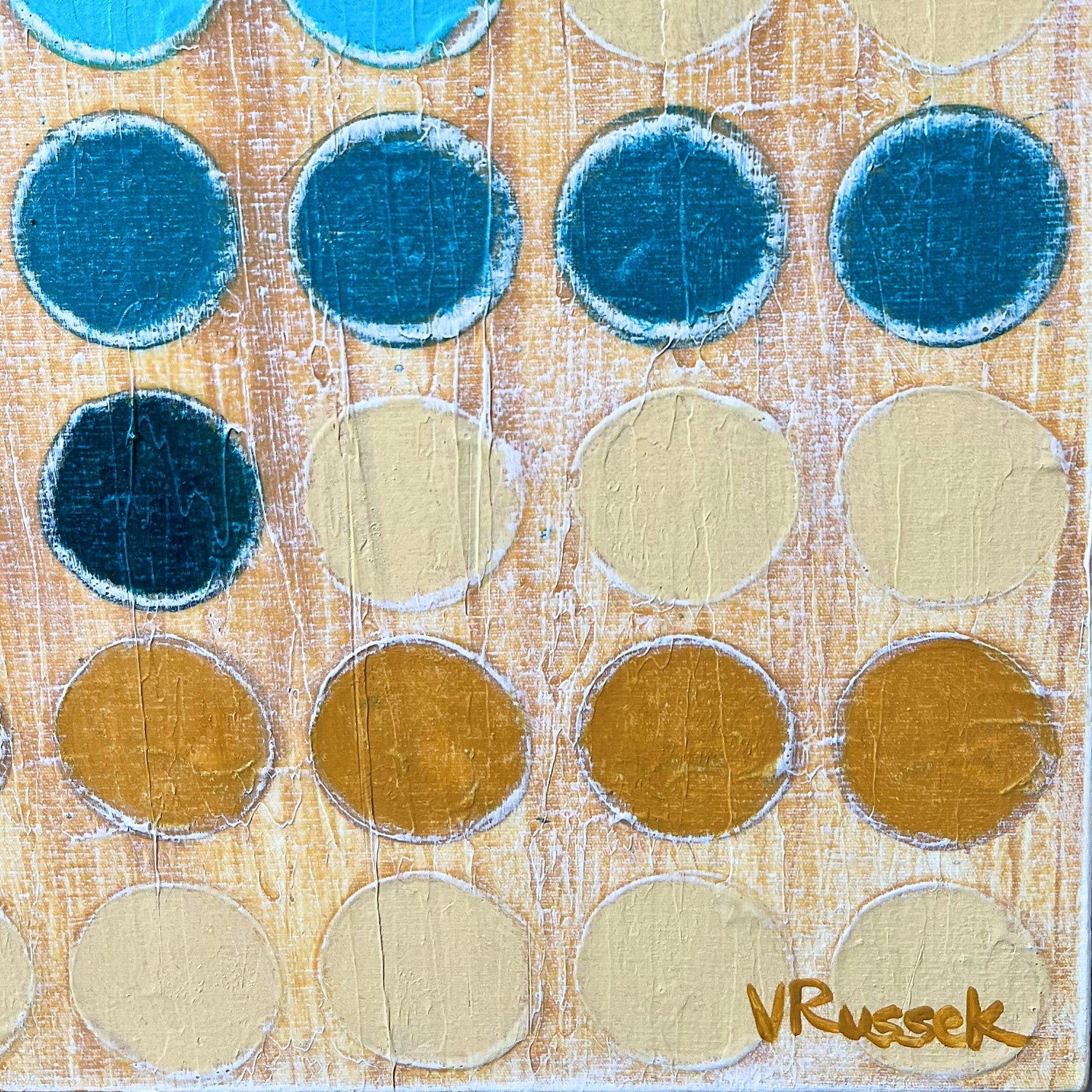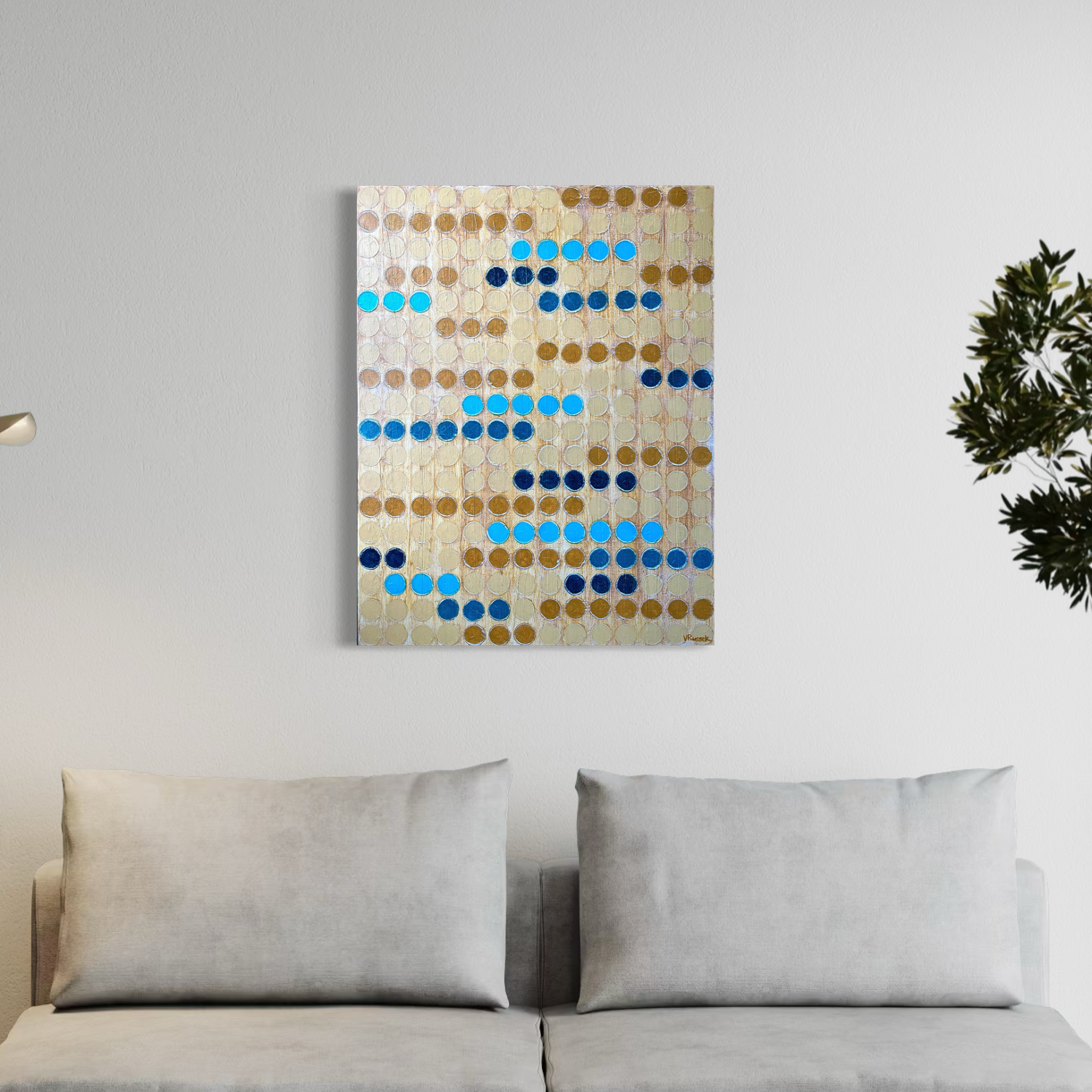 Las lineas punteadas son conecciones invisibles, con movimiento y dinamismo, buscando formar patrones y conecciones permanentes. Esta obra muestra lineas de puntos en colores amarillos ocres y turquesas, los cuales le dan frescura y mucho aire. Esta pintada con capas y veladuras que le dan domensión y profundidad, además de texturas.