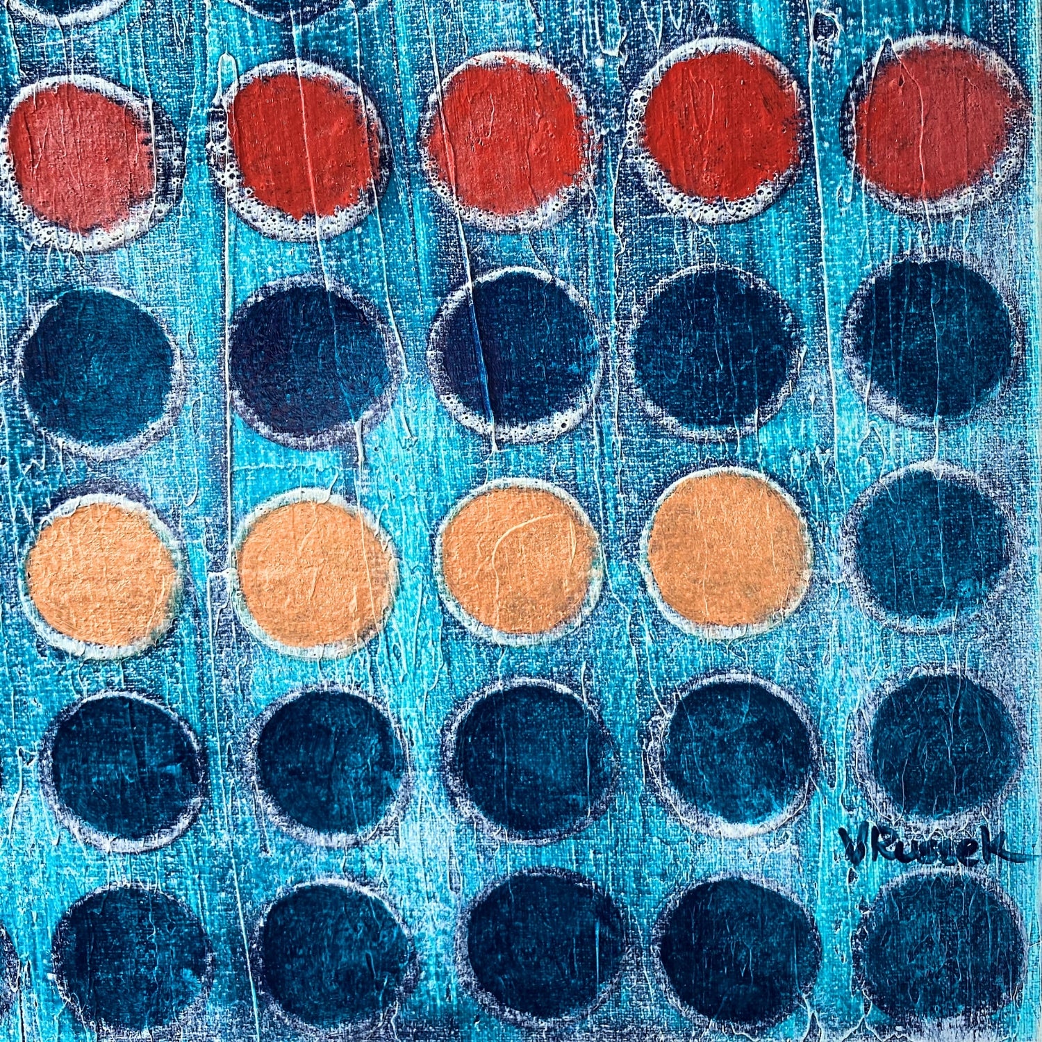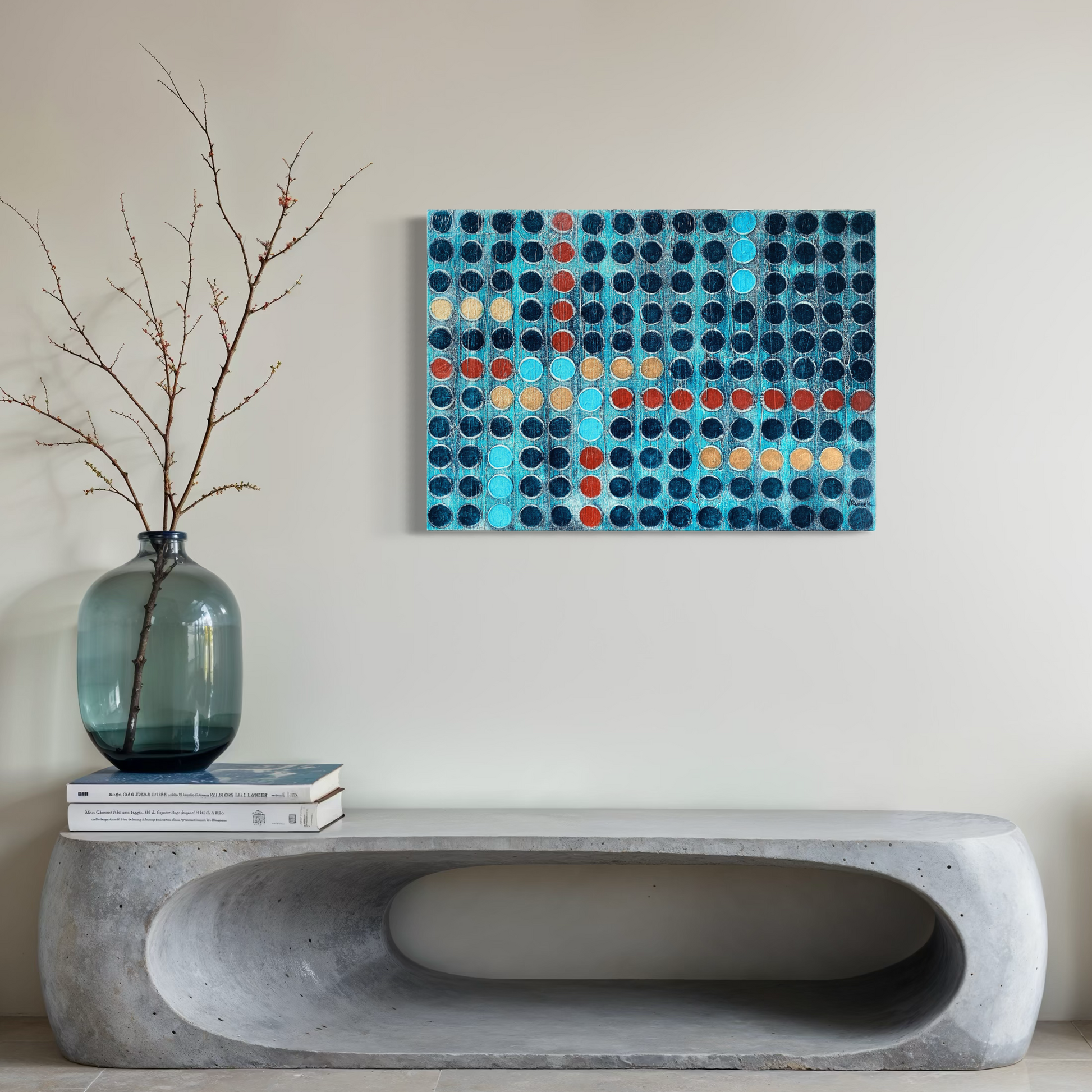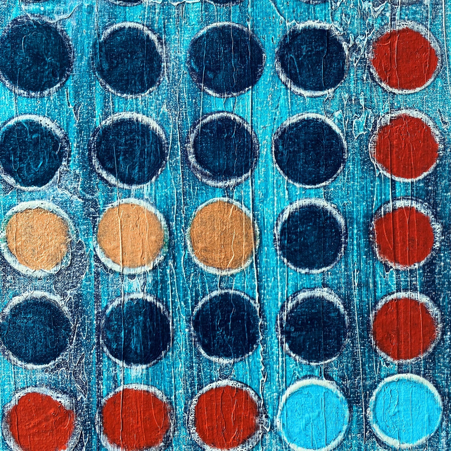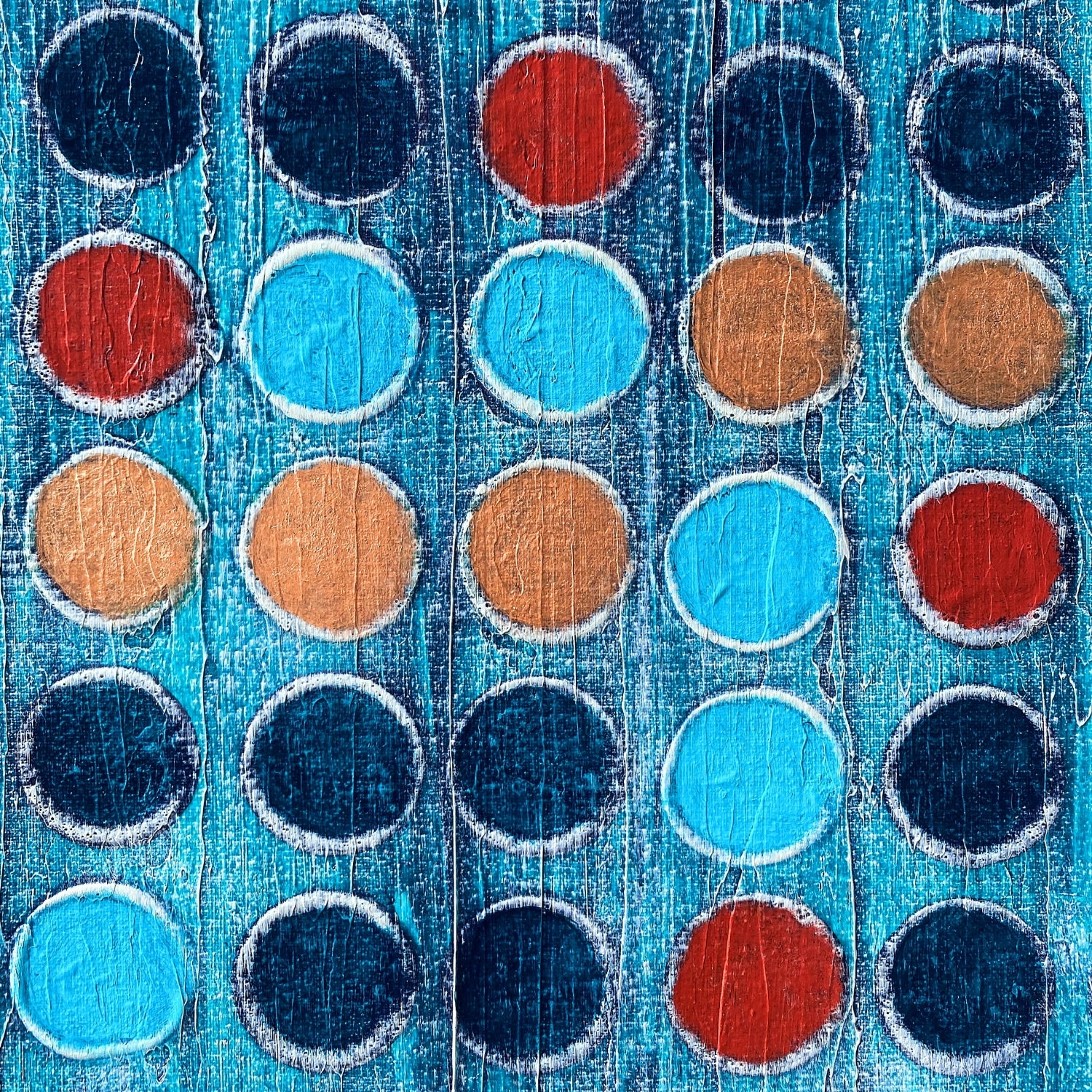 Obra abstracta hecha con círculos dispuestos en una retícula, con líneas en colores contrastantes y complementarios. La obra tiene varias capas de color y textura para darle dimensión y complejidad.