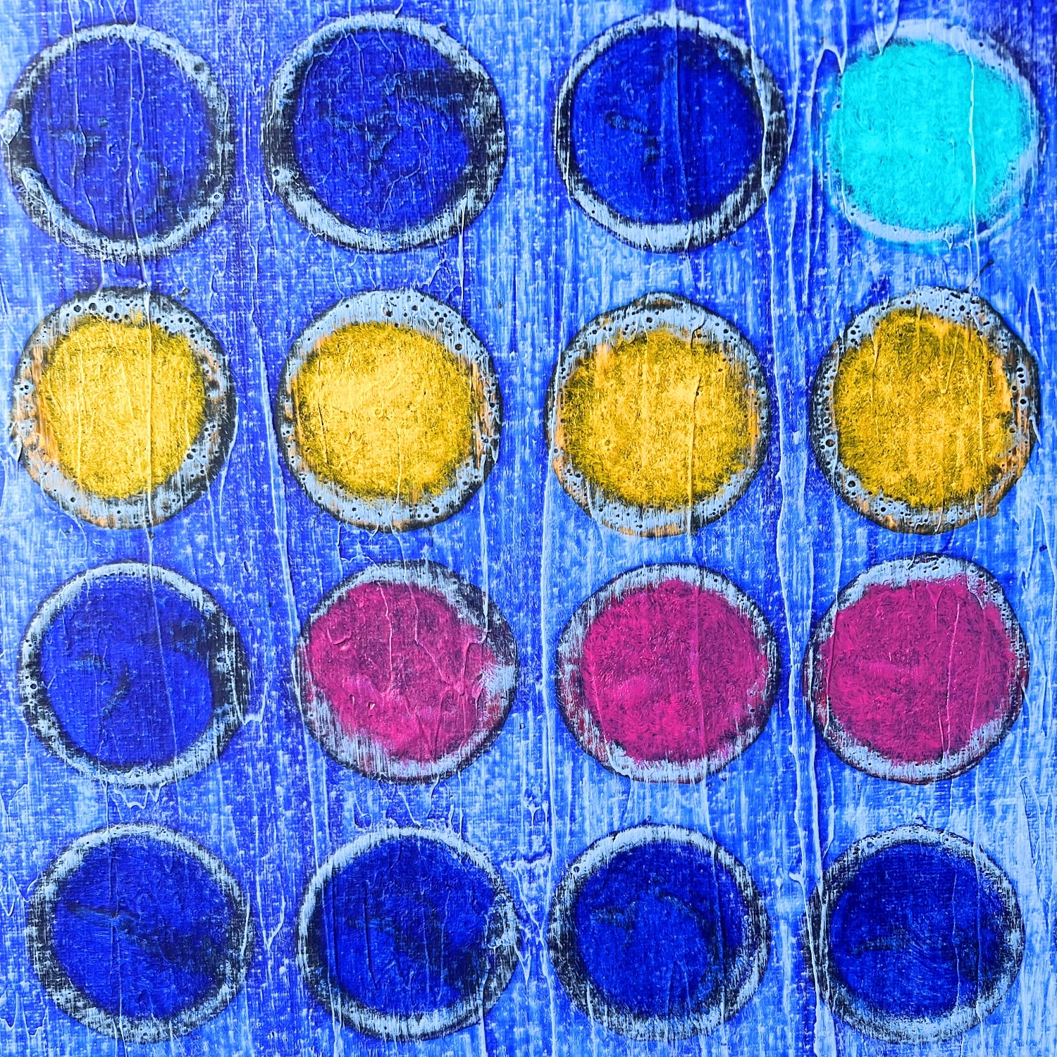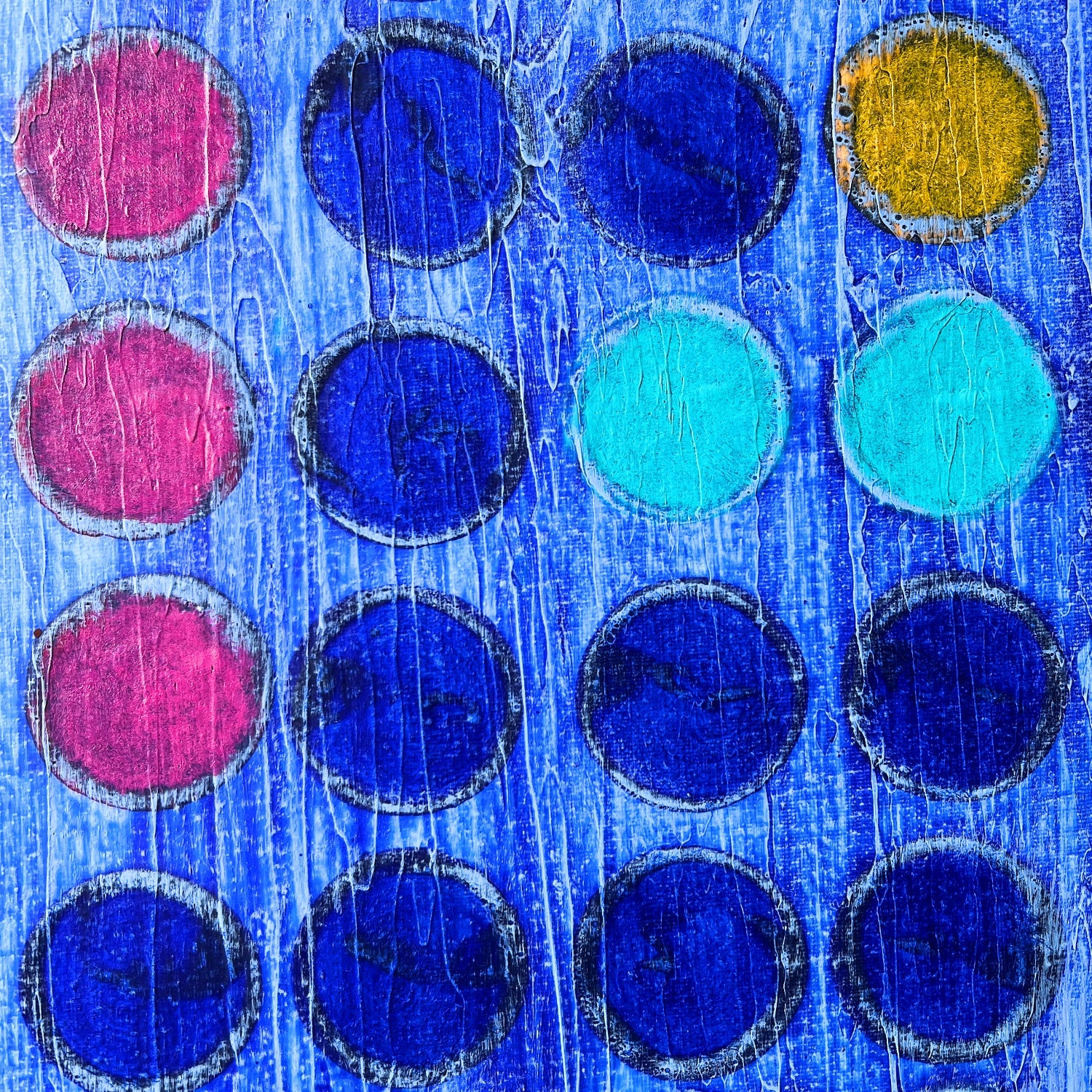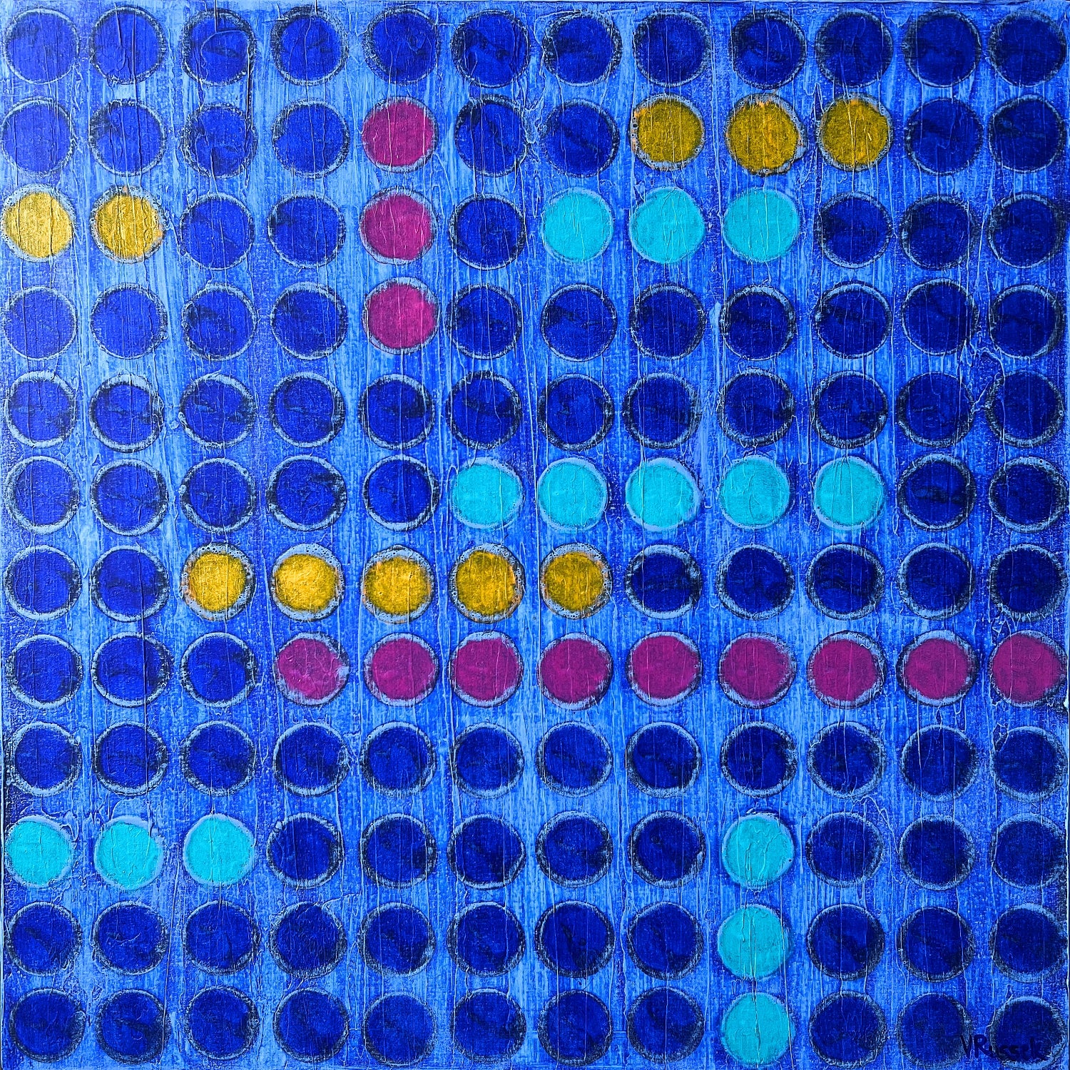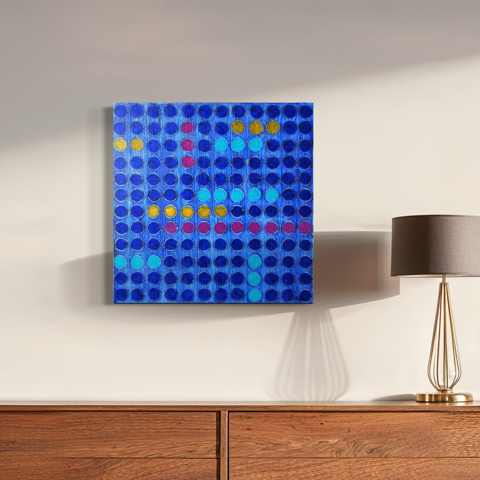 En esta obra juego con una retícula de puntos en tonos azules profundos, interrumpida por destellos de color que marcan un ritmo visual. Es una pintura que habla de movimiento, de pausas y repeticiones, como si los puntos fueran notas en una partitura. Me gusta cómo los contrastes de color generan una energía vibrante, casi musical, dentro de una estructura aparentemente ordenada.