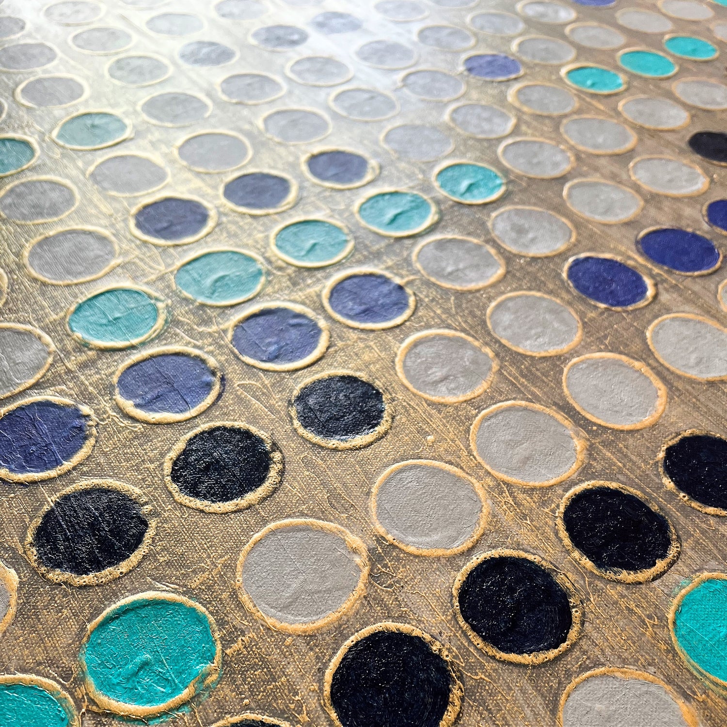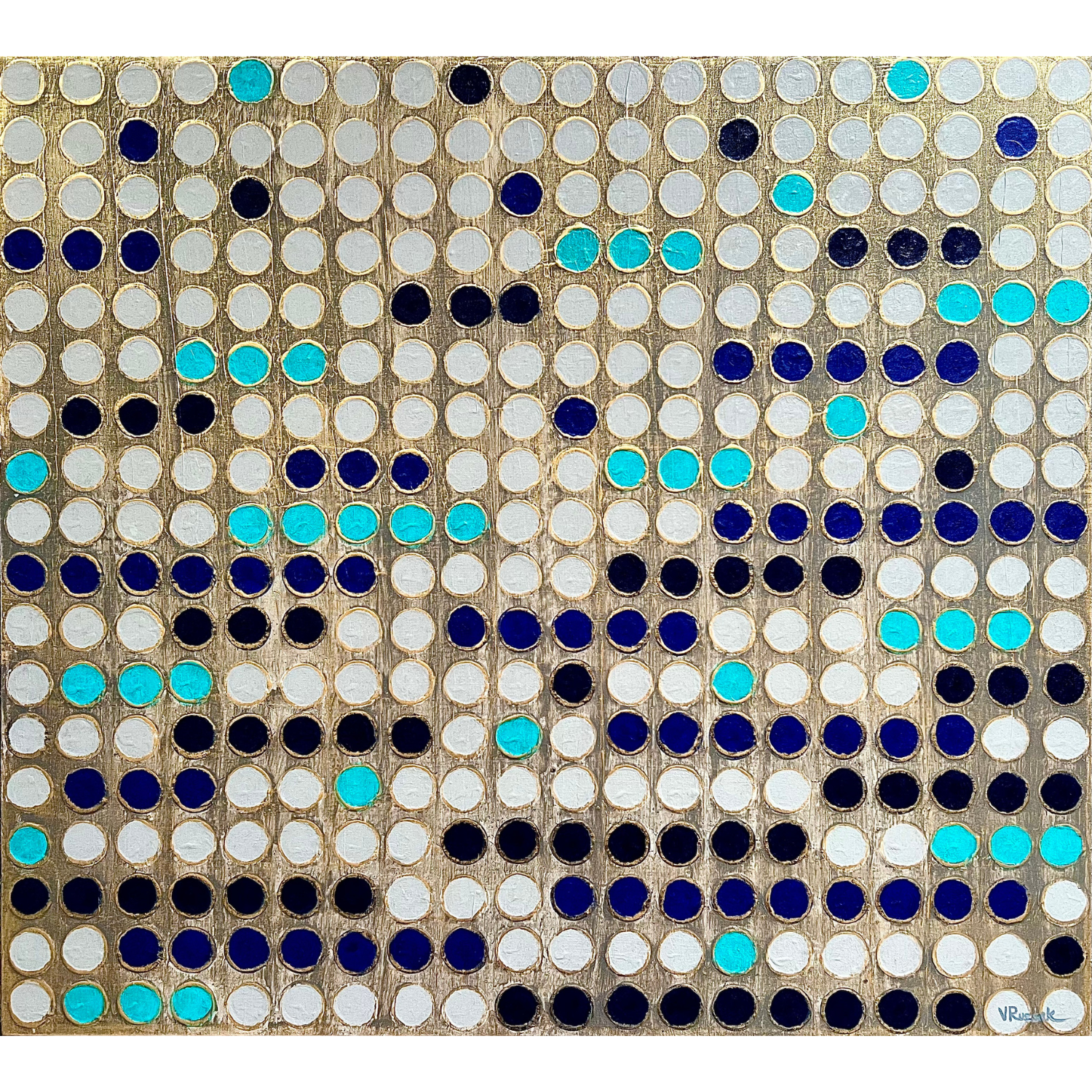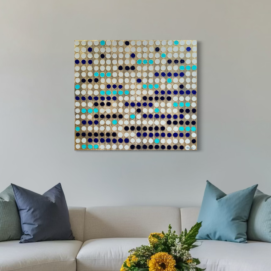 En esta obra, exploro la idea de ritmo y conexión a través de una retícula de puntos. Cada círculo, cuidadosamente pintado, forma parte de una estructura que parece vibrar entre el orden y el movimiento. Los tonos azul turquesa y azul profundo contrastan con el fondo dorado, evocando una sensación de energía y equilibrio.