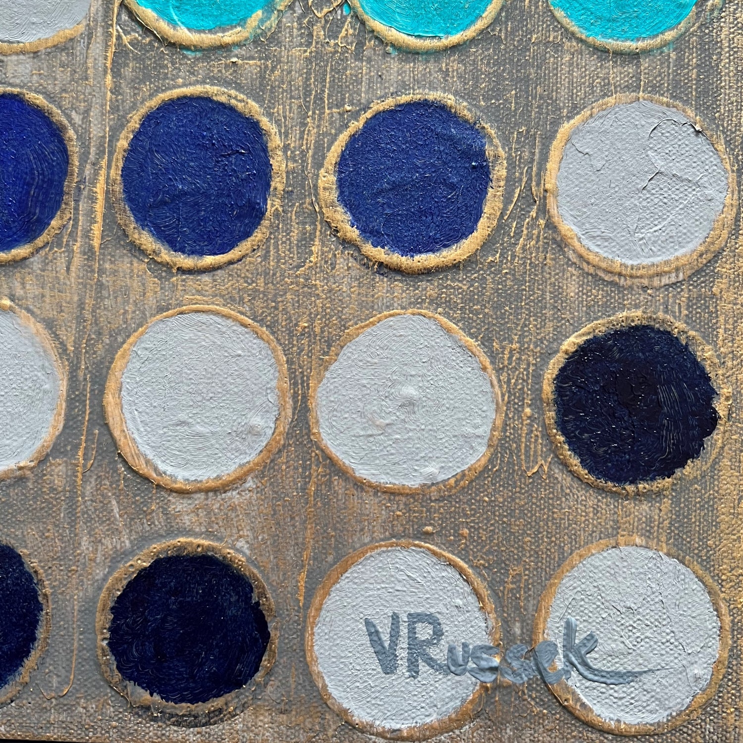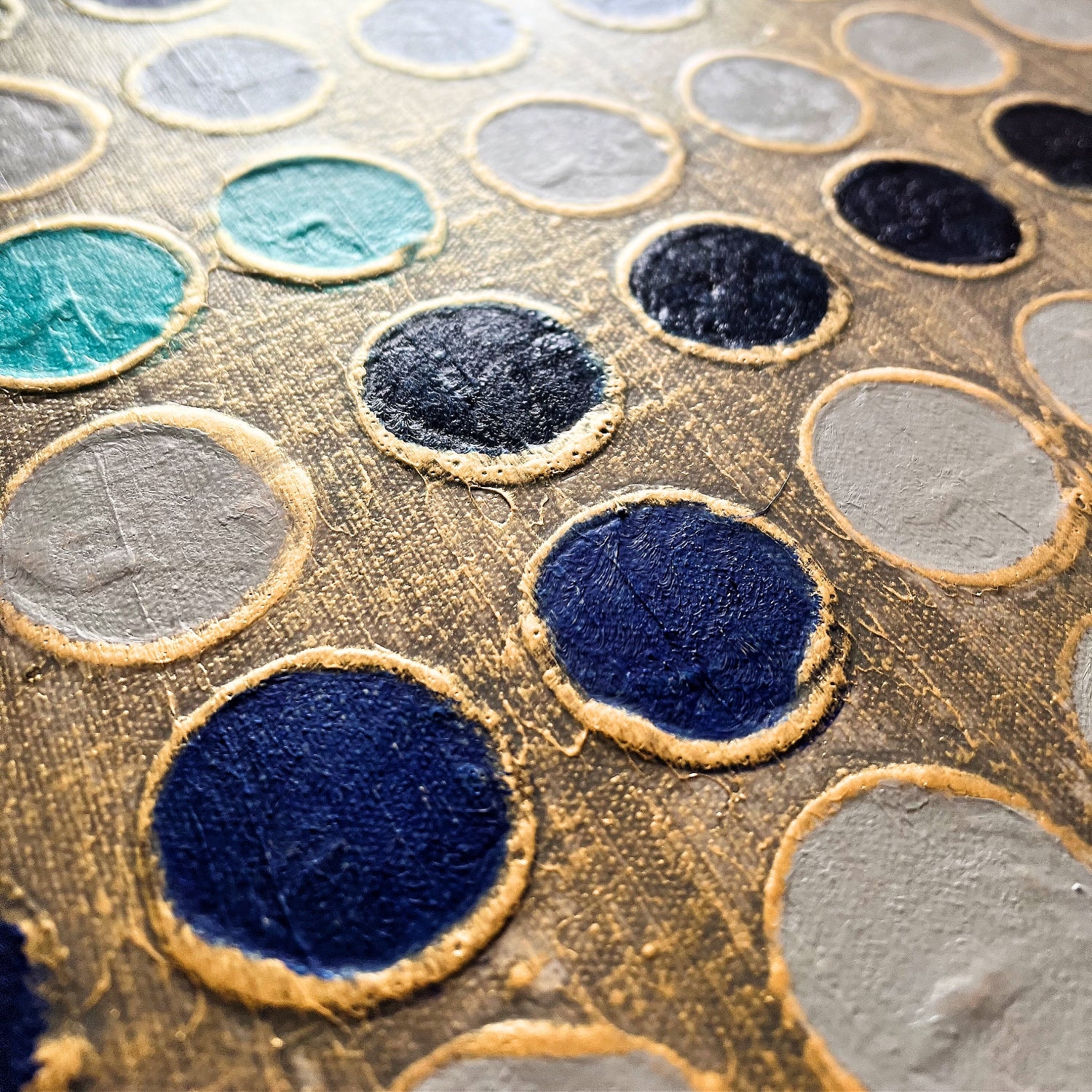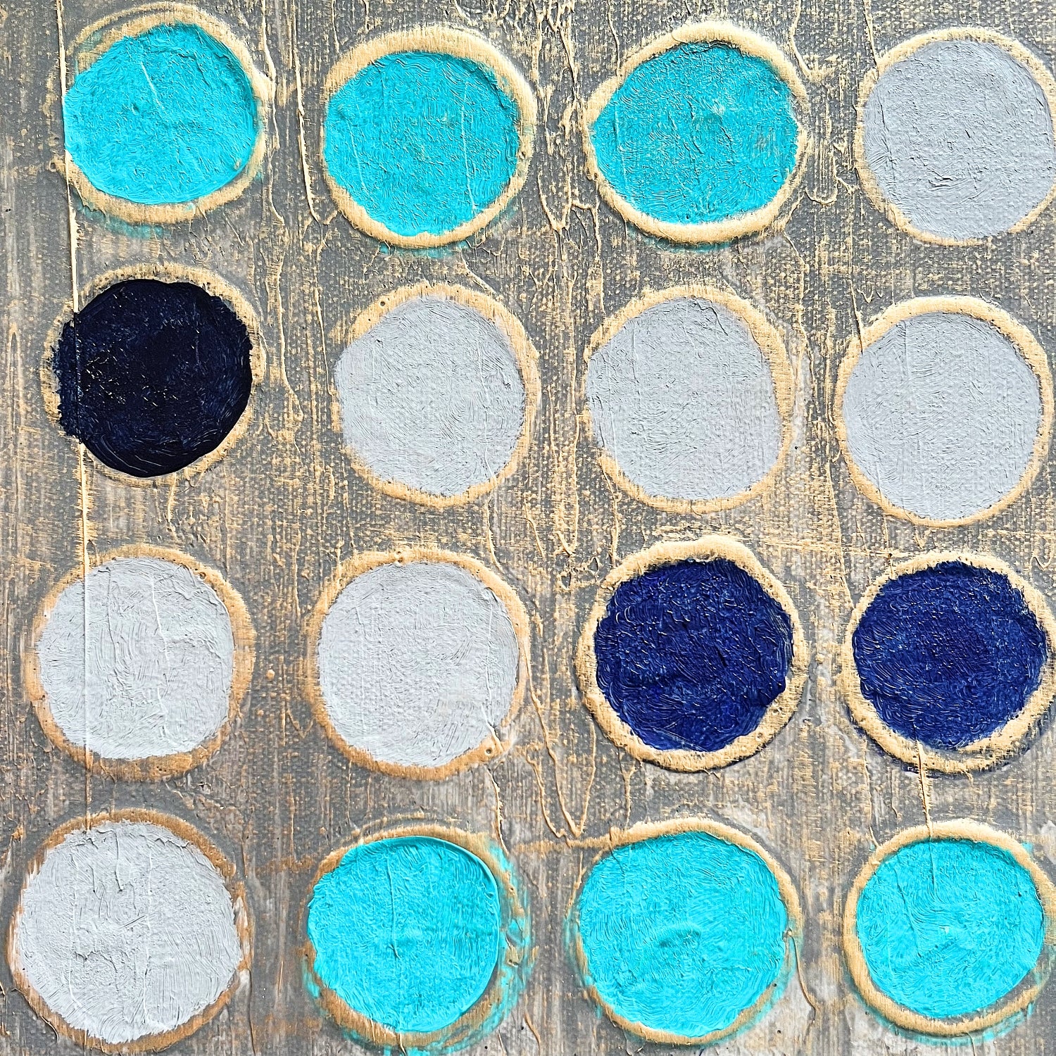 En esta obra, exploro la idea de ritmo y conexión a través de una retícula de puntos. Cada círculo, cuidadosamente pintado, forma parte de una estructura que parece vibrar entre el orden y el movimiento. Los tonos azul turquesa y azul profundo contrastan con el fondo dorado, evocando una sensación de energía y equilibrio.