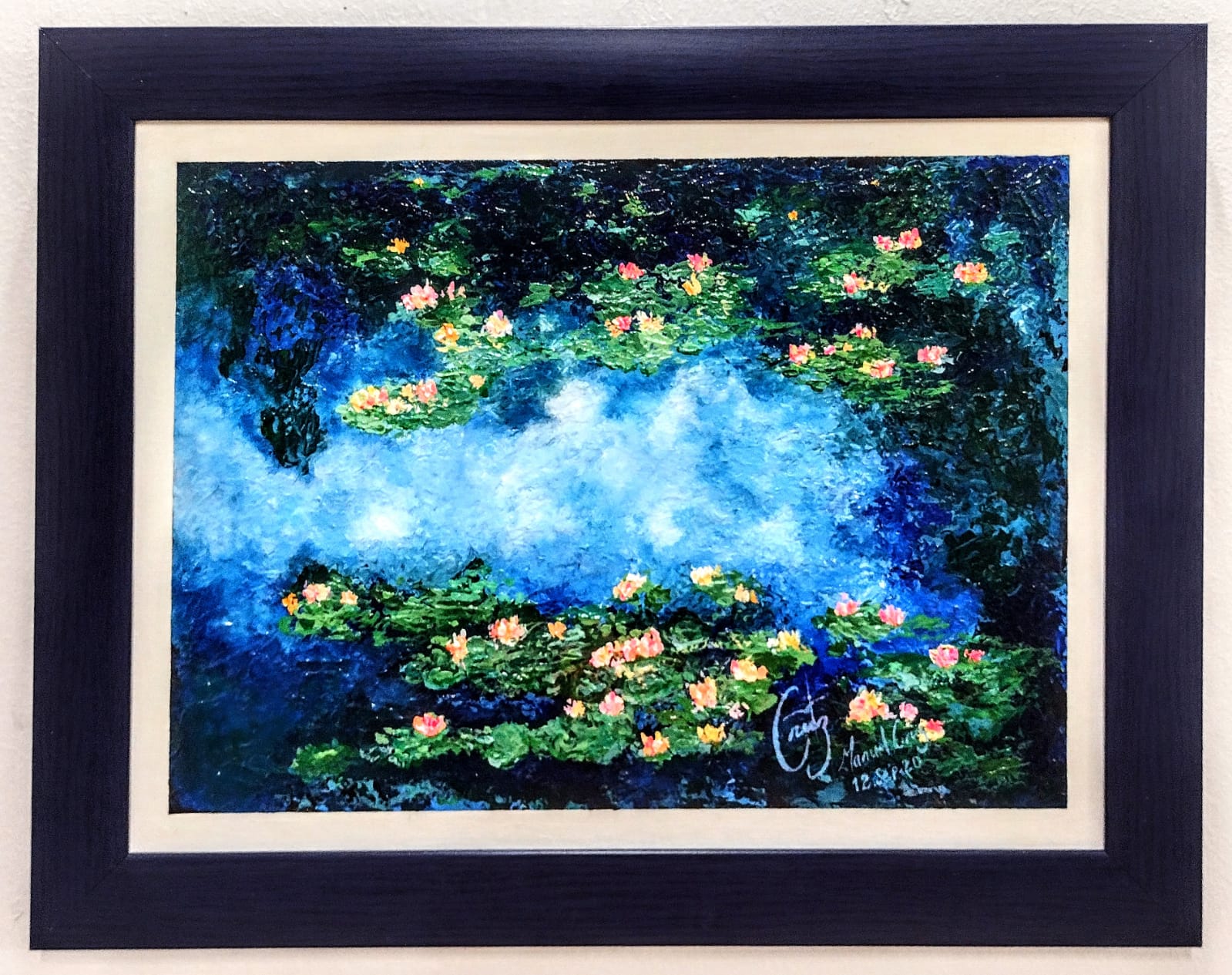 Acrílico sobre papel lienzo, marco azul tipo madera