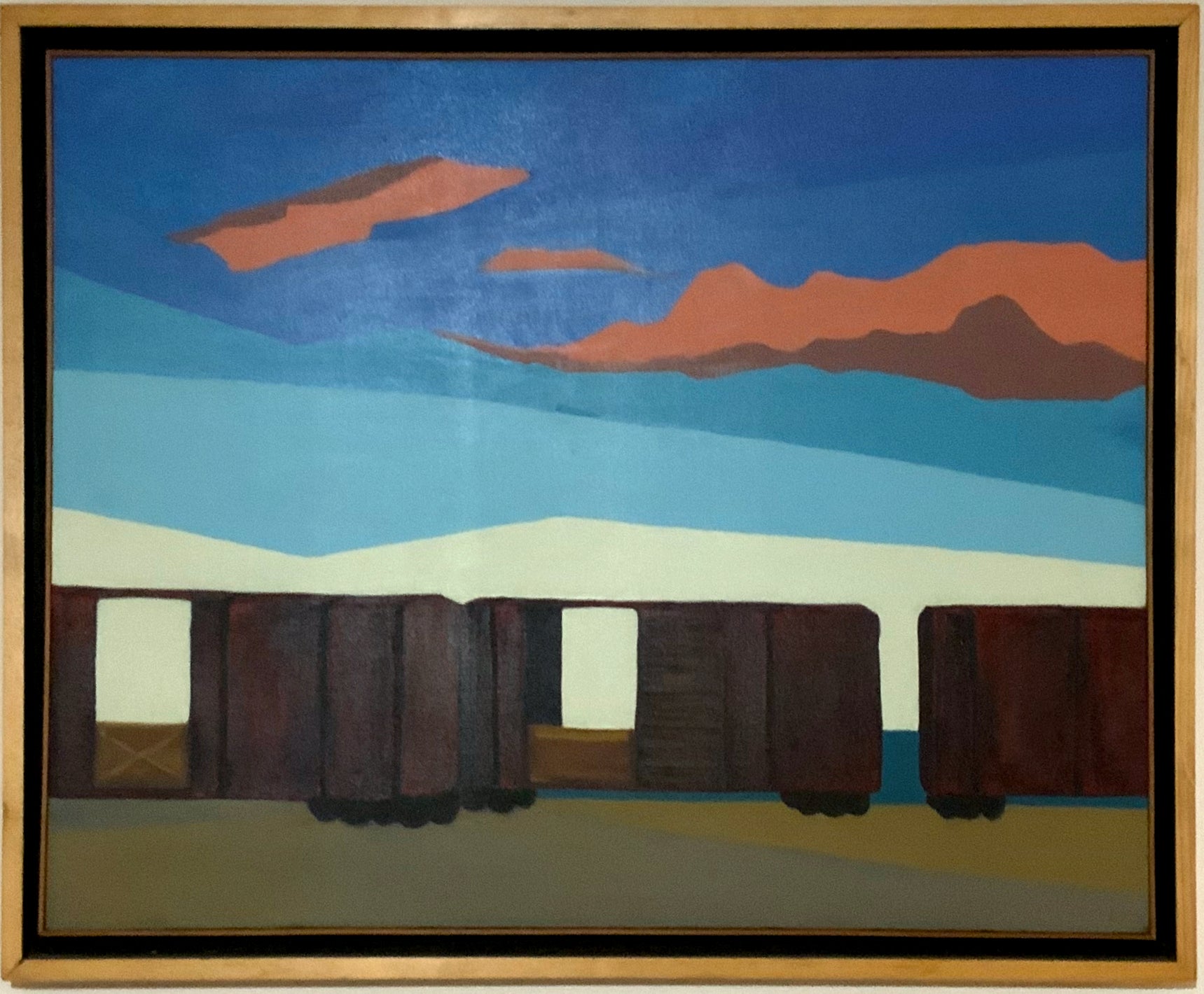 | Un tren de carga llega a descargar en un día muy soleado. Está pintado en zonas geométricas de colores intensos. |