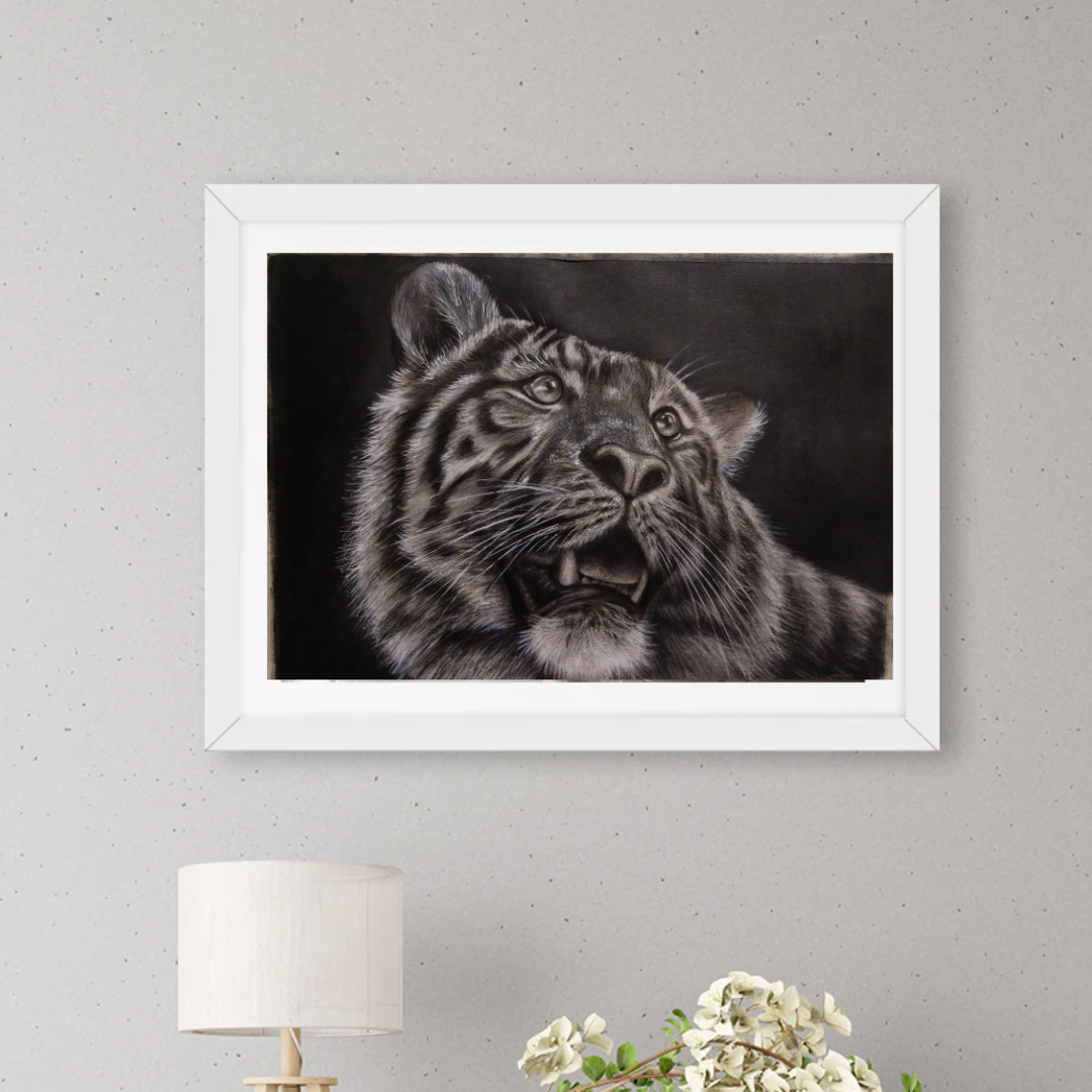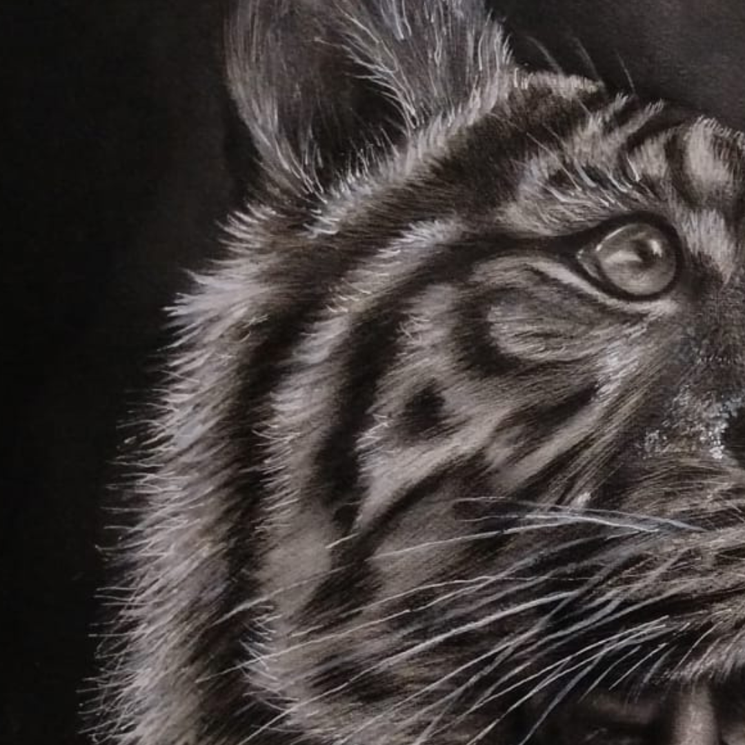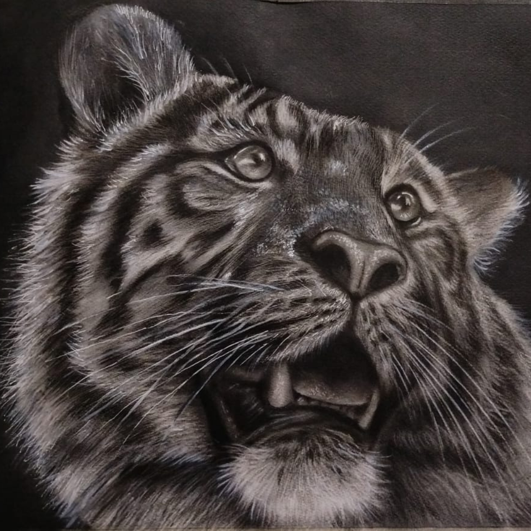 En la obra “LLENO DE JADEOS” vemos la figura de una tigre, el cual se encuentra jadeando, este bello animal principalmente jadea para regular su temperatura corporal así como también por ira o ansiedad. Es por ello que si interpretamos al tigre como esa ira, ansiedad o agotamiento en nuestras vidas, entenderíamos que cada jadeo es la manifestación física de esa emoción al intentar mantener esa lucha interna que se experimenta al enfrentar desafíos o al tratar de controlar impulsos o emociones o al sentir la sensación de agotamiento para mantener a raya algo poderoso dentro de nosotros mismos.