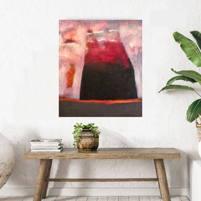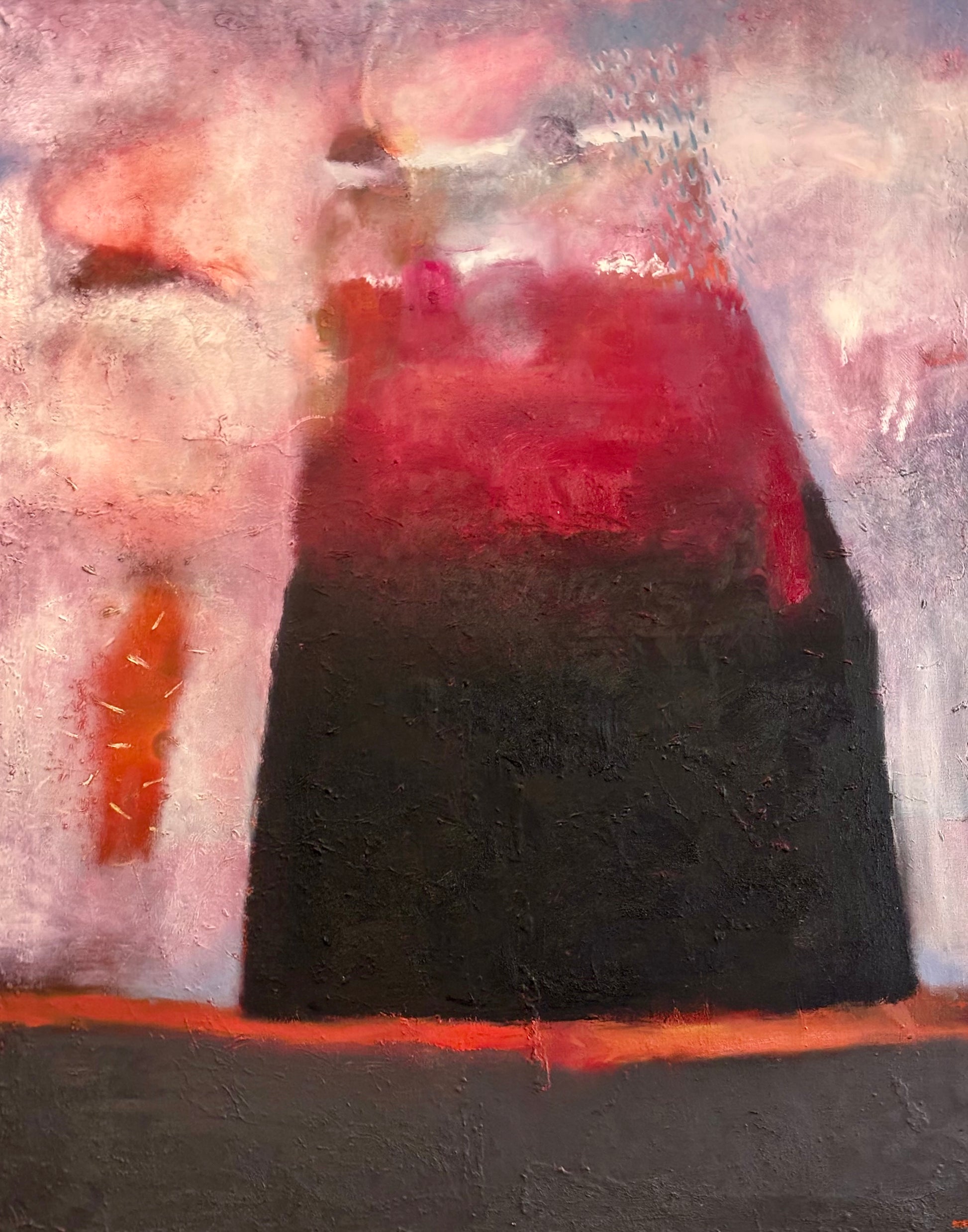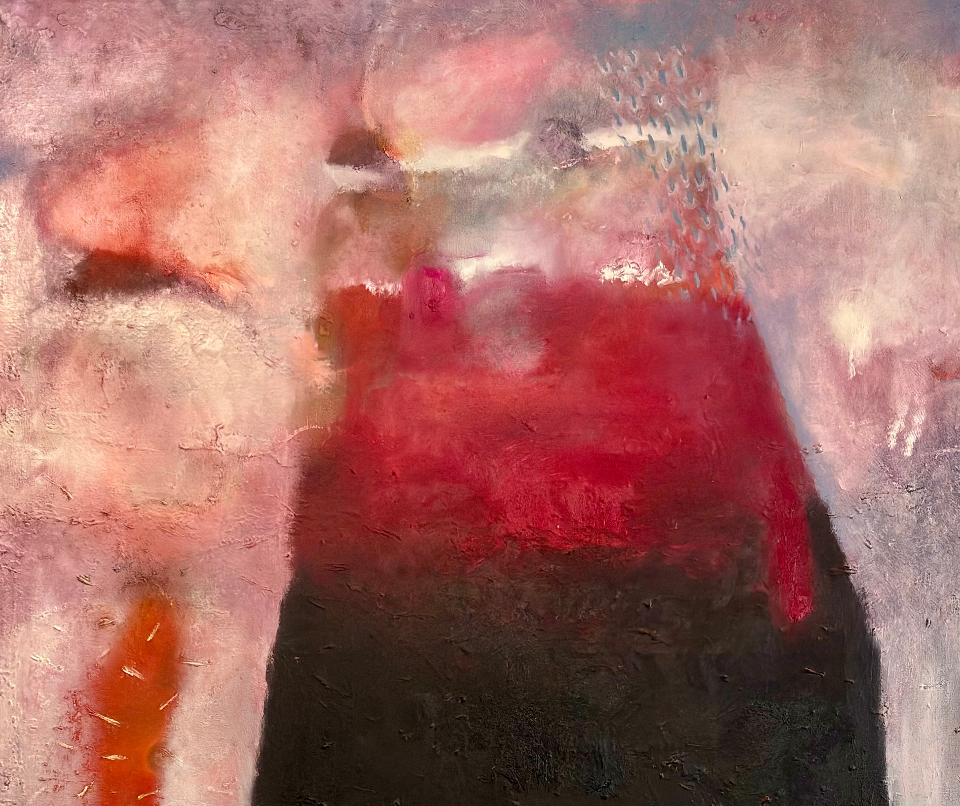 "Lluvia sobre el volcán" es un cuadro semiabstracto que transmite la fuerza y el dramatismo de un volcán bajo una tormenta. La base negra actúa como el cimiento sólido y profundo de la obra, evocando la tierra oscura y el manto volcánico. Desde esta base, emerge un ambiente etéreo que domina el lienzo con una atmósfera vibrante, invitando al espectador a adentrarse en el poder transformador de la naturaleza.