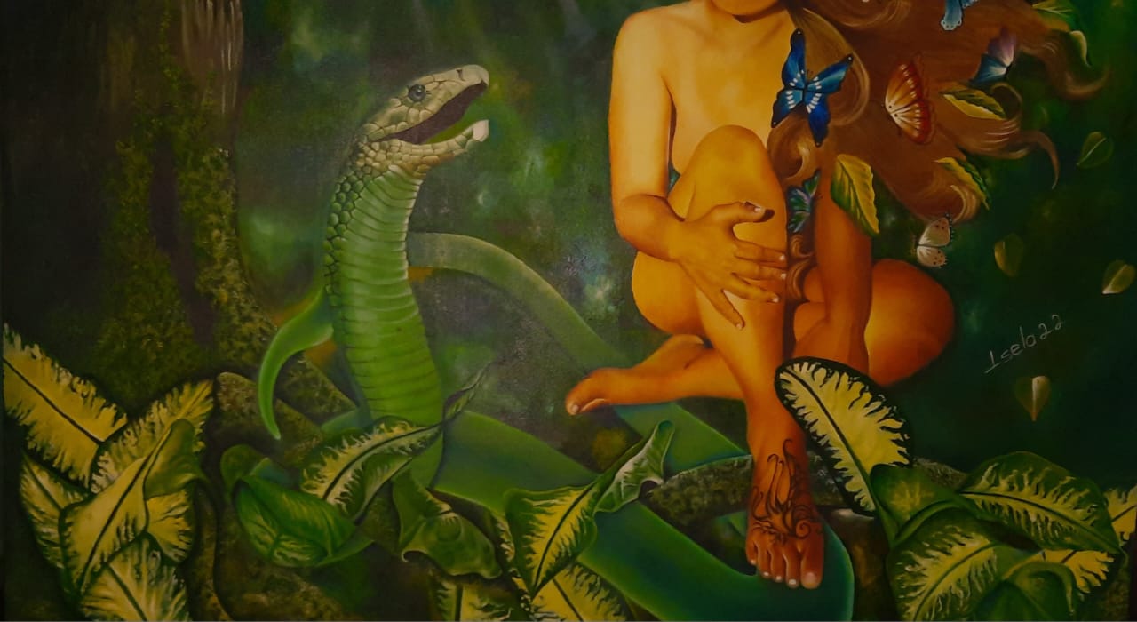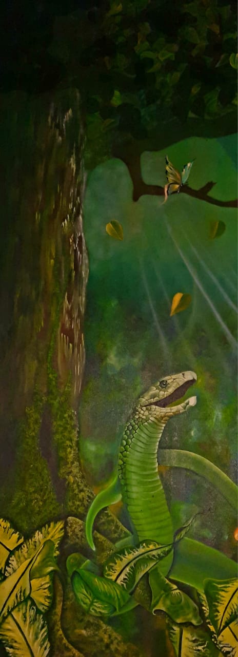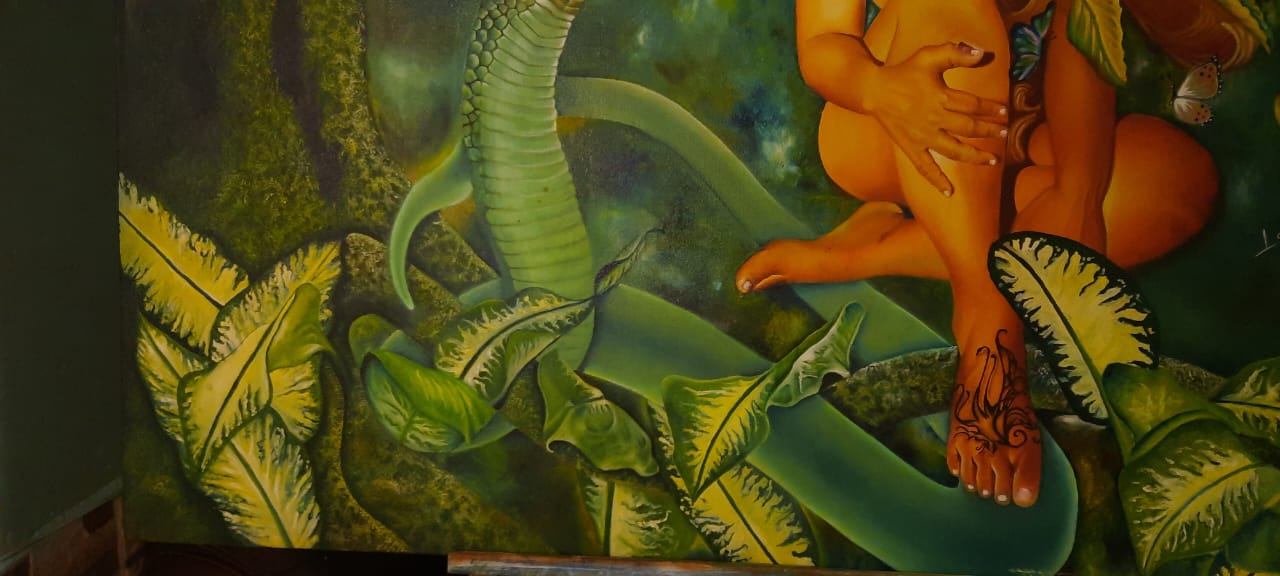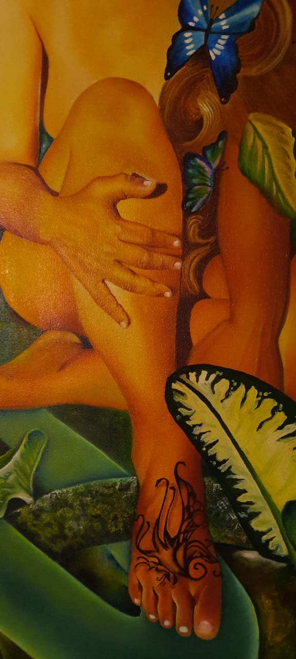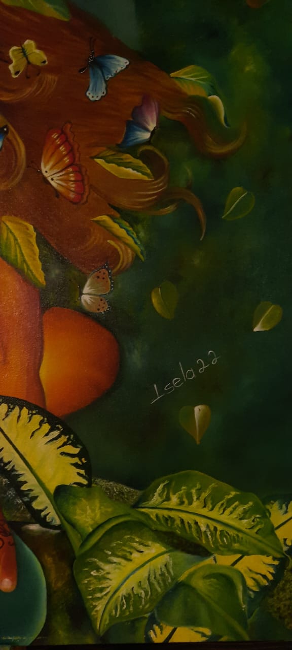 Lo que el viento se llevó es una pintura al óleo sobre tela de gran formato. La paleta se compone de azules, amarillos, bermellón y sombras tostadas, además de blanco de titanio. La figura principal es una mujer desnuda. Su cabello juega con el viento mientras se viste con mariposas. Una serpiente, fuerte símbolo de transformación y cambio, la acompaña en su transición. Un árbol con musgo es el silente cómplice de la escena. Al fondo, un bosque misterioso cubierto de neblina señala la lejanía del paisaje cuya neblina arropa los cambios profundos para dar paso a la claridad. En primer plano hay unas hojas grandes, vivas y fertes que crecen entre las raíces del árbol enmarcando la obra.