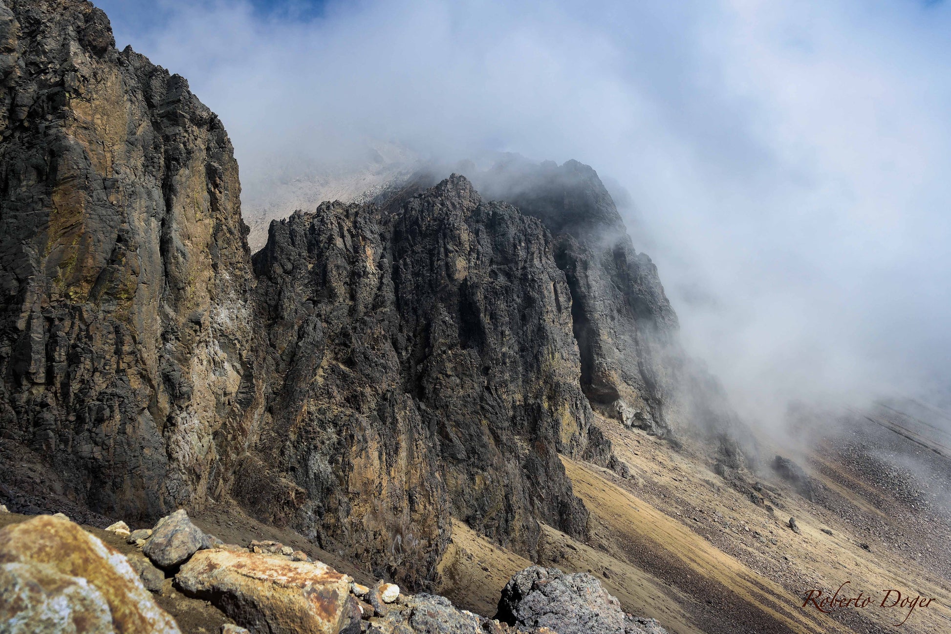Montaña Iztaccihuatl, formaciones rocosas alrededor del tercer “portillo” a una altura aproximada de 4500 msnm, ascendiendo por la ruta de los Portillos, también conocida como la ruta de los Refugios o de los Pies. México.