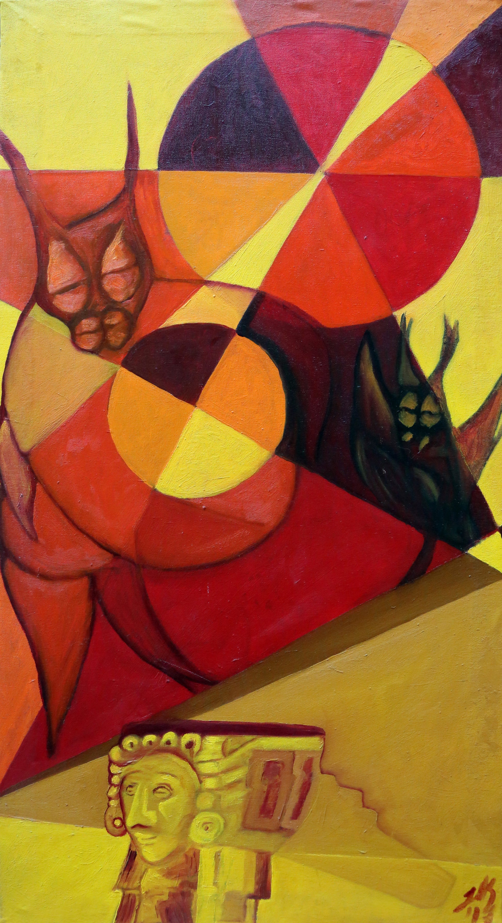 En "Los danzantes", Hernández Soto fusiona la danza onírica con la presencia de la copalera, destacando la energía y la espiritualidad que emana de estas prácticas ancestrales transformadas en figuras fantásticas. Los danzantes, representados con colores vibrantes y dinámicas pinceladas, parecen moverse al ritmo de una música invisible, evocando la conexión entre el cuerpo, el espíritu y el entorno. La copalera, ubicada en el centro de la composición, actúa como un catalizador que intensifica la conexión con lo divino y lo místico.