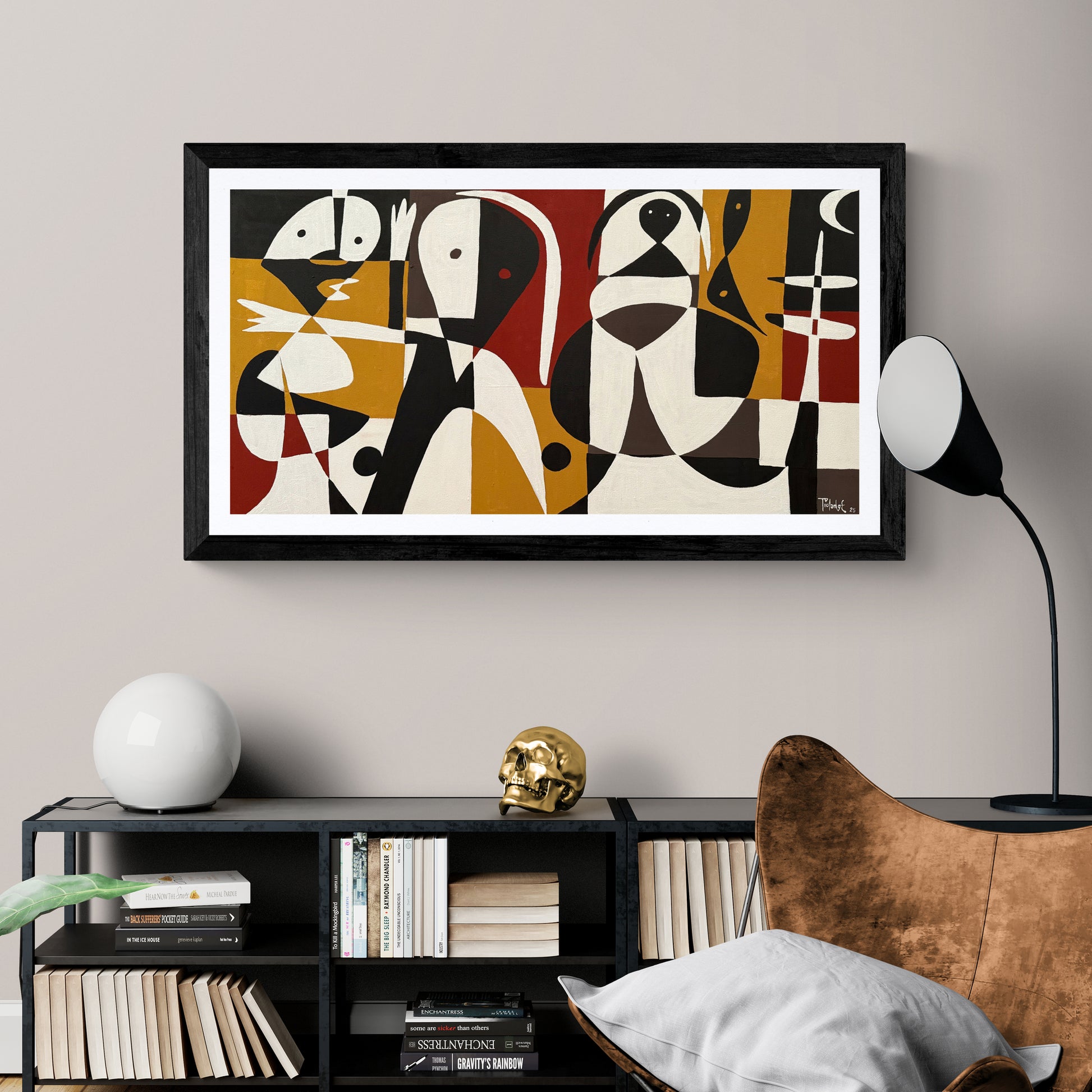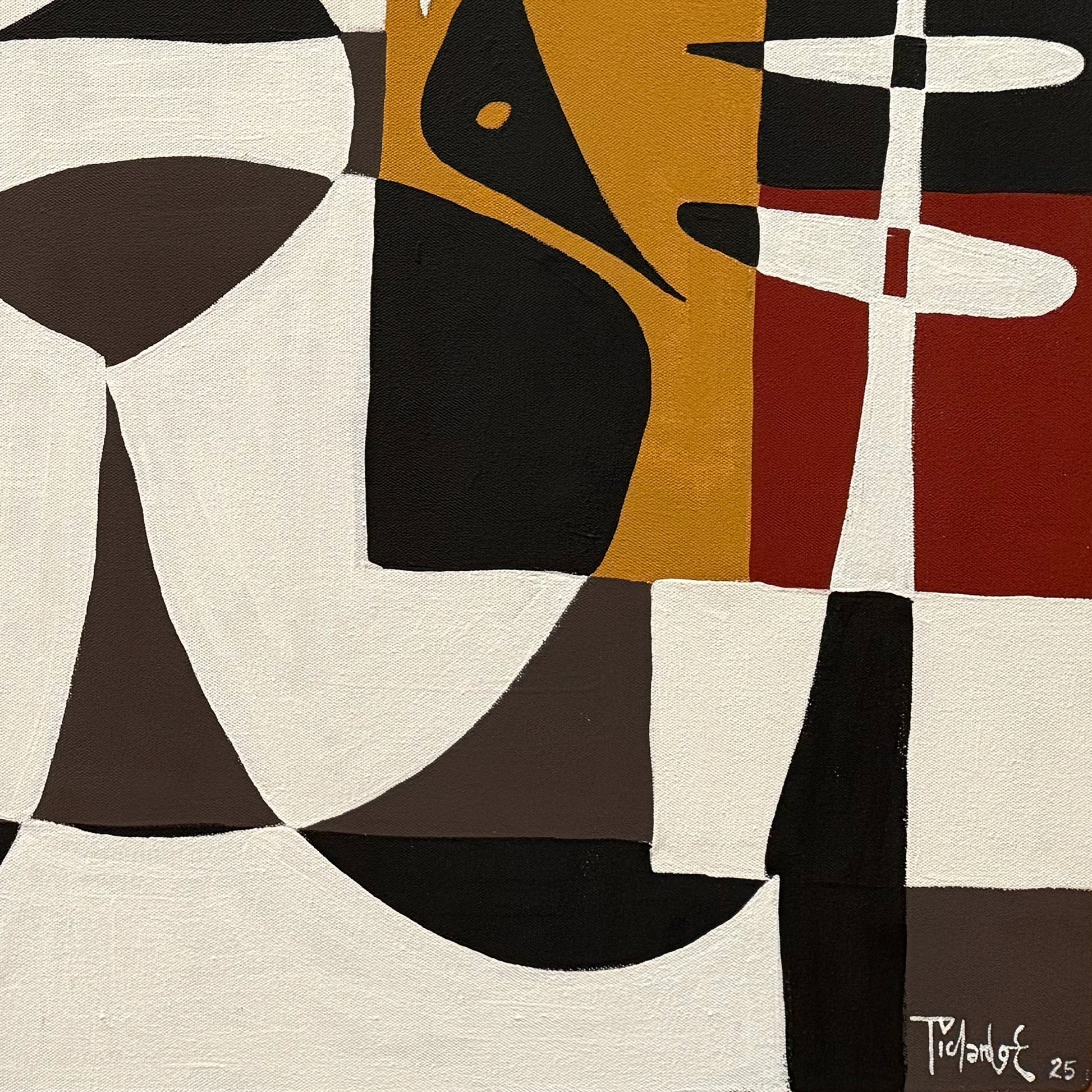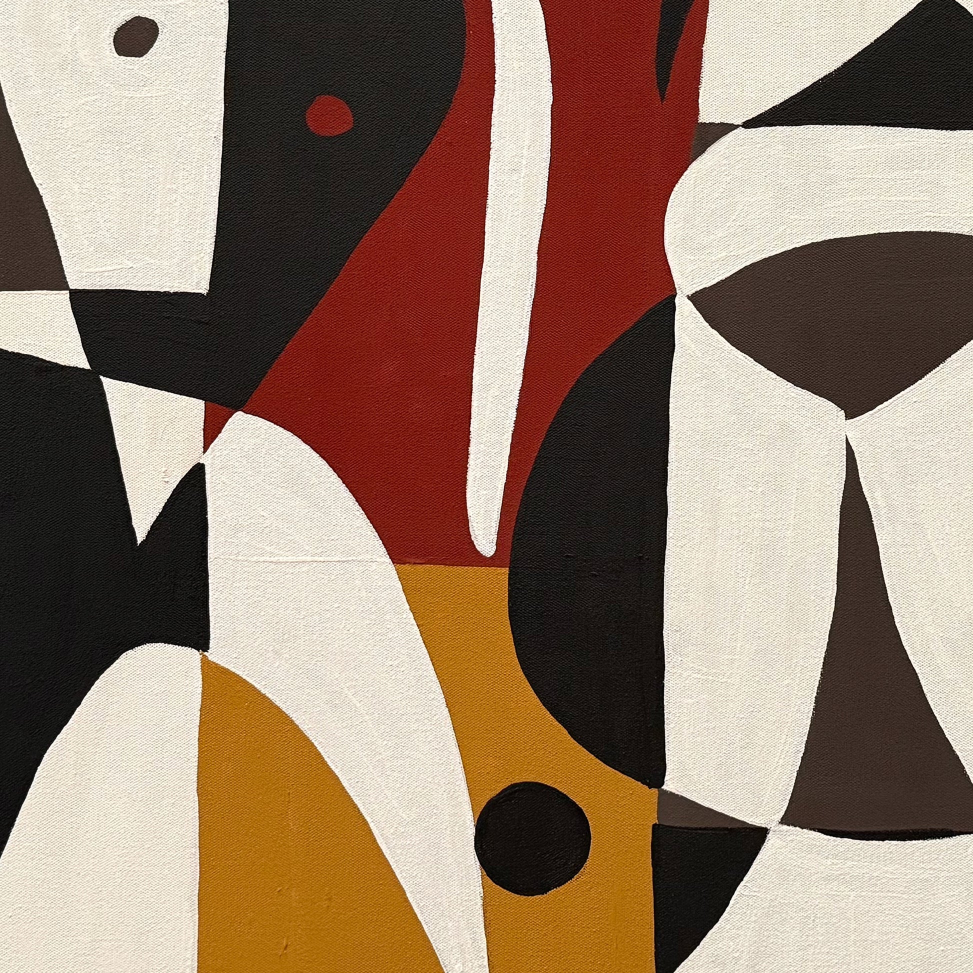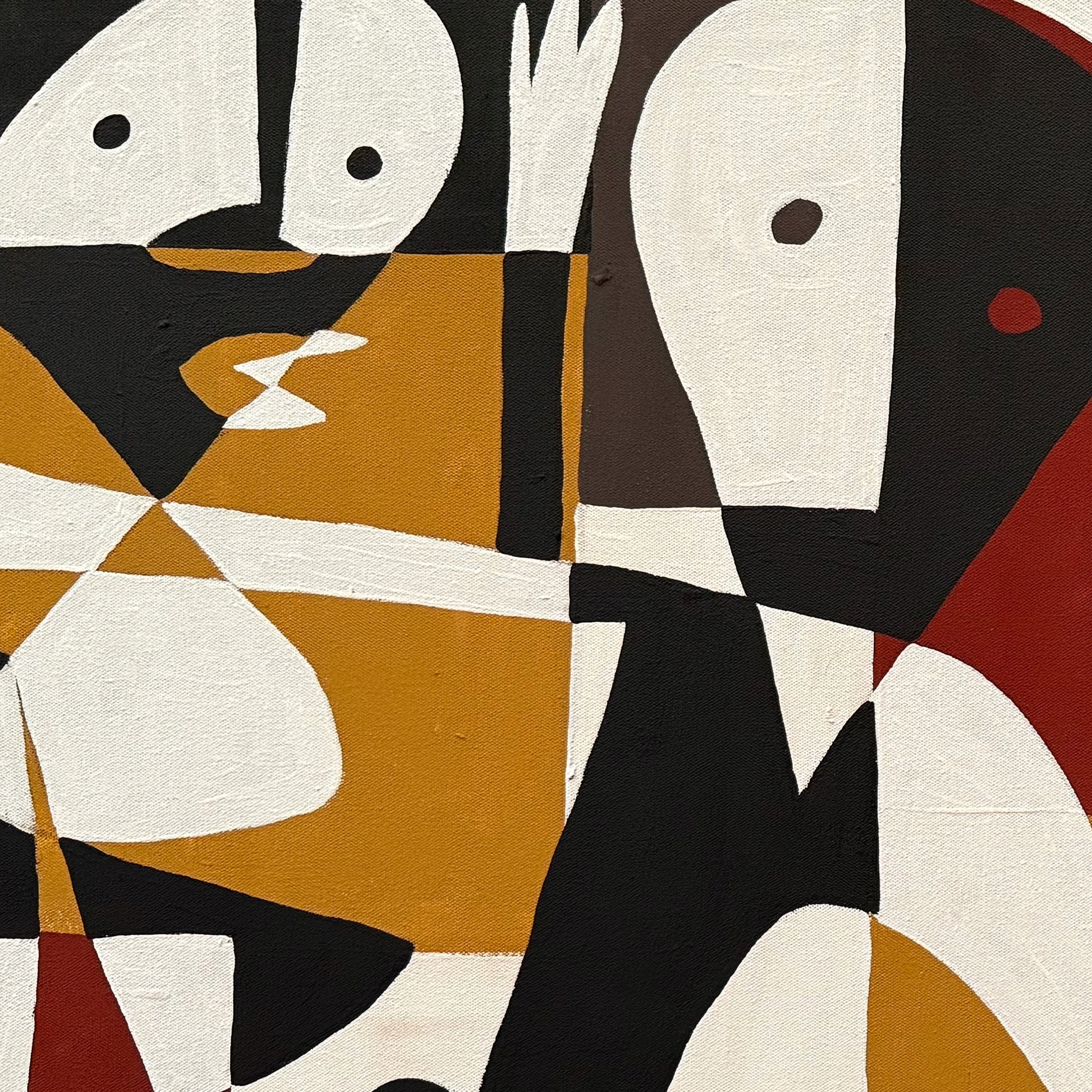 La pintura se organiza en planos de color que se entrecruzan y se complementan. La precisión de las formas geométricas genera una tensión controlada entre movimiento y estabilidad. En esta estructura, el espectador descubre múltiples lecturas: rostros, torsos y gestos que emergen de la abstracción sin perder su humanidad. El uso de la línea blanca y del contraste cromático confiere profundidad sin necesidad de volumen. La obra recuerda por momentos la estética de Joan Miró o de Pablo Picasso, pero se afirma con una voz propia, lúdica y contemporánea.