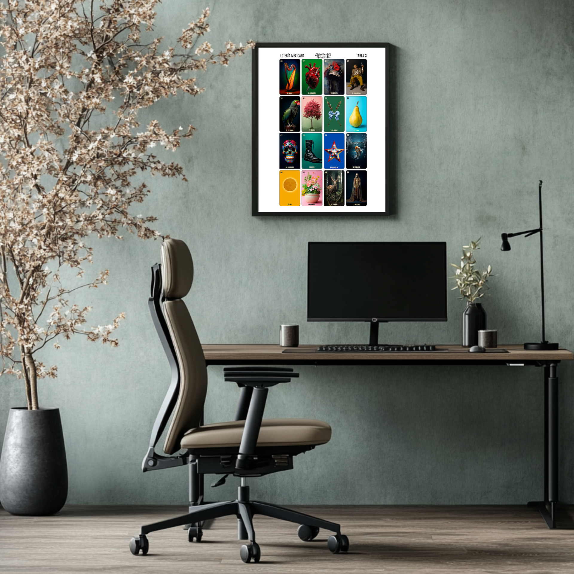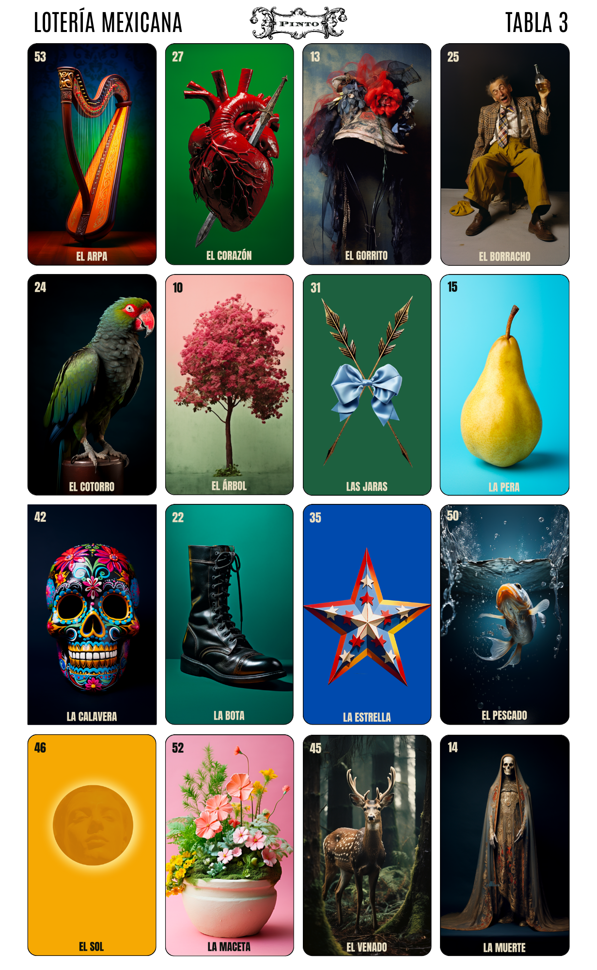 Lejanamente originada en el Lotto italiano del Renacimiento, la lotería fue introducida en la Nueva España en el S XVIII. Destinada a las clases altas en principio, alcanzó popularidad masiva durante la Guerra de la Independencia, como pasatiempo de los soldados. Sus 54 figuras y los versos que acompañan a cada una son ya una acendrada tradición mexicana, que gráficamente cambió muy poco en un siglo. Mi versión, algo más contemporánea aunque deliberadamente vintage, es la que presento aquí. (Serie de 20 láminas)