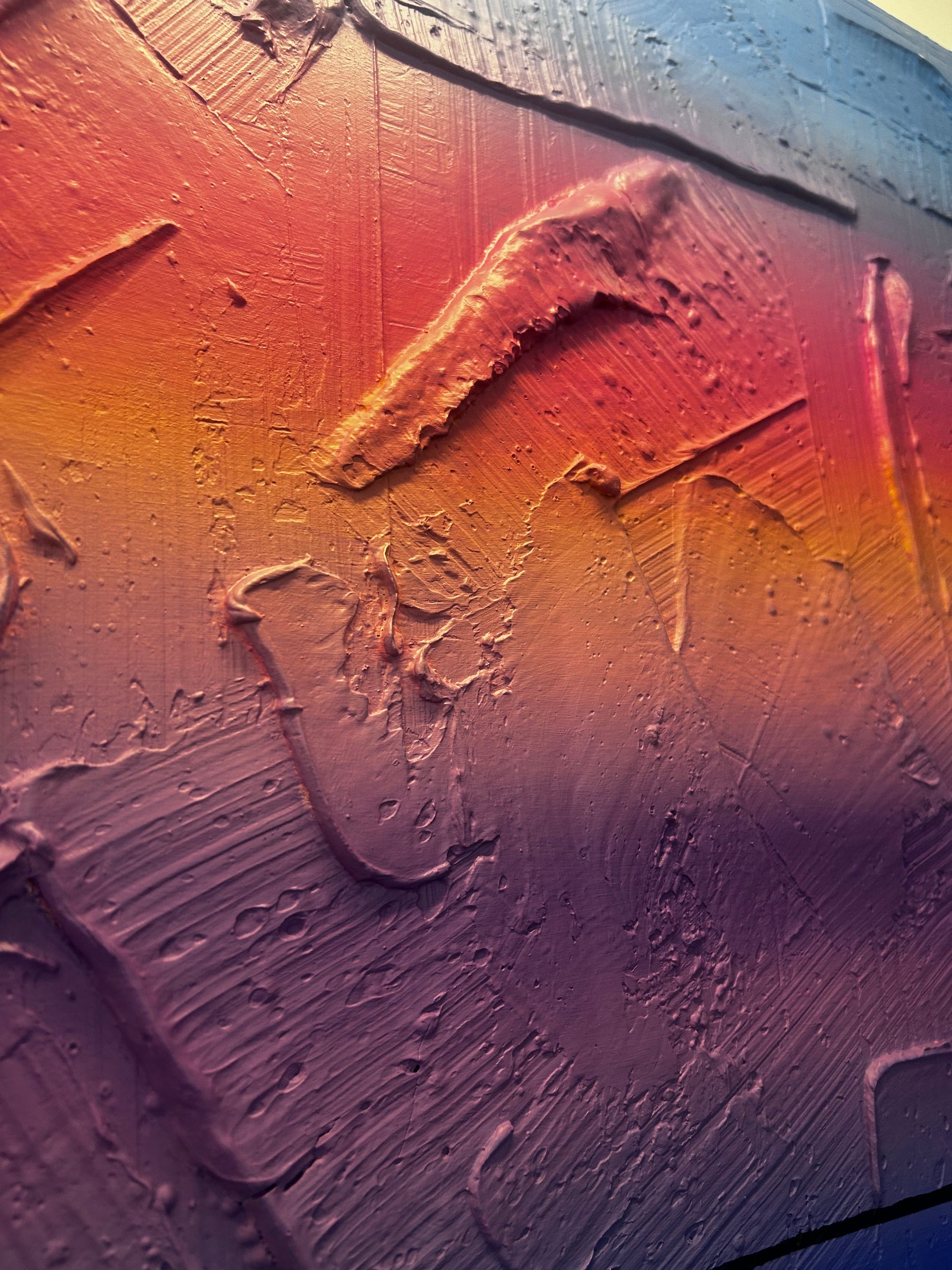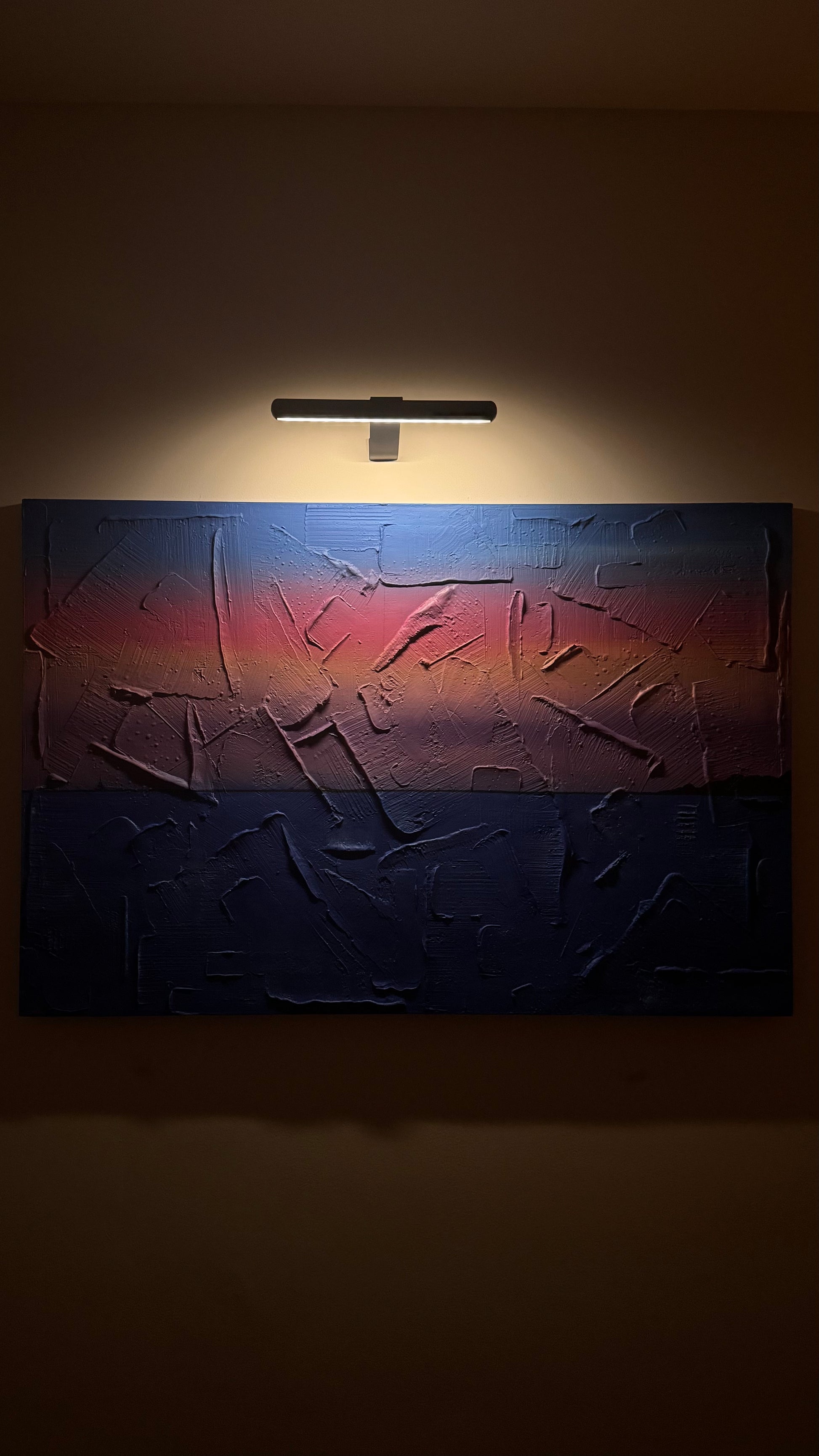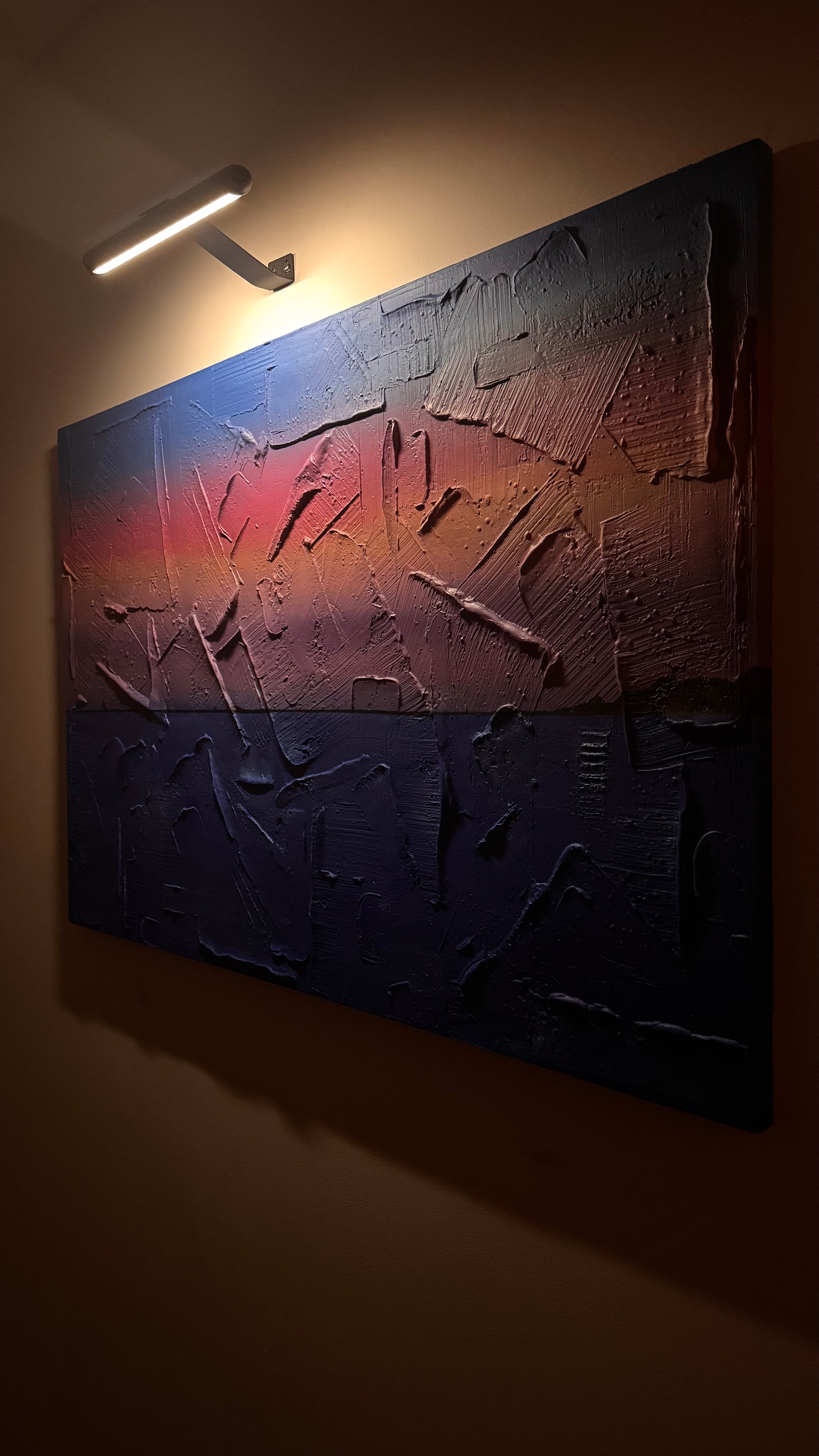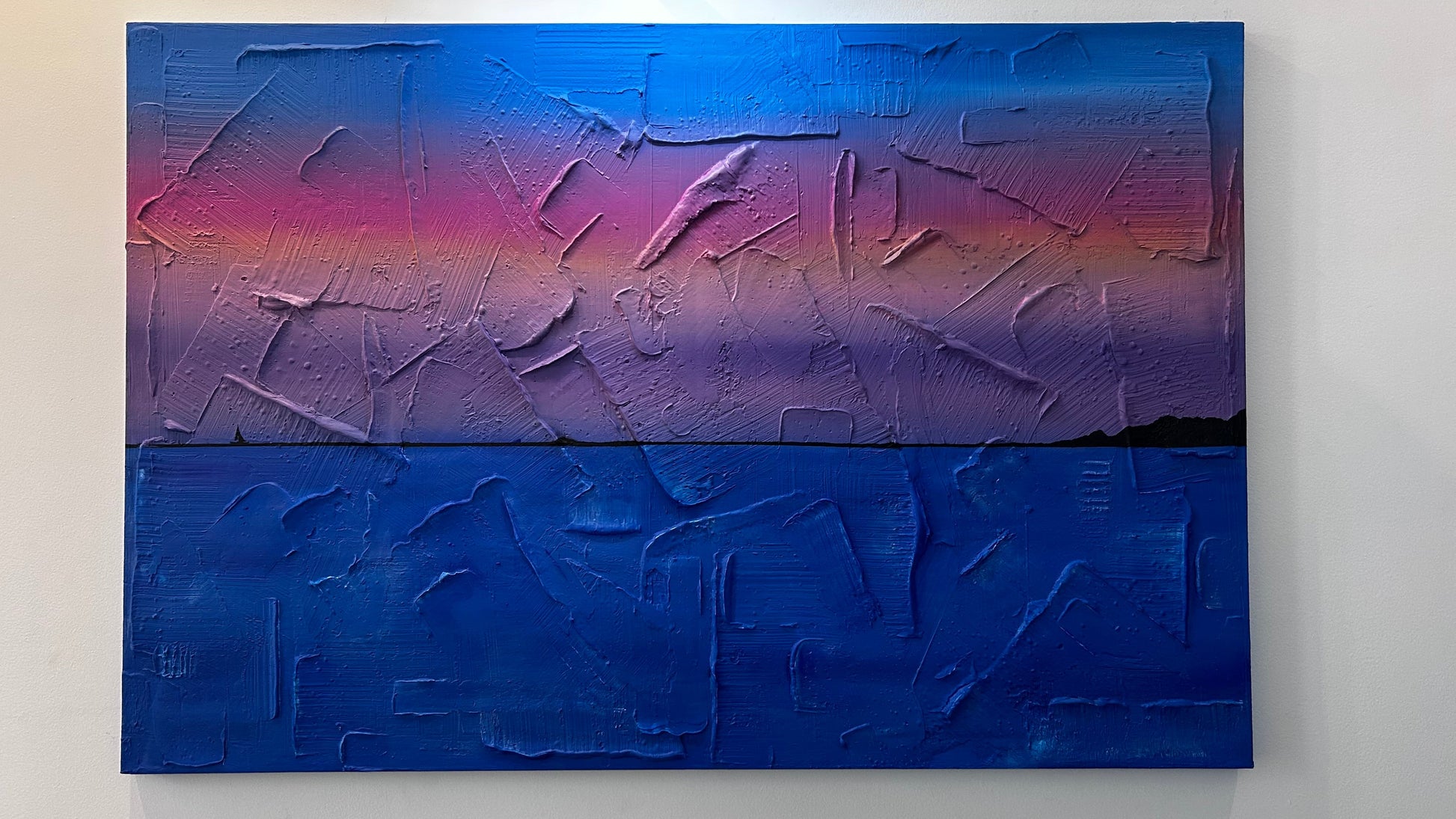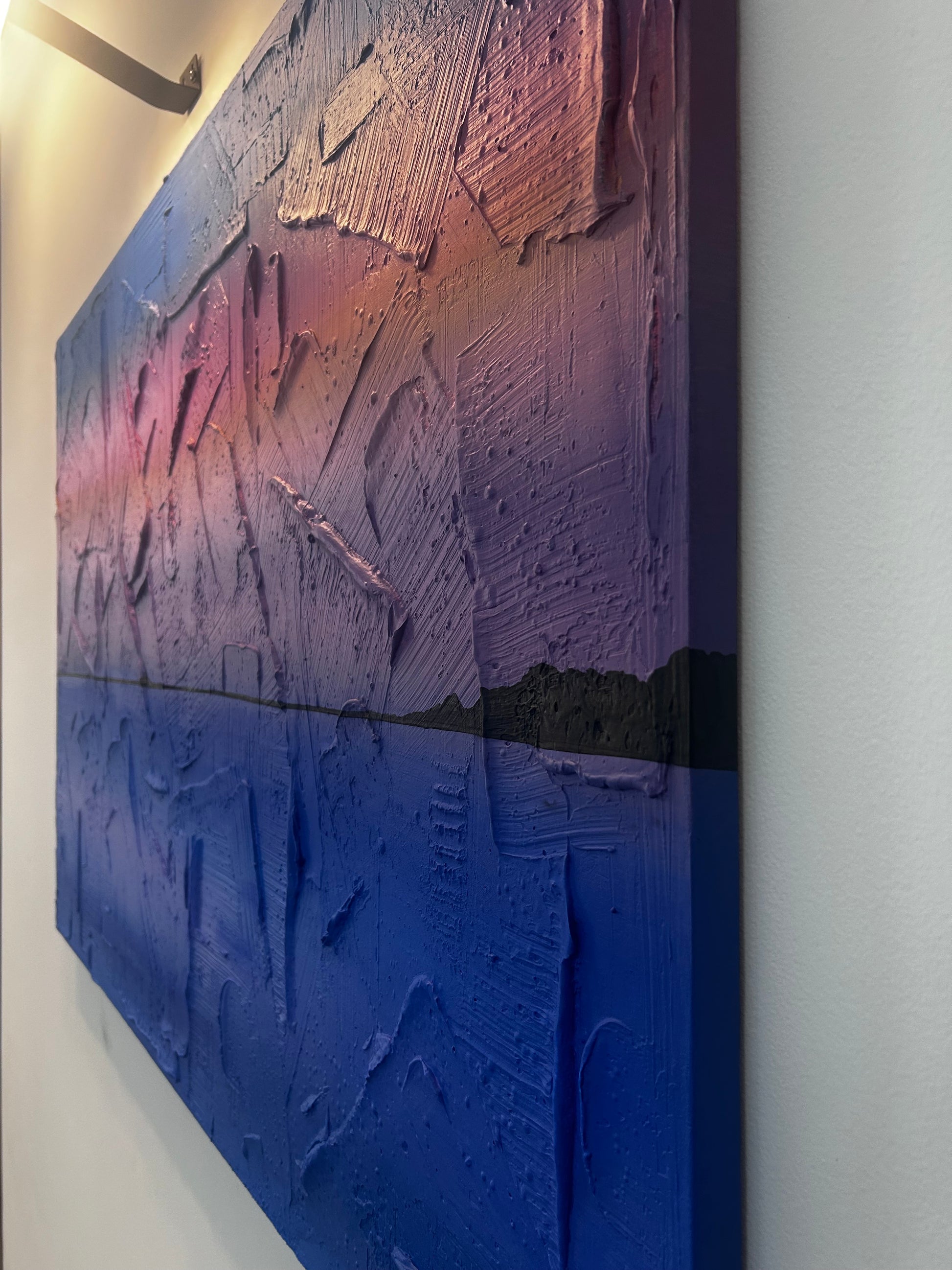 Con una mezcla de colores en acrílico, volúmenes y pasta se dan los colores y tonos del cielo y mar de los atardeceres en La Paz, BCS. Con un sutil detalle en negro delimitando el cielo y el mar. Un velero y tierra firme en cada extremo. Se antoja estar ahí.