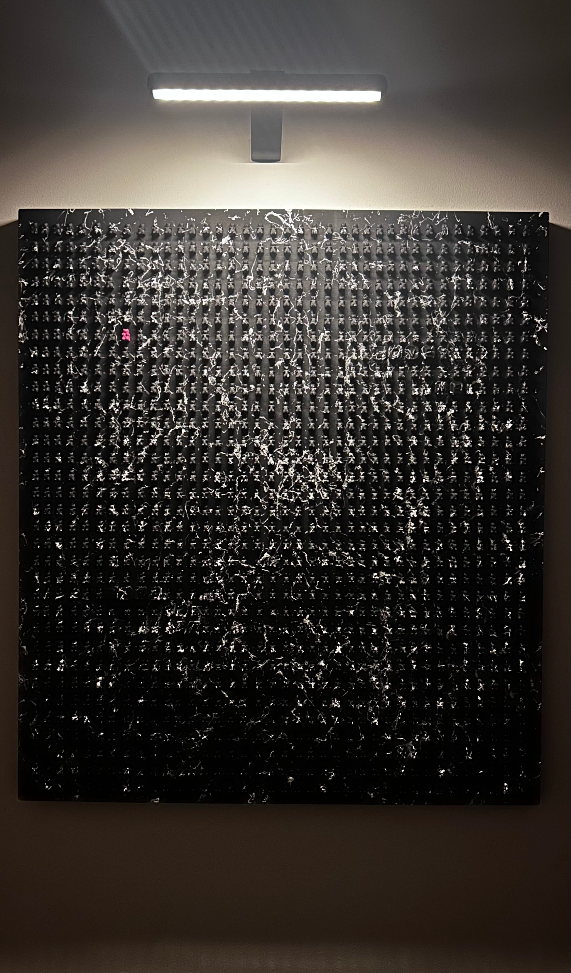 Elegante, moderna y hermosa obra repleta de panditas. En ella encontraras dos frases escondidas - love me l bite me -, así como un invasor en color rosa mexicano para jugar con el enfoque del ojo humano. Y por ultimo, detalles en color blanco para esconder esos cientos de panditas. Una belleza.