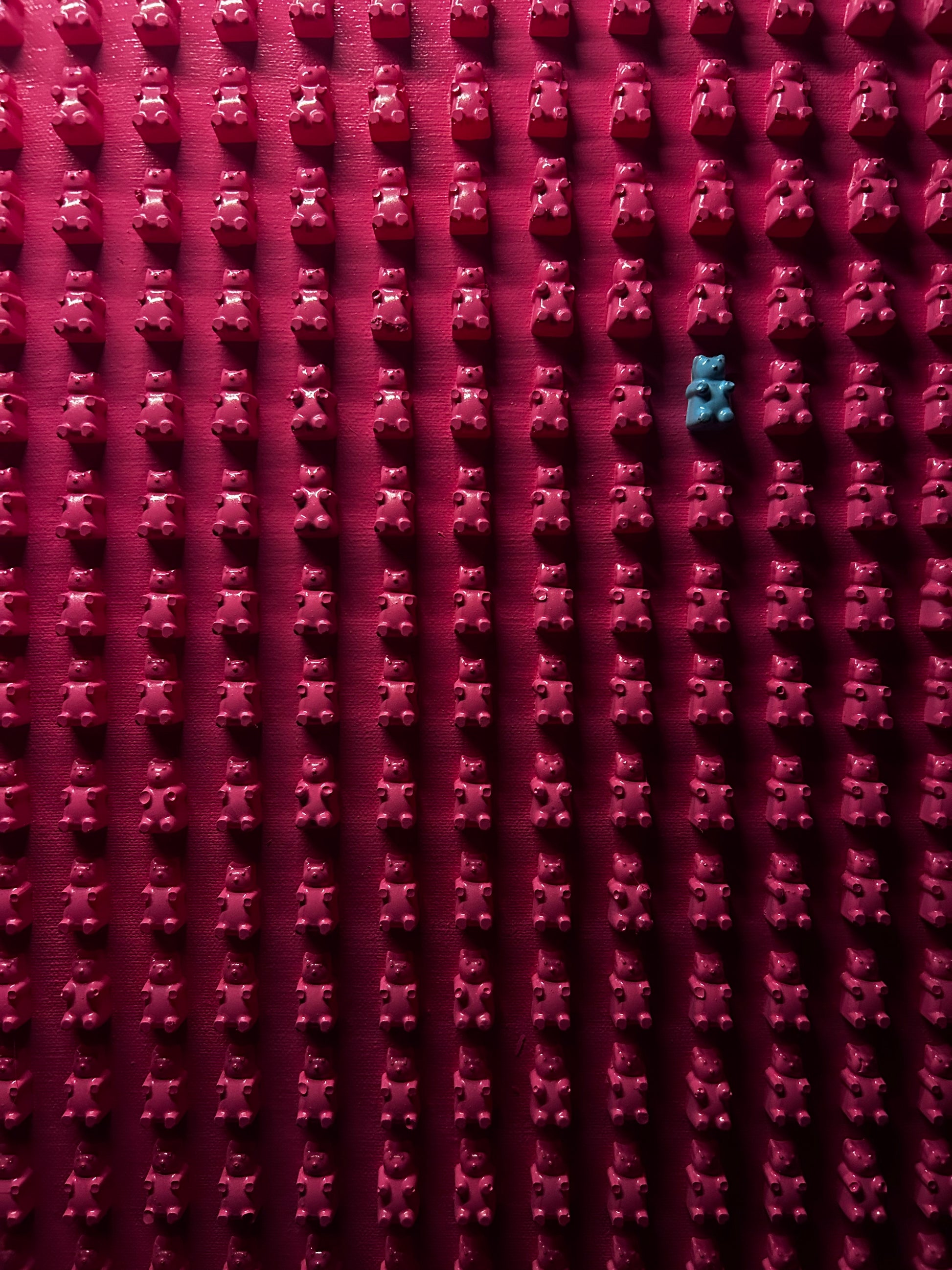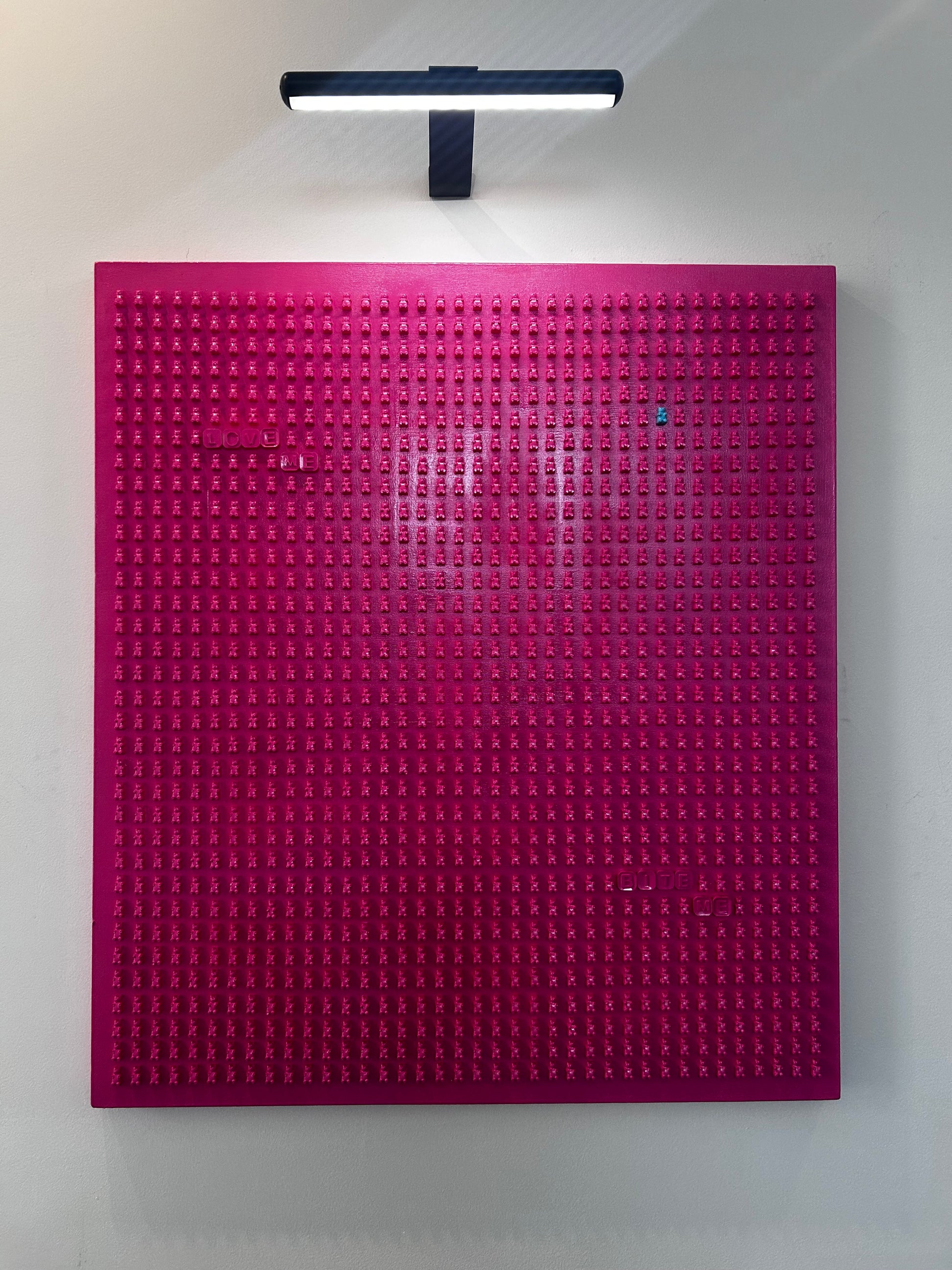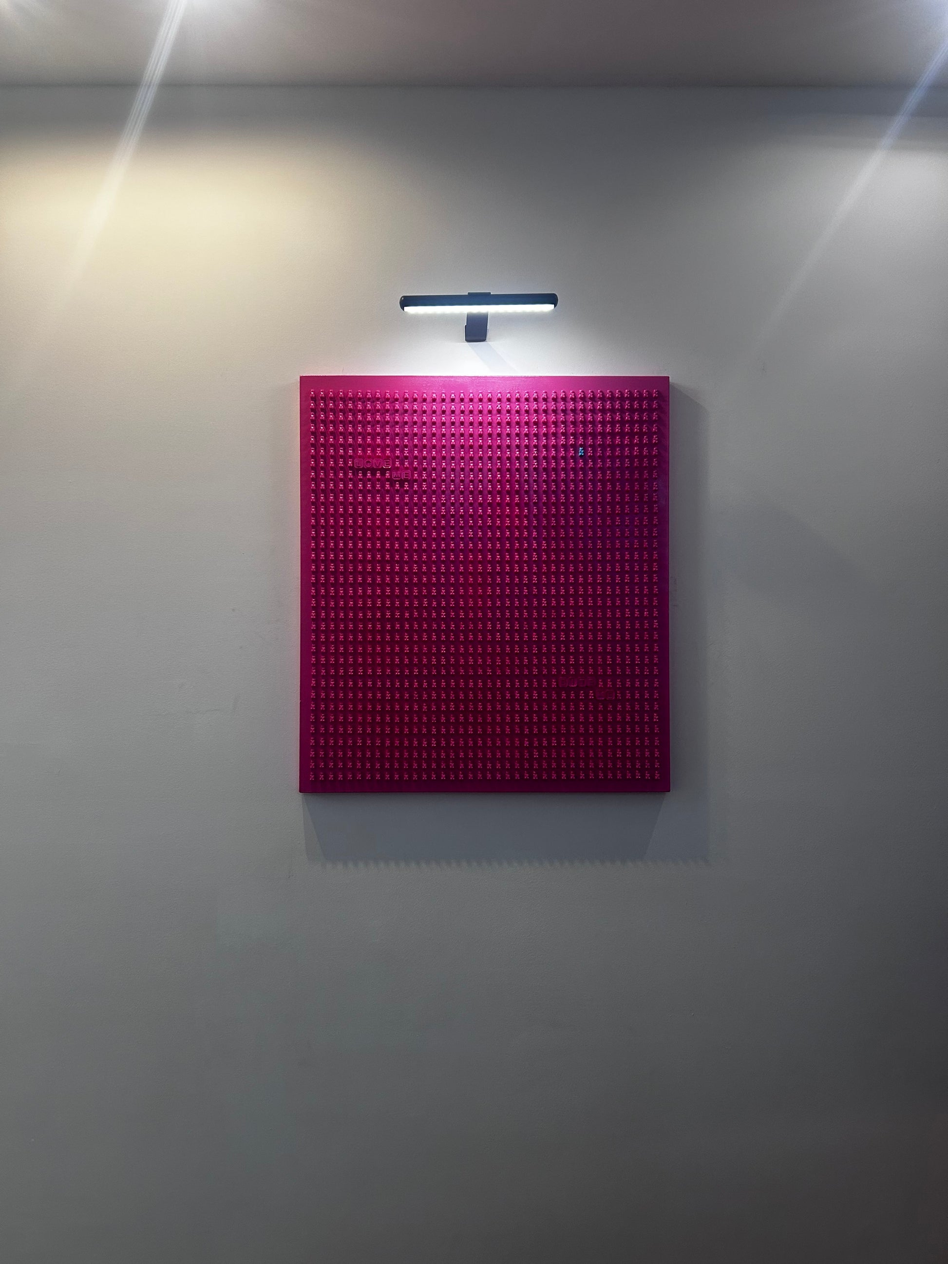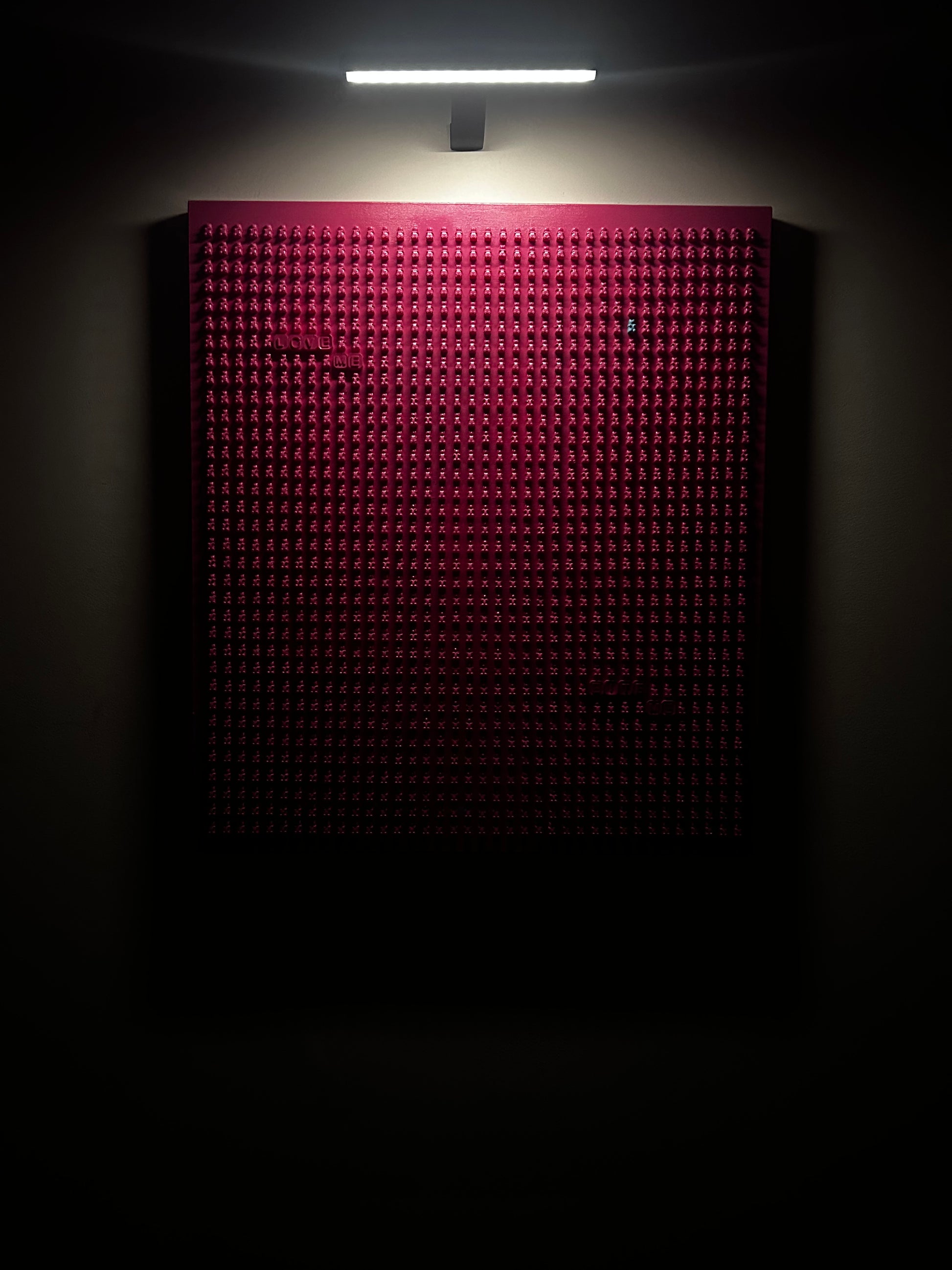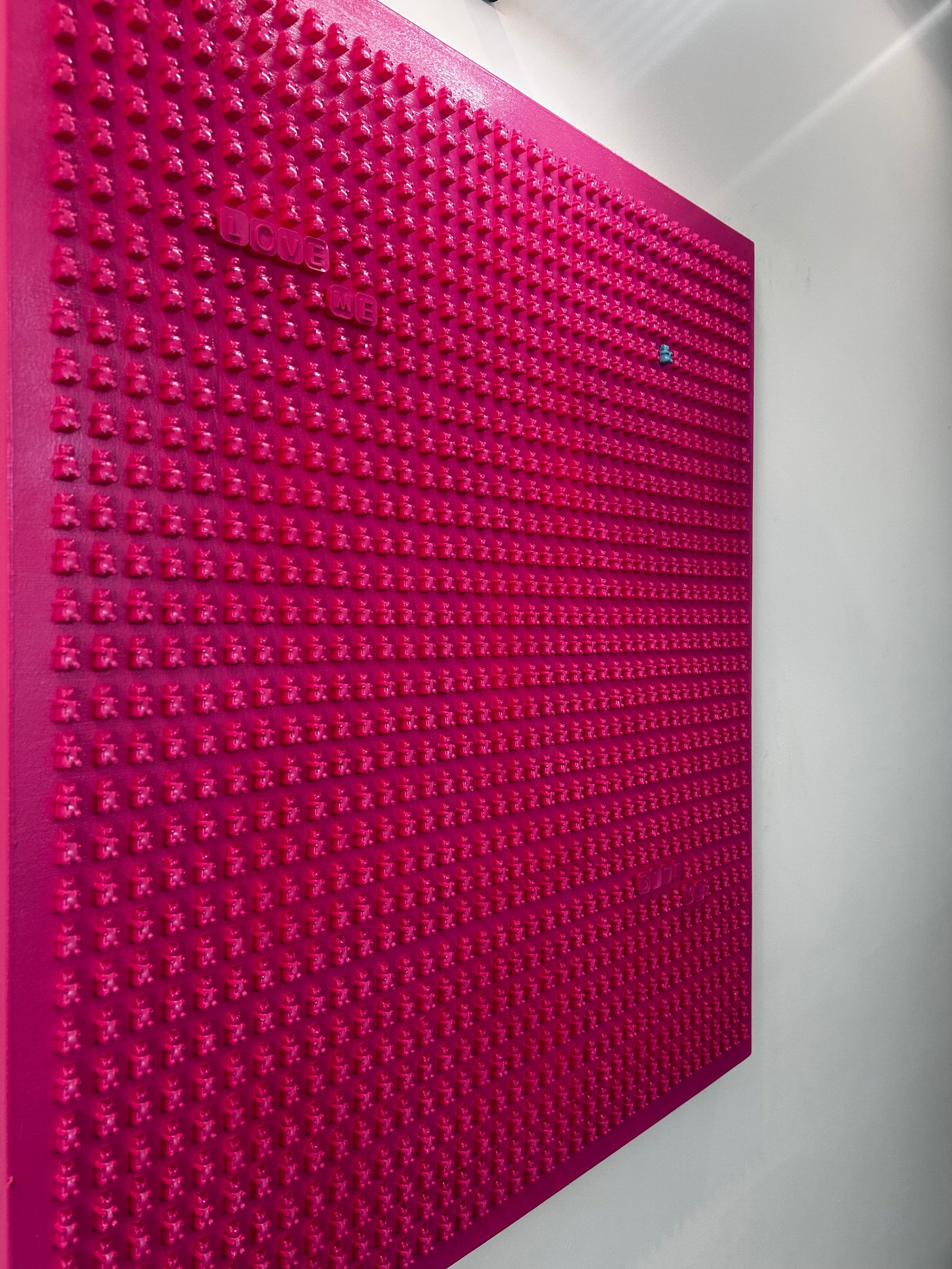 Elegante, moderna y hermosa obra repleta de panditas. En ella encontraras dos frases escondidas - love me l bite me -, así como un invasor en color azul para jugar con el enfoque del ojo humano. Una belleza en rosa mexicano.