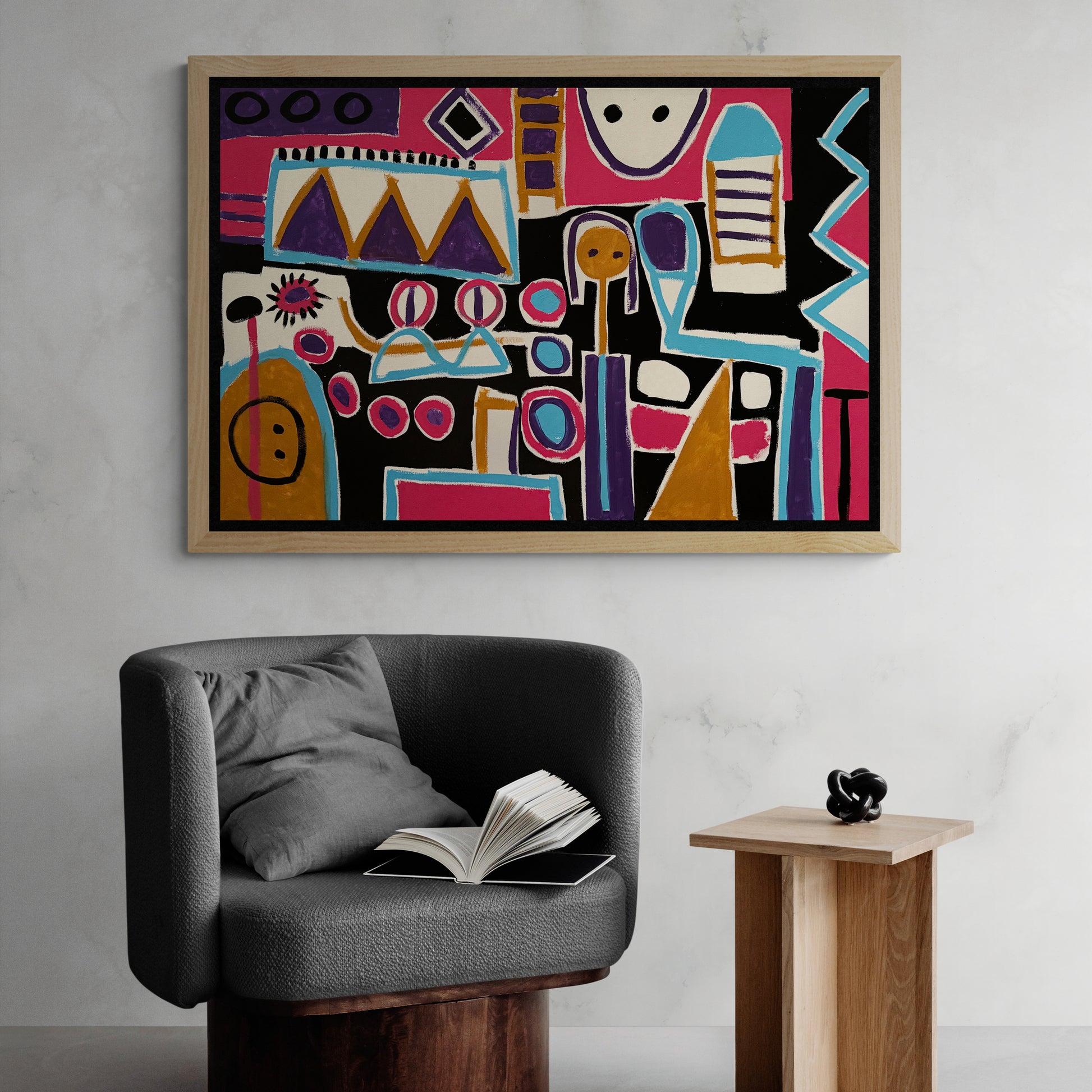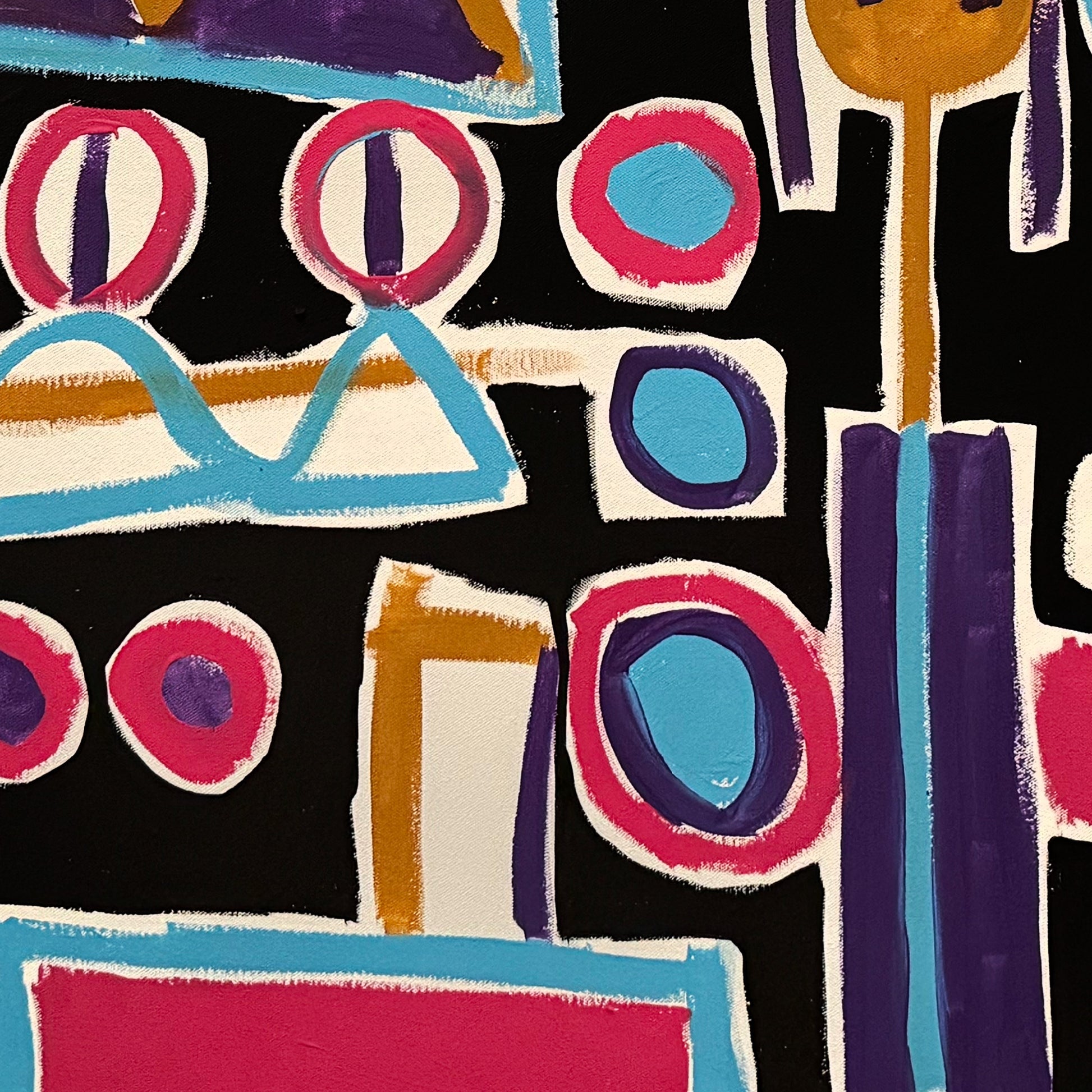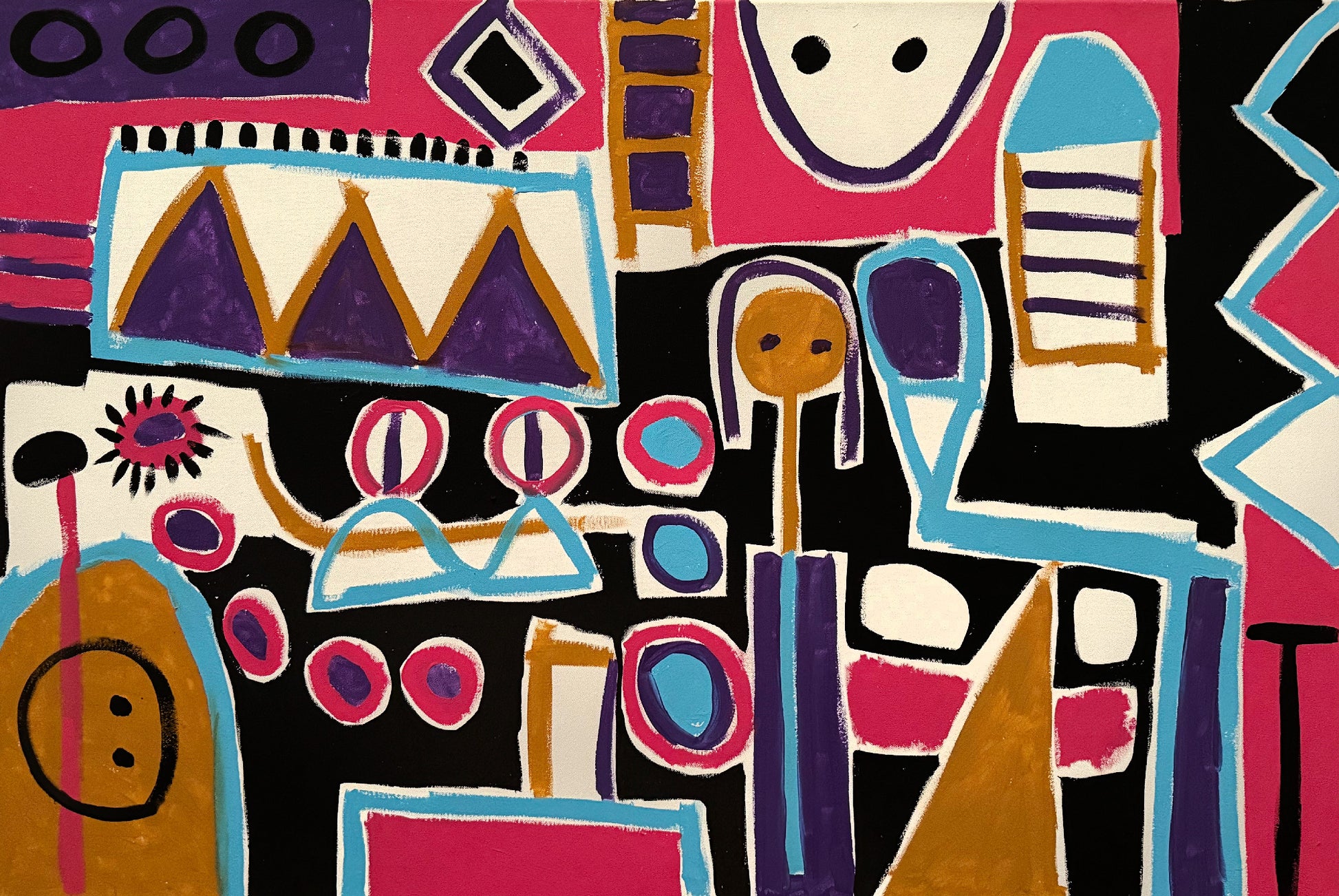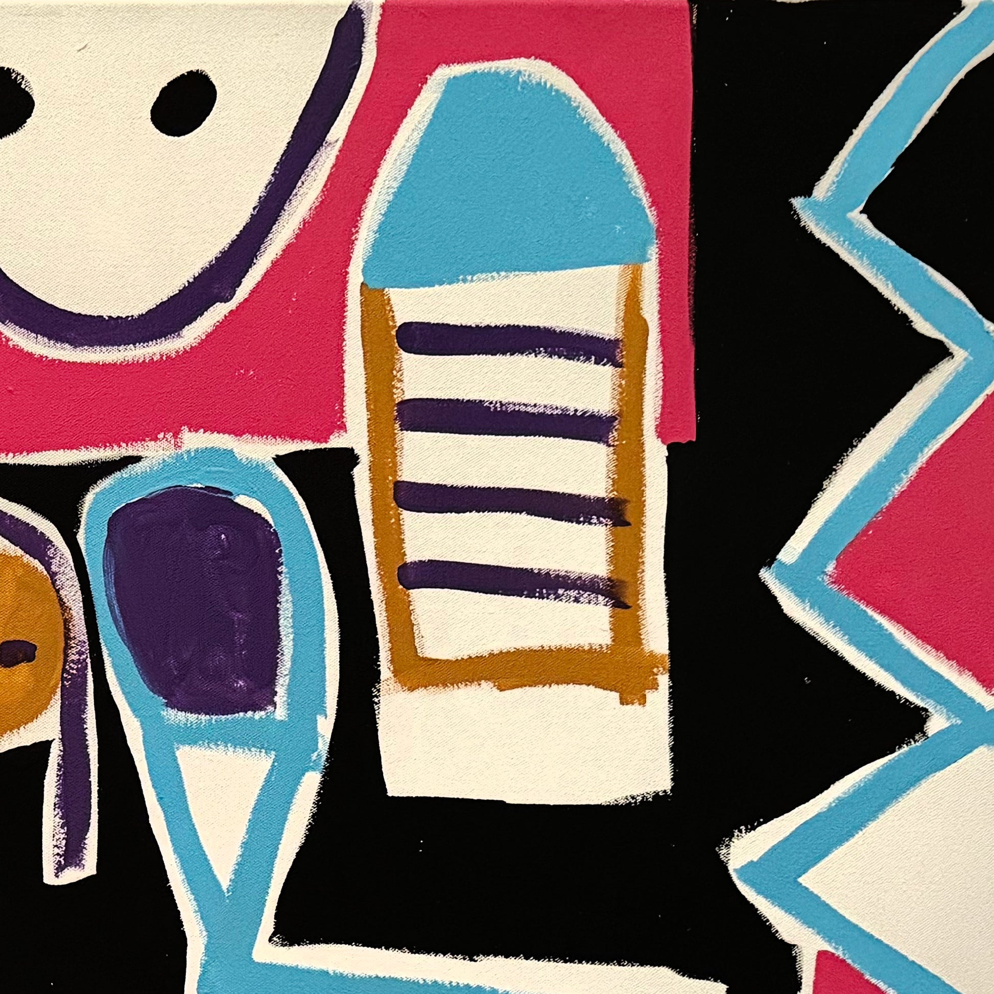 La obra “Luces de la ciudad del pintor Enrique Pichardo”, elaborada en acrílico sobre tela y con un formato de 120 cm de ancho por 80 cm de alto, despliega una escena abstracta compuesta por bloques cromáticos contrastantes y figuras esquemáticas que conviven con energía constante. Además, el predominio del magenta, turquesa, morado y negro aporta un carácter vibrante que, de este modo, activa cada zona del lienzo como si estuviera iluminada desde adentro.
