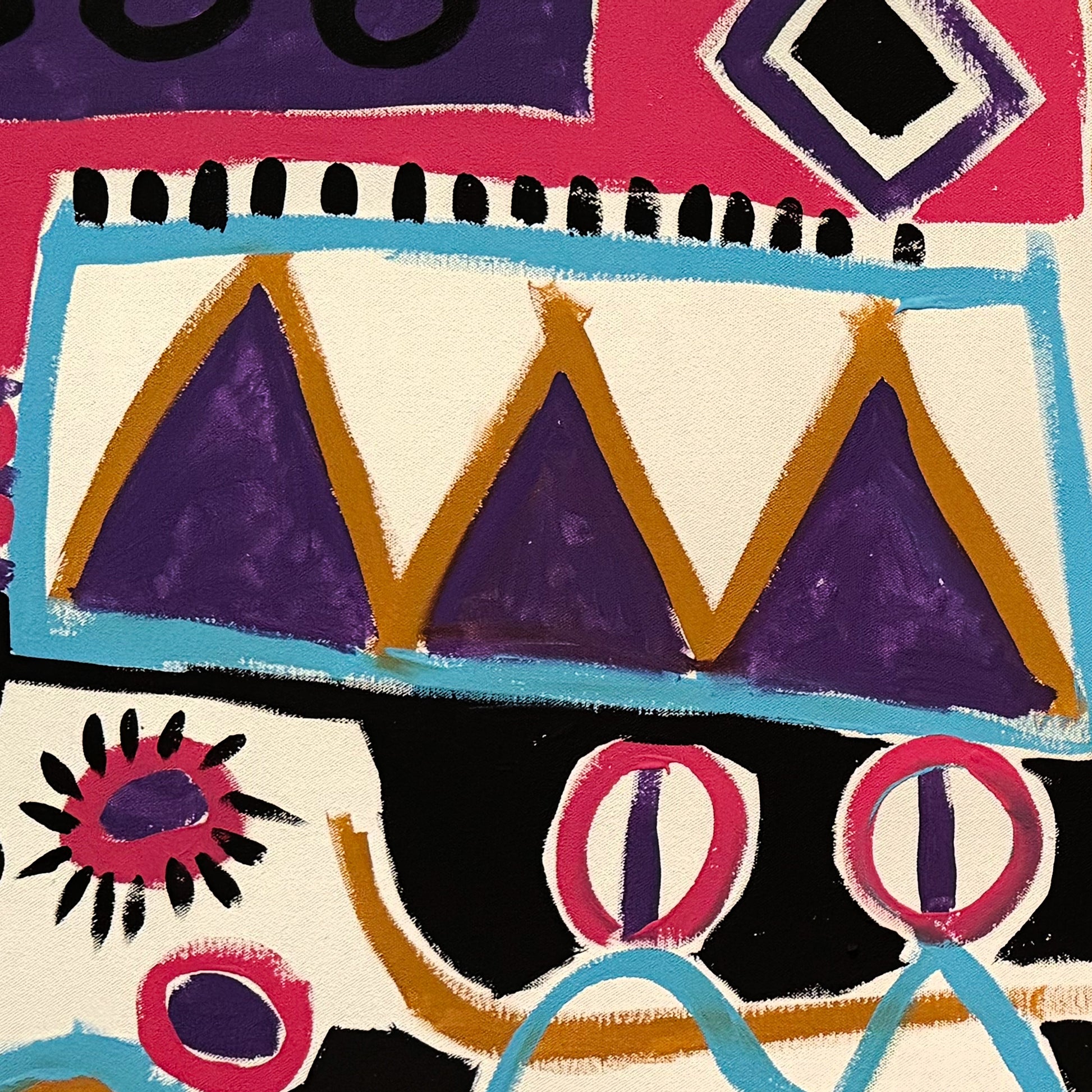 Dentro de la geometría emergen figuras humanas simplificadas que aportan un matiz narrativo. Aunque su presencia es mínima, funcionan como referentes visuales que guían la lectura del conjunto. Asimismo, ciertos rectángulos con líneas horizontales evocan, de forma estilizada, estructuras arquitectónicas o señales urbanas. Esta combinación de símbolos conecta con corrientes del arte contemporáneo, evocando la libertad gestual de Wassily Kandinsky y, en ocasiones, la sensibilidad lúdica de Joan Miró, aunque finalmente la obra se sostiene en la identidad personal de Pichardo.