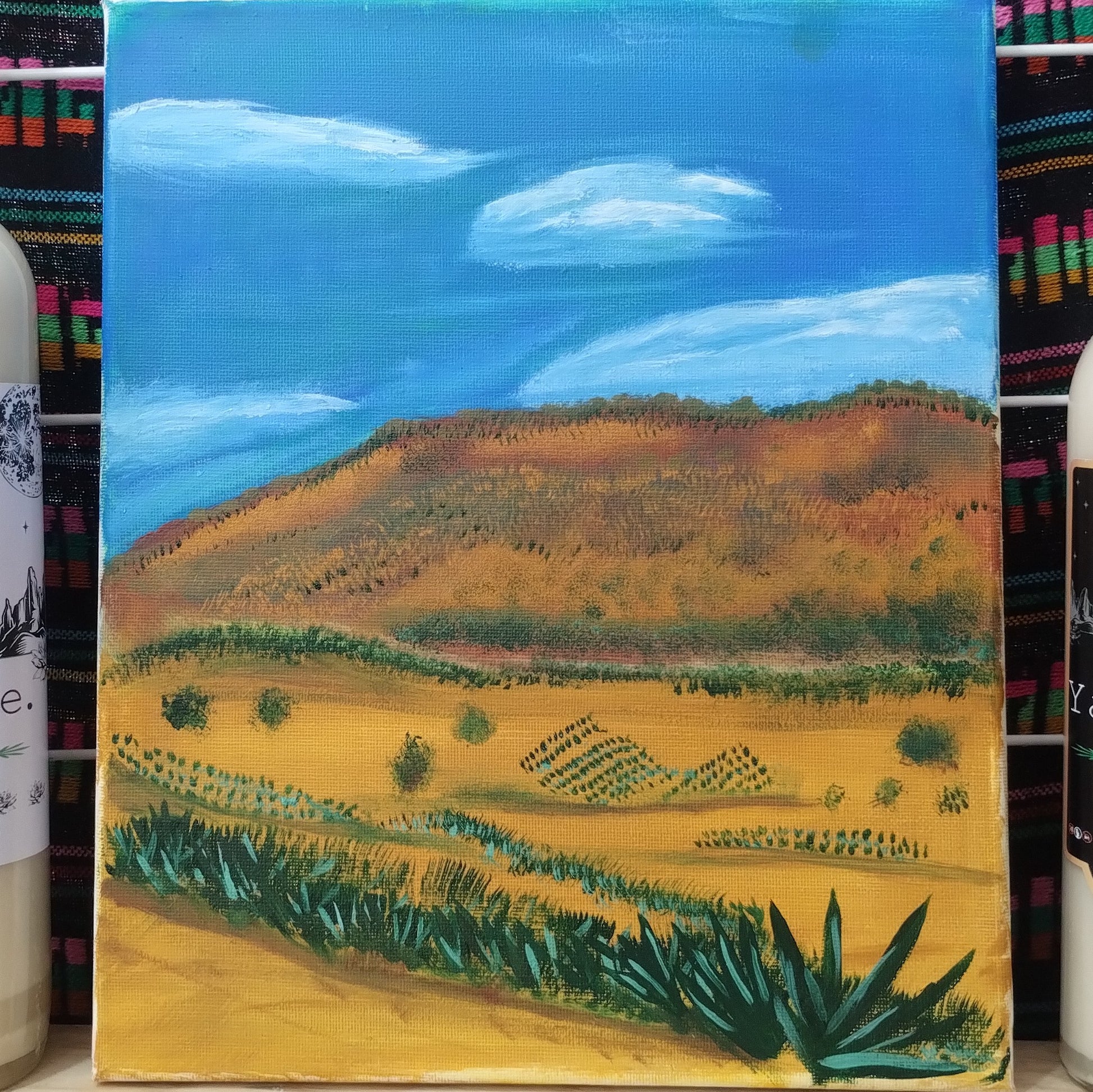 Plasmado de un paisaje de sembradío de agaves característicos de los estados de México como Jalisco, Guerrero y Oaxaca.