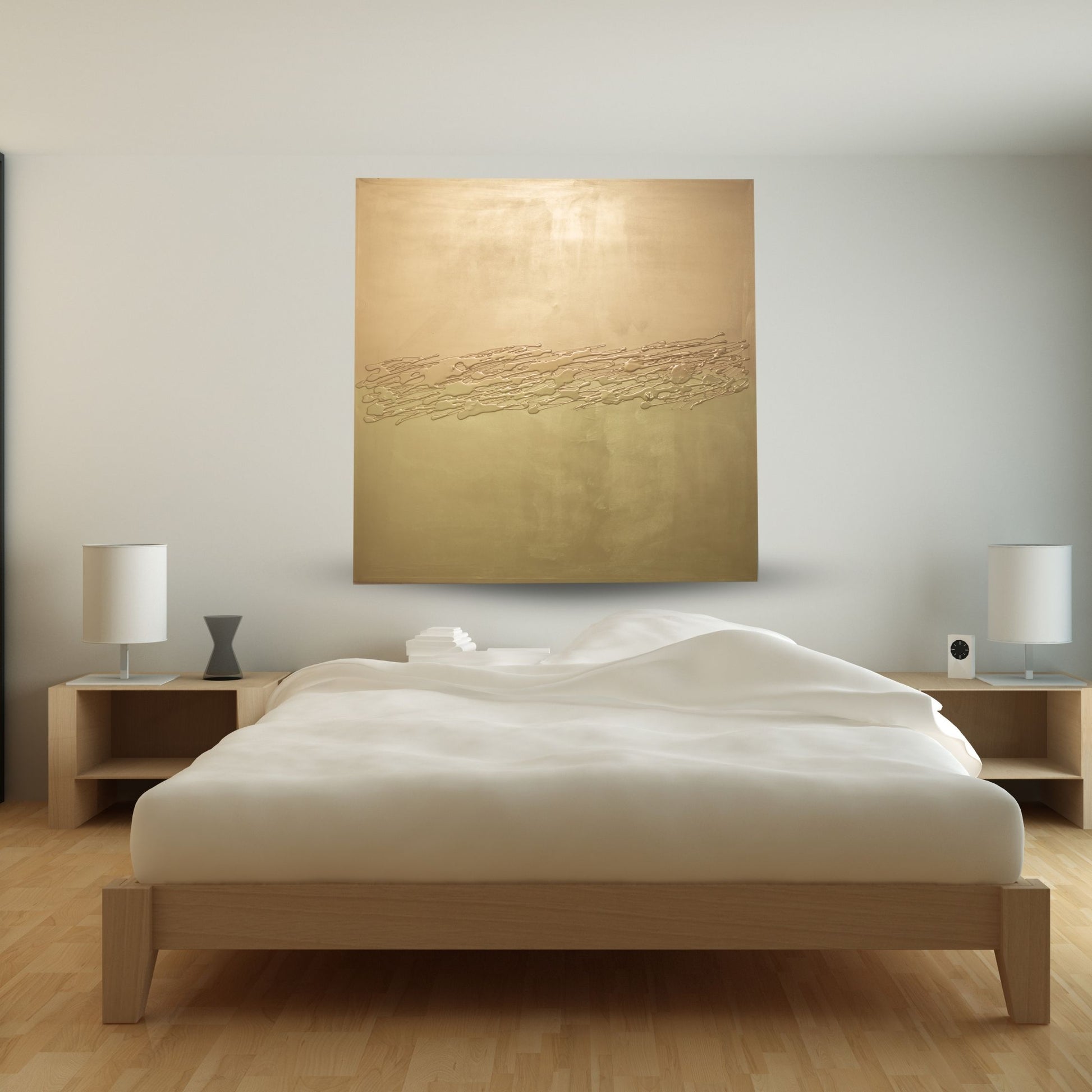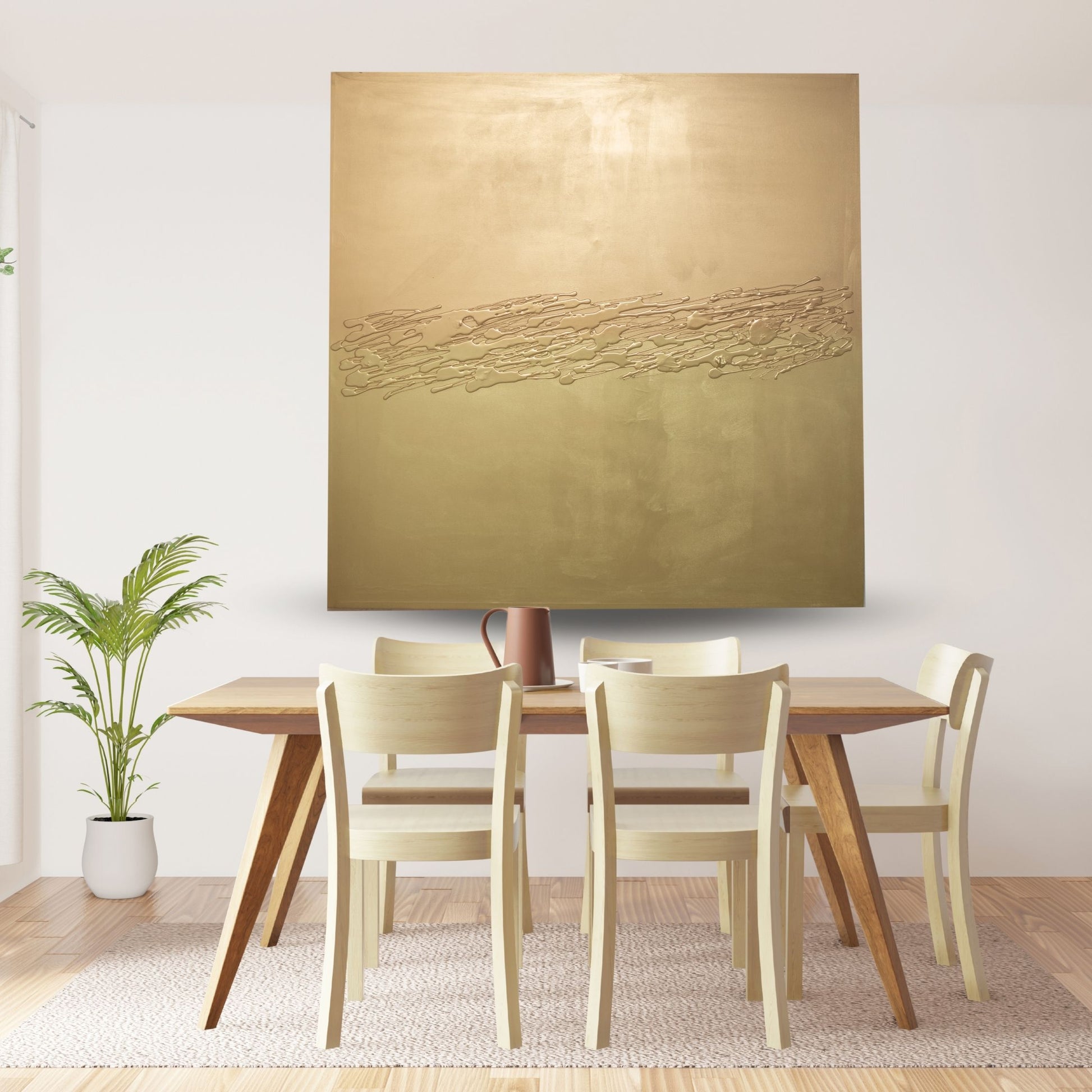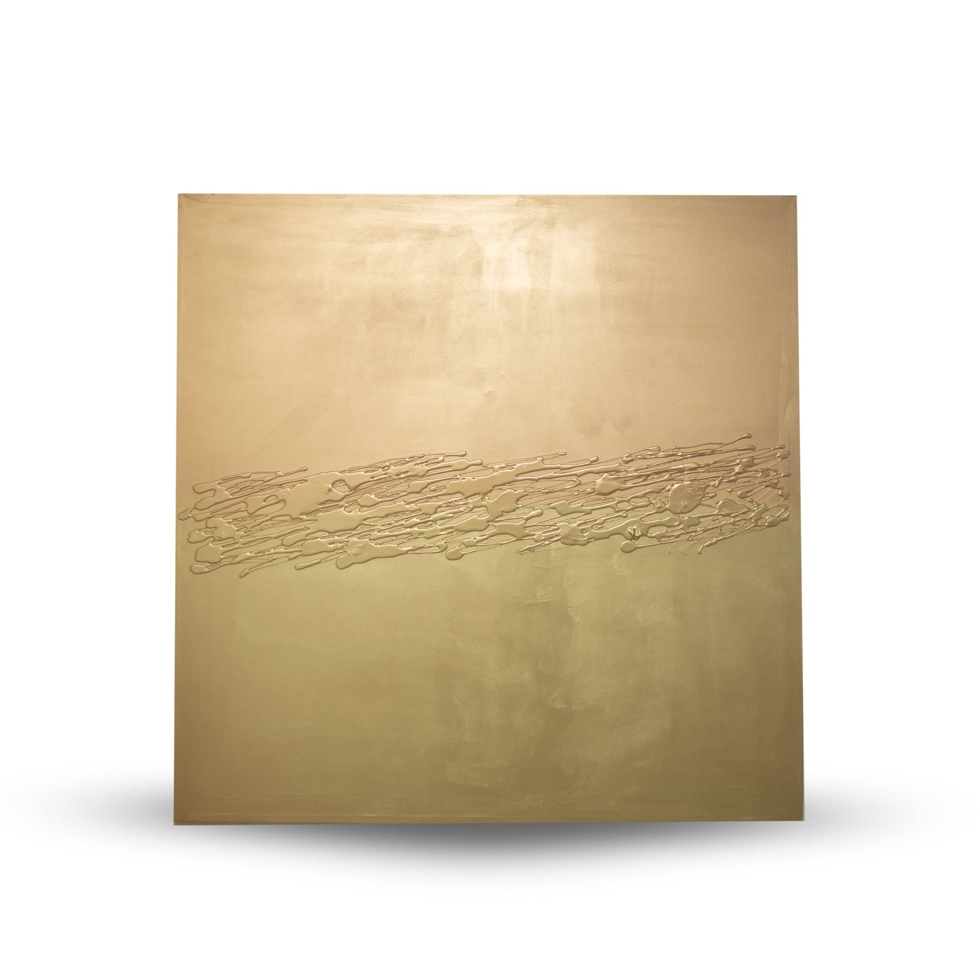 Sumérgete en la magnificencia con "El Dorado", una pieza de arte y decoración que encarna la opulencia y el diseño contemporáneo. Este cuadro de 150 x 150 cm es una exploración deslumbrante de textura mixta, combinando óleos, acrílicos, ricas texturas y destellos metálicos para crear una superficie que captura la luz y el ojo con cada ángulo.