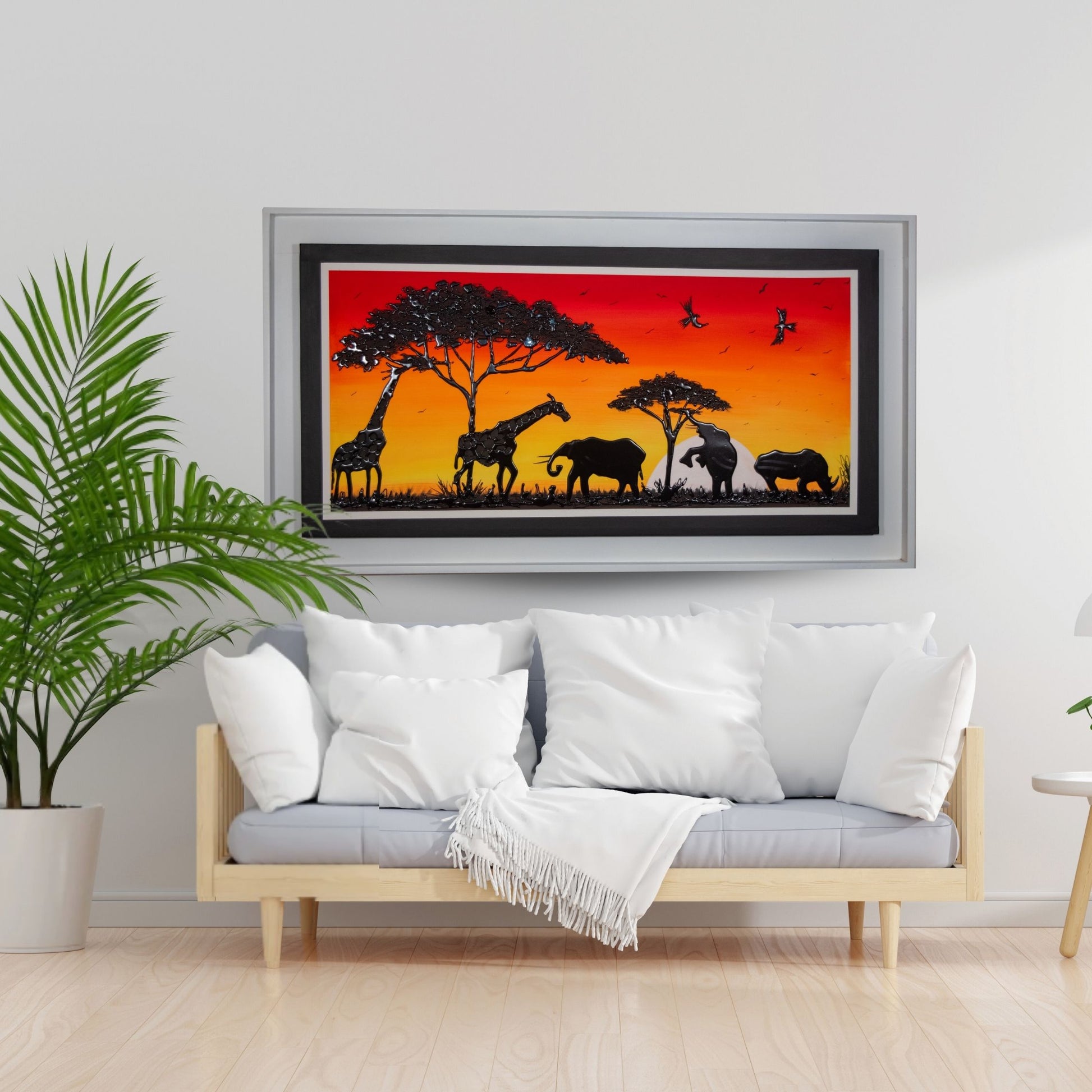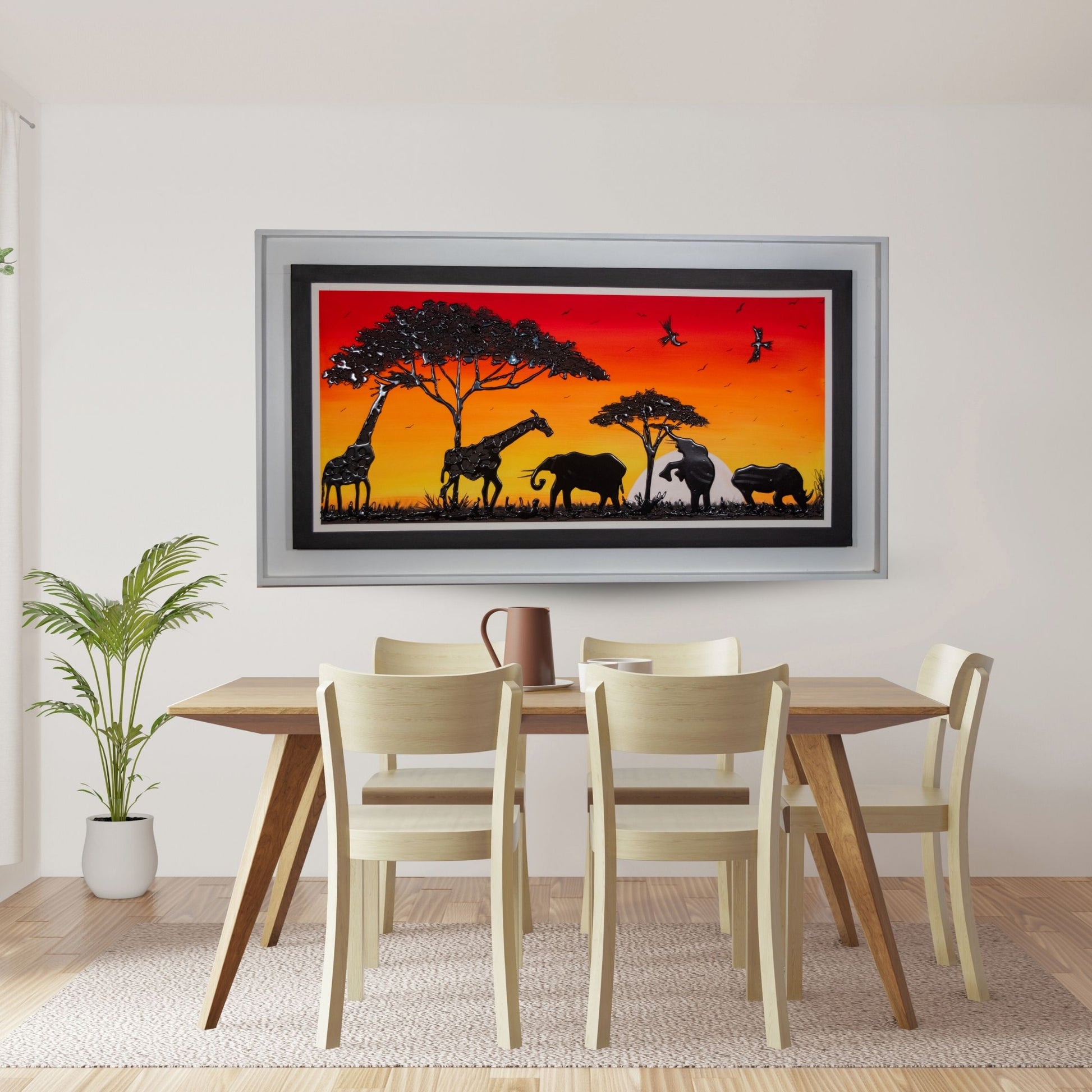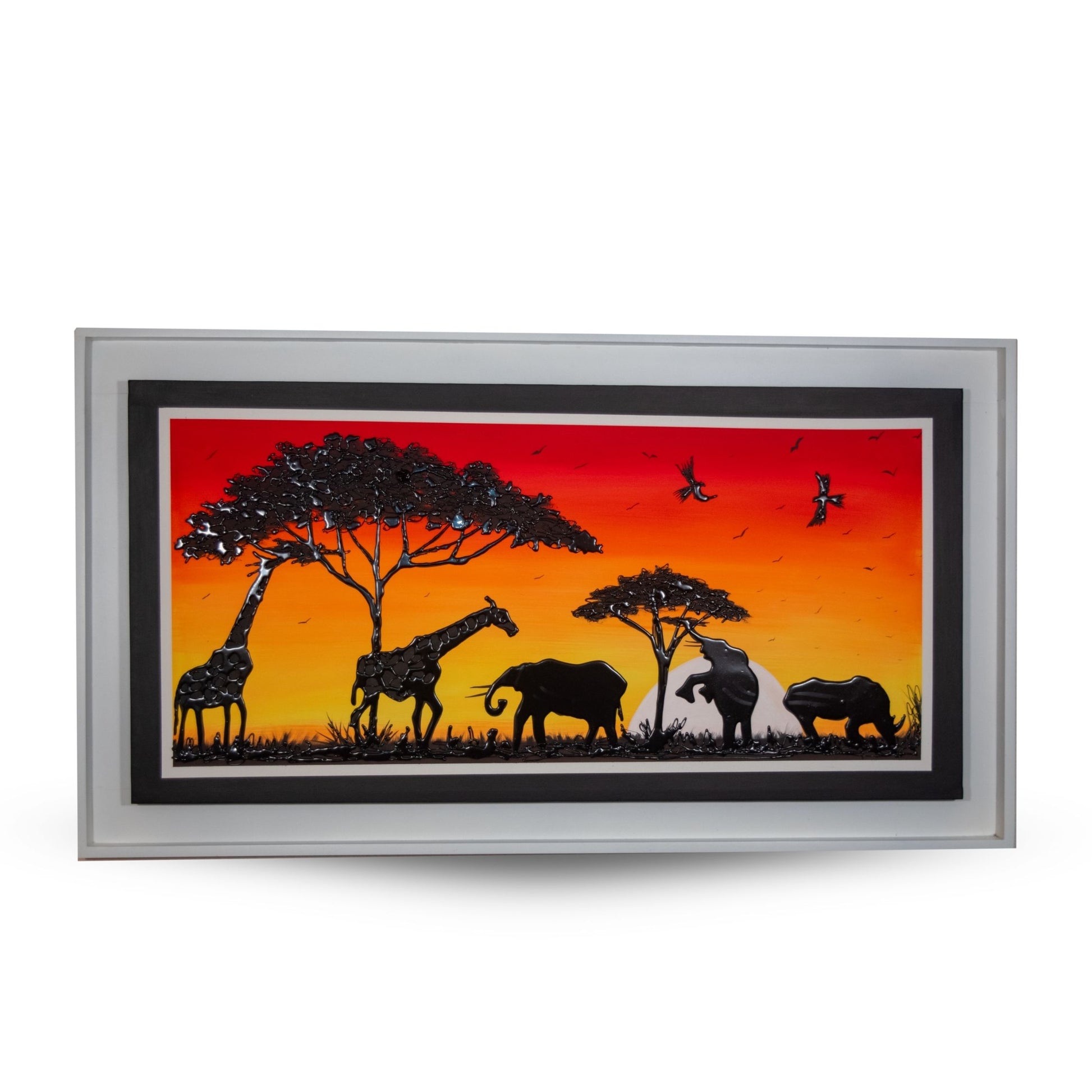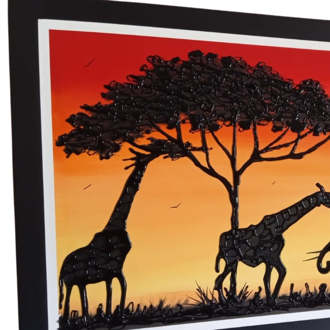 Cada elemento de esta pieza ha sido meticulosamente elaborado para evocar una sensación de asombro y elegancia atemporal. Montado sobre un bastidor de madera de primera calidad, "Atardecer en la Sabana" no solo es una declaración artística, sino una pieza duradera y de alta calidad que realzará cualquier espacio