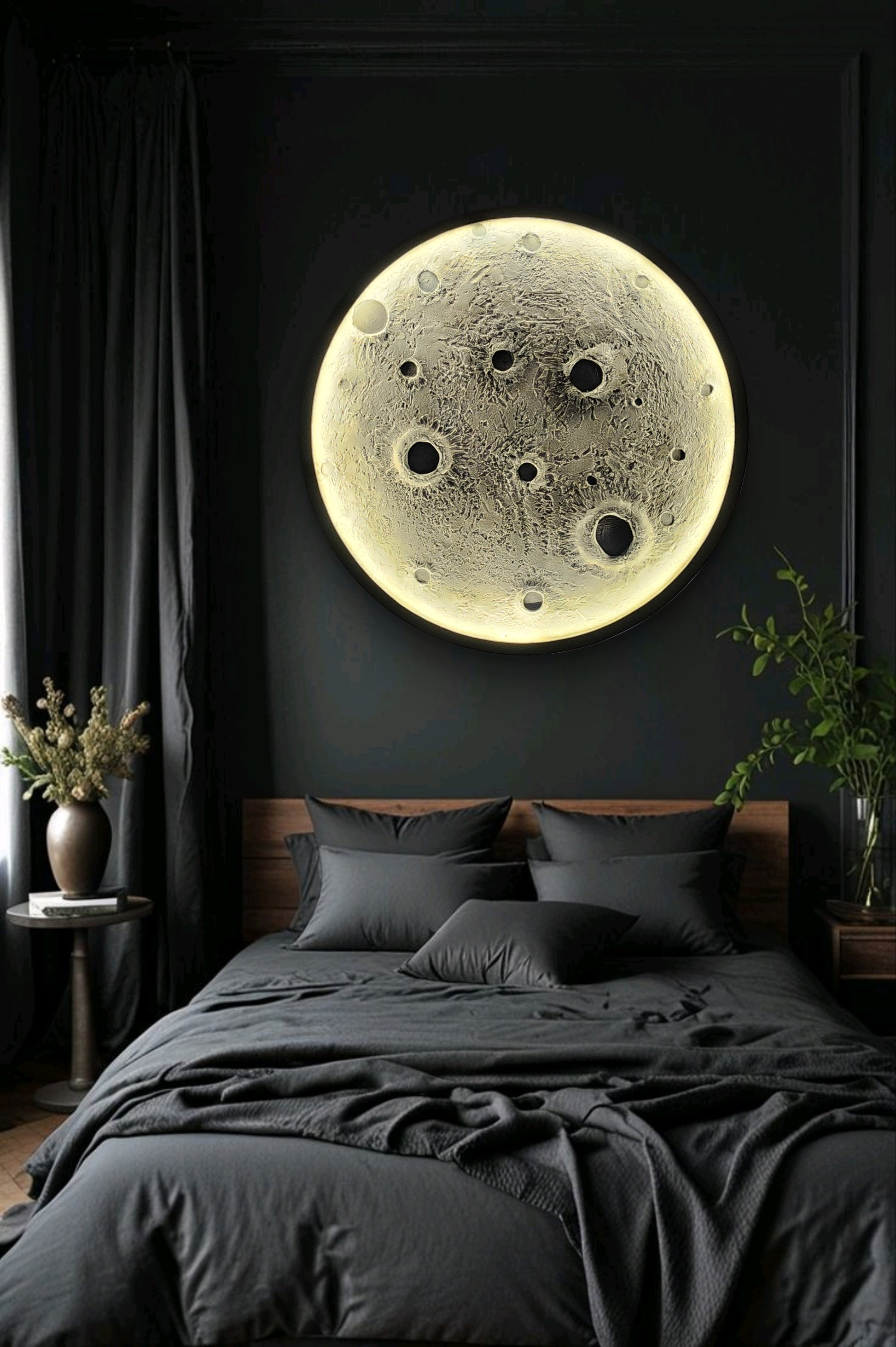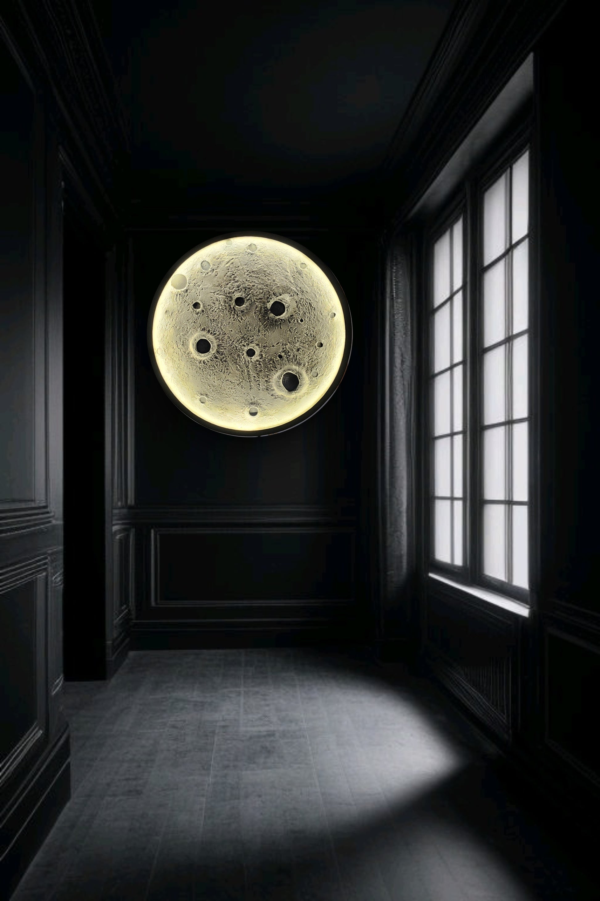 Un destello de luz nos envuelve cada noche, en medio de la obscuridad brilla para darnos una transformación y conexión emocional. Forma circular texturizada que evoca la superficie Lunar. La elección de luz, busca generar una atmósfera íntima invitando al espectador a detenerse, respirar y reconectar con sus emociones.