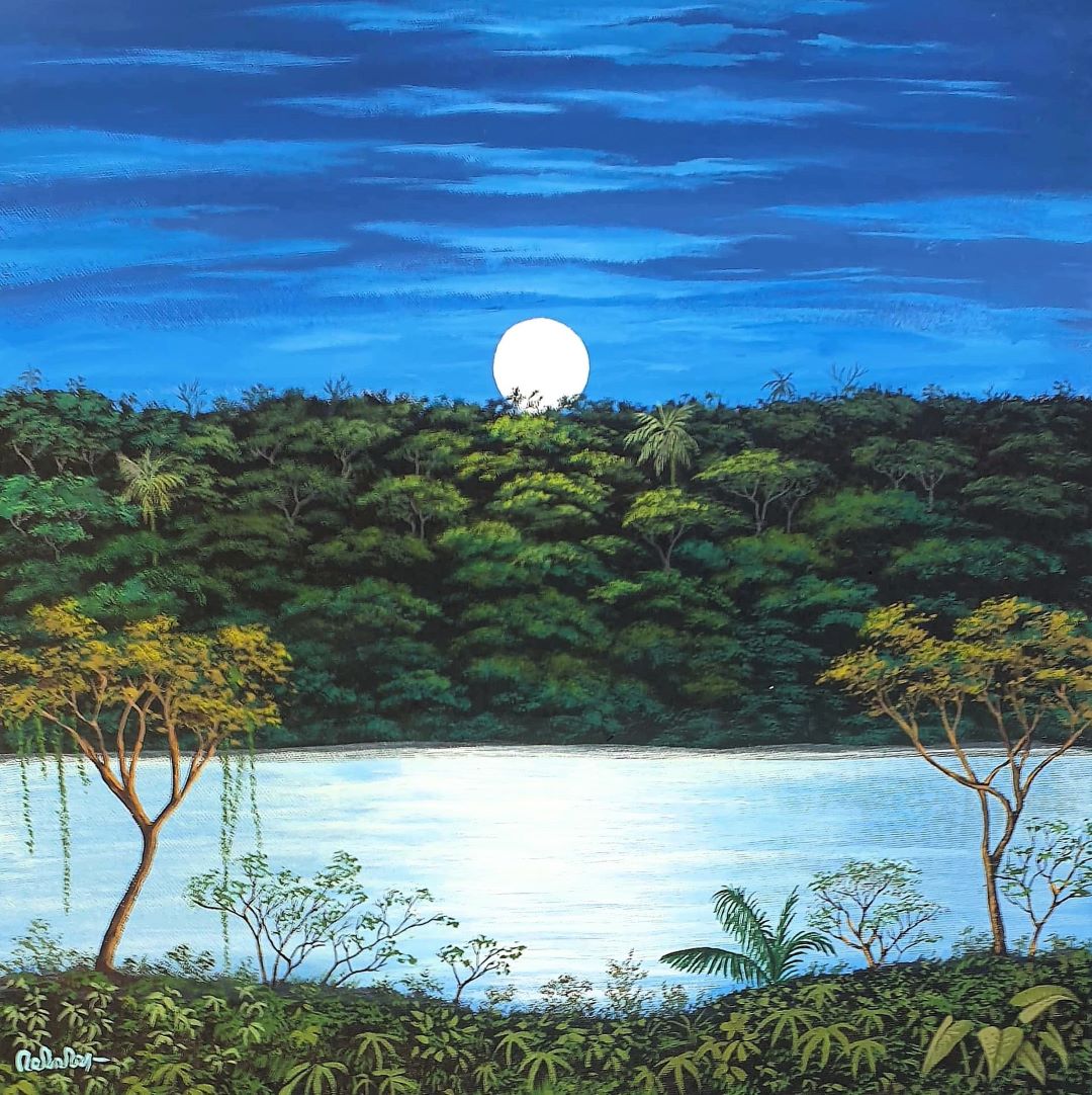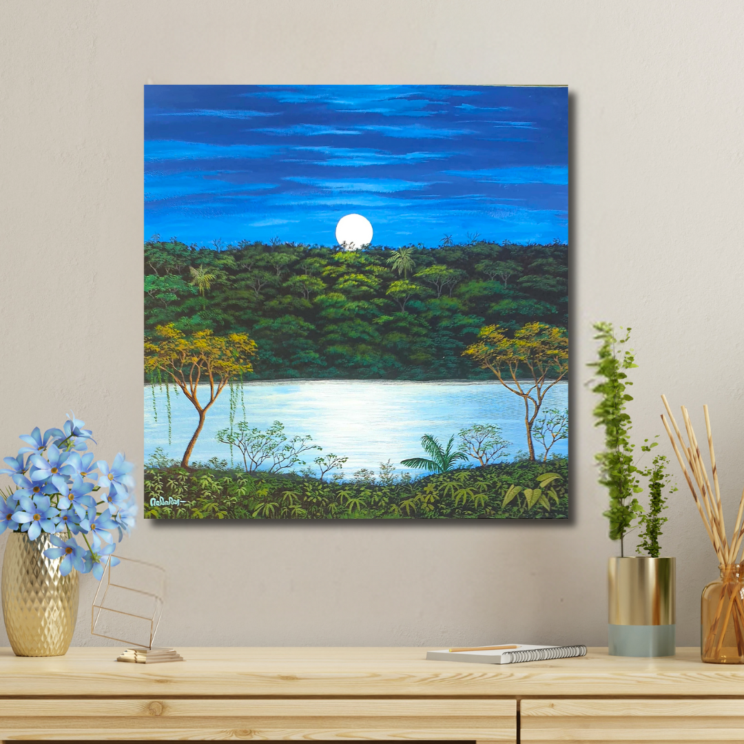 Paisaje de una serena luz de luna que captura la exuberante belleza de la naturaleza bajo un cielo nocturno hipnotizante, invitándo a experimentar un momento de pura calma.