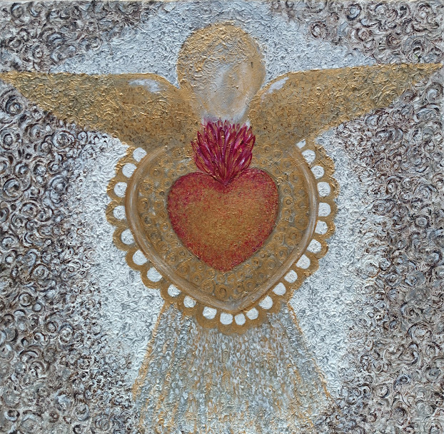 La textura juega un papel fundamental en esta pintura, con cada trazo y cada capa de color añadiendo profundidad y dimensión. Esta textura no solo es visual, sino que sugiere una calidad táctil, invitando al espectador a imaginar el relieve de cada detalle, desde los pliegues de las alas del ángel hasta los surcos en el corazón. Esta textura rica y palpable es un eco visual de los milagritos, esos pequeños objetos devocionales que, con su relieve y detalle, son testimonio de promesas y oraciones personales.
