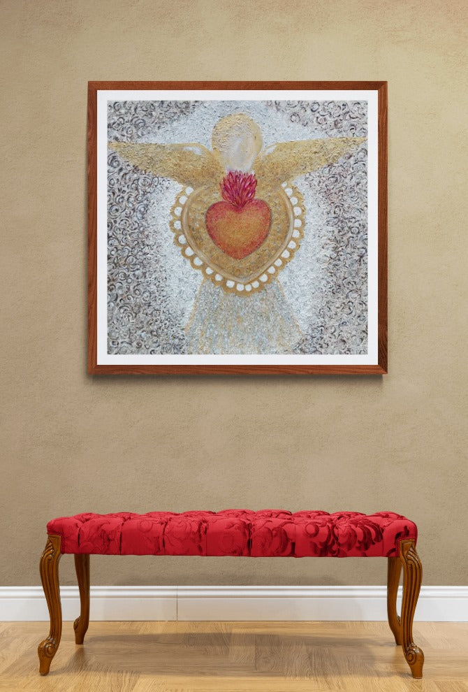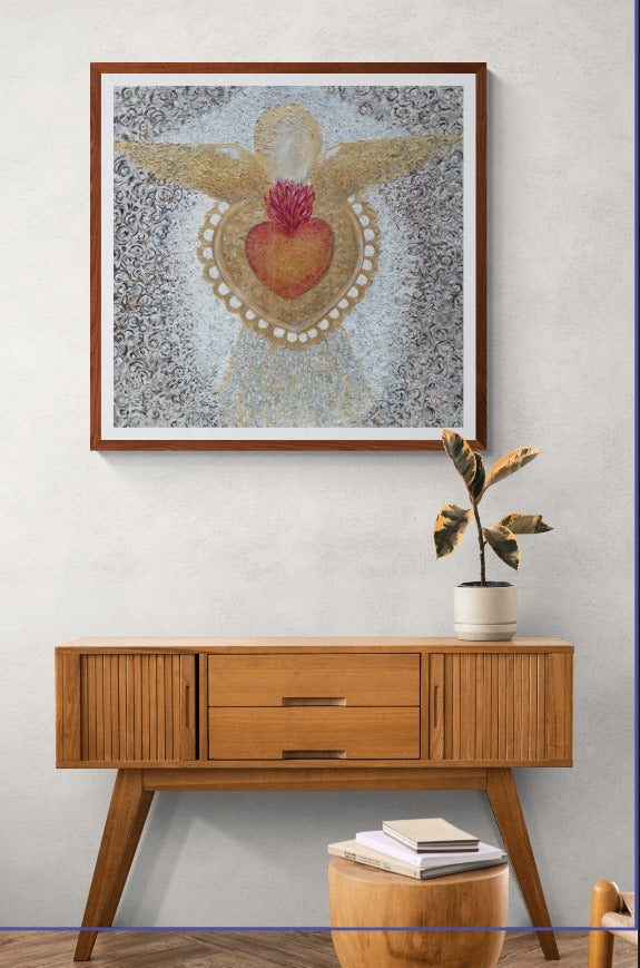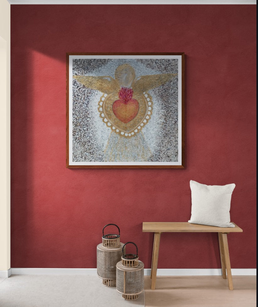 Encima del corazón, un ángel con majestuosas alas doradas se despliega, emanando una sensación de protección y trascendencia. El dorado de las alas no solo realza la figura del ángel, sino que también lo conecta directamente con el ámbito de lo sagrado, haciéndolo brillar con una luz que parece venir de otro mundo. La postura del ángel, con sus alas abiertas, sugiere un abrazo protector, un gesto que invita al espectador a sentir la presencia de lo divino en un acto de consuelo y amparo.
