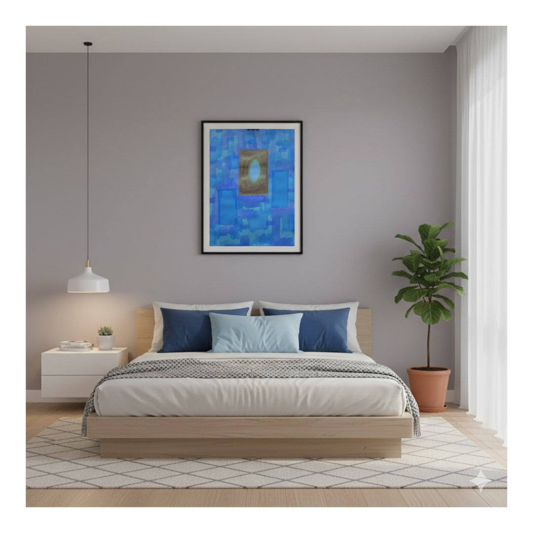 Esta pintura acrílica abstracta evoca una sensación de calma y espiritualidad. La luz representa el refugio como fuente interna de sanación, mientras los colores oscuros alrededor evocan la introspección. La interacción entre campos de color es vibración emocional, y se experimenta más que se interpreta.